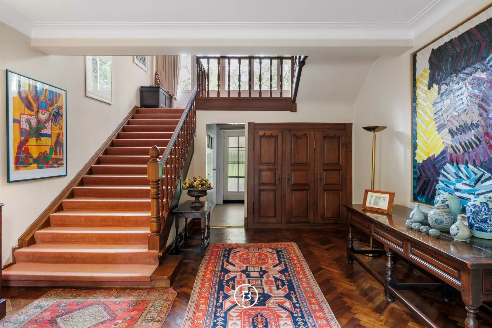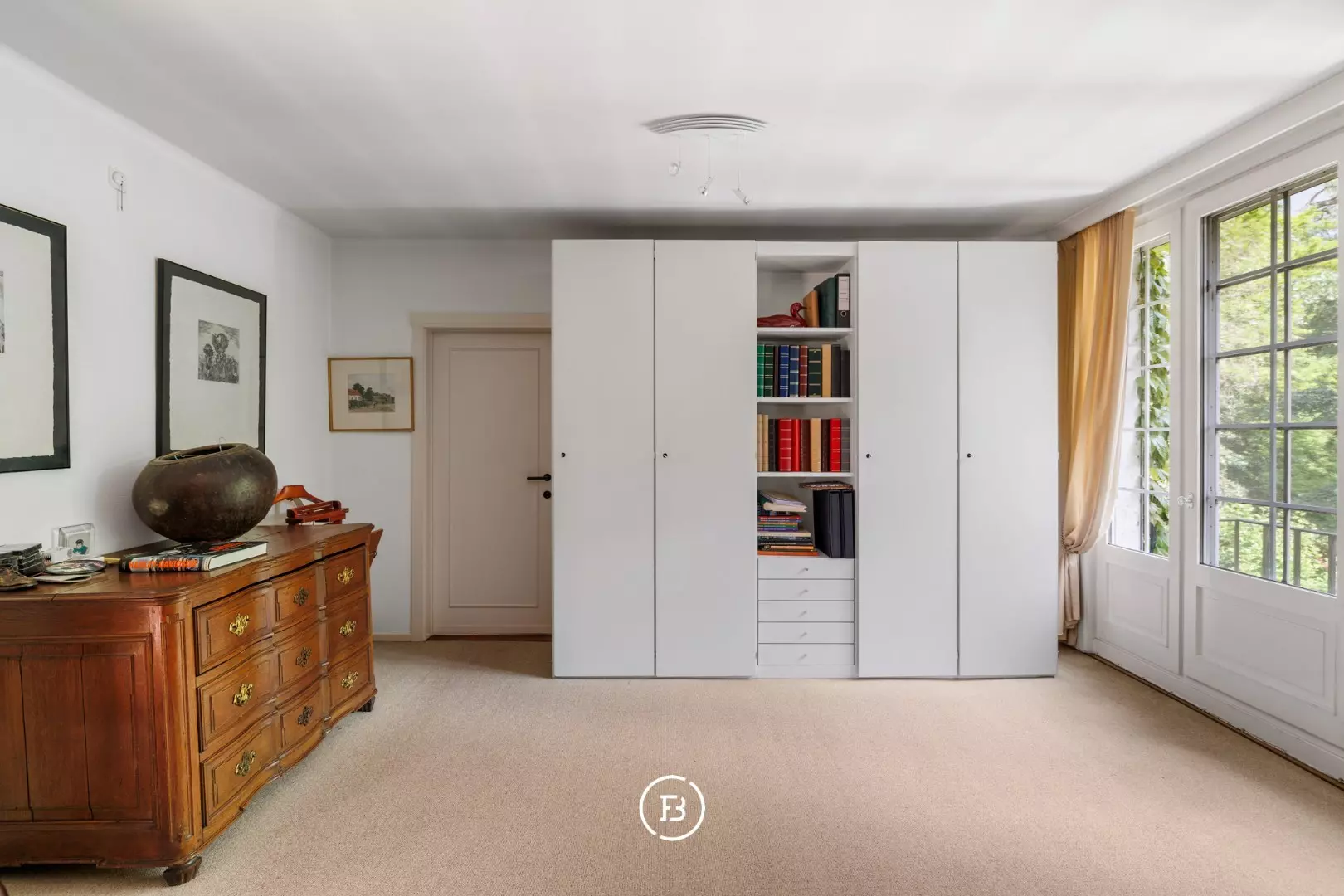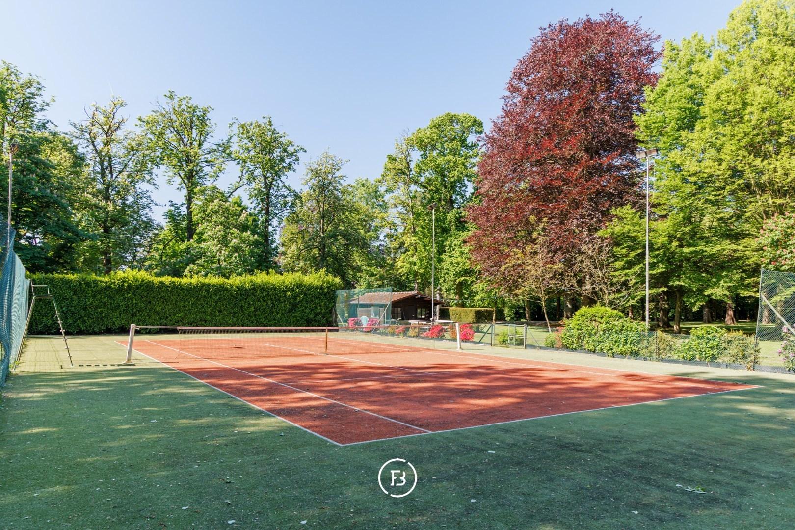 The approximately 2.6 hectare estate is laid out as a picturesque park with water features, walking paths, and a meadow ideal for horse enthusiasts. The property further includes a tennis court, a greenhouse, and a garage complex.