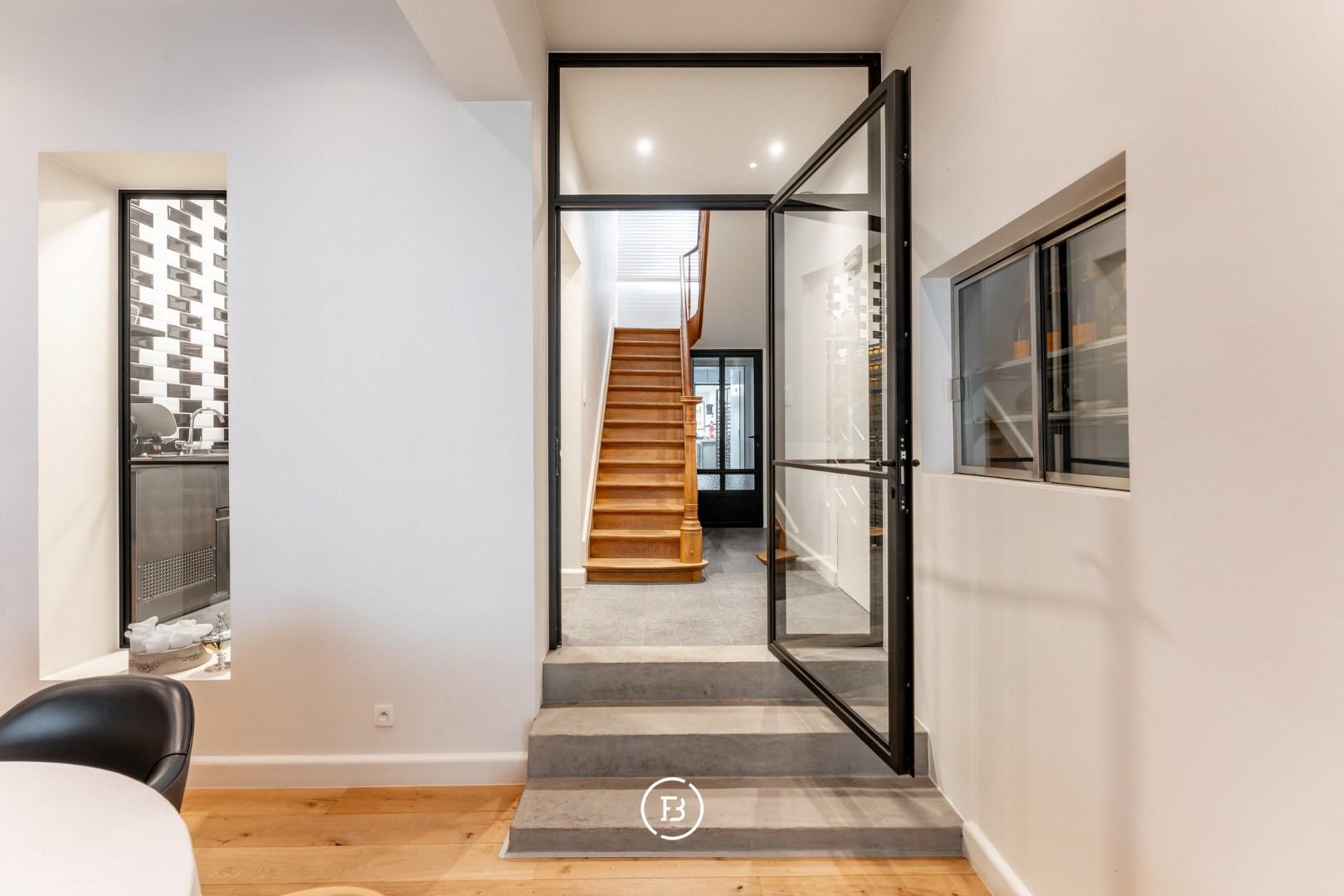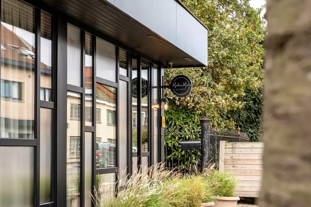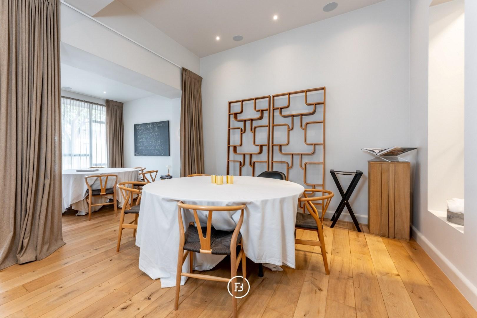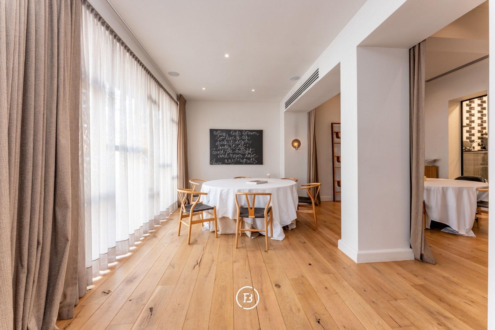 Upon entering the ground floor, you are welcomed by a cozy, light-filled space. The stylish finishing and high-quality materials create a luxurious atmosphere. At the back, there is a spacious living room and kitchen, currently set up as a professional kitchen. The photos are for illustration purposes to showcase the possibilities. The large windows provide ample natural light.