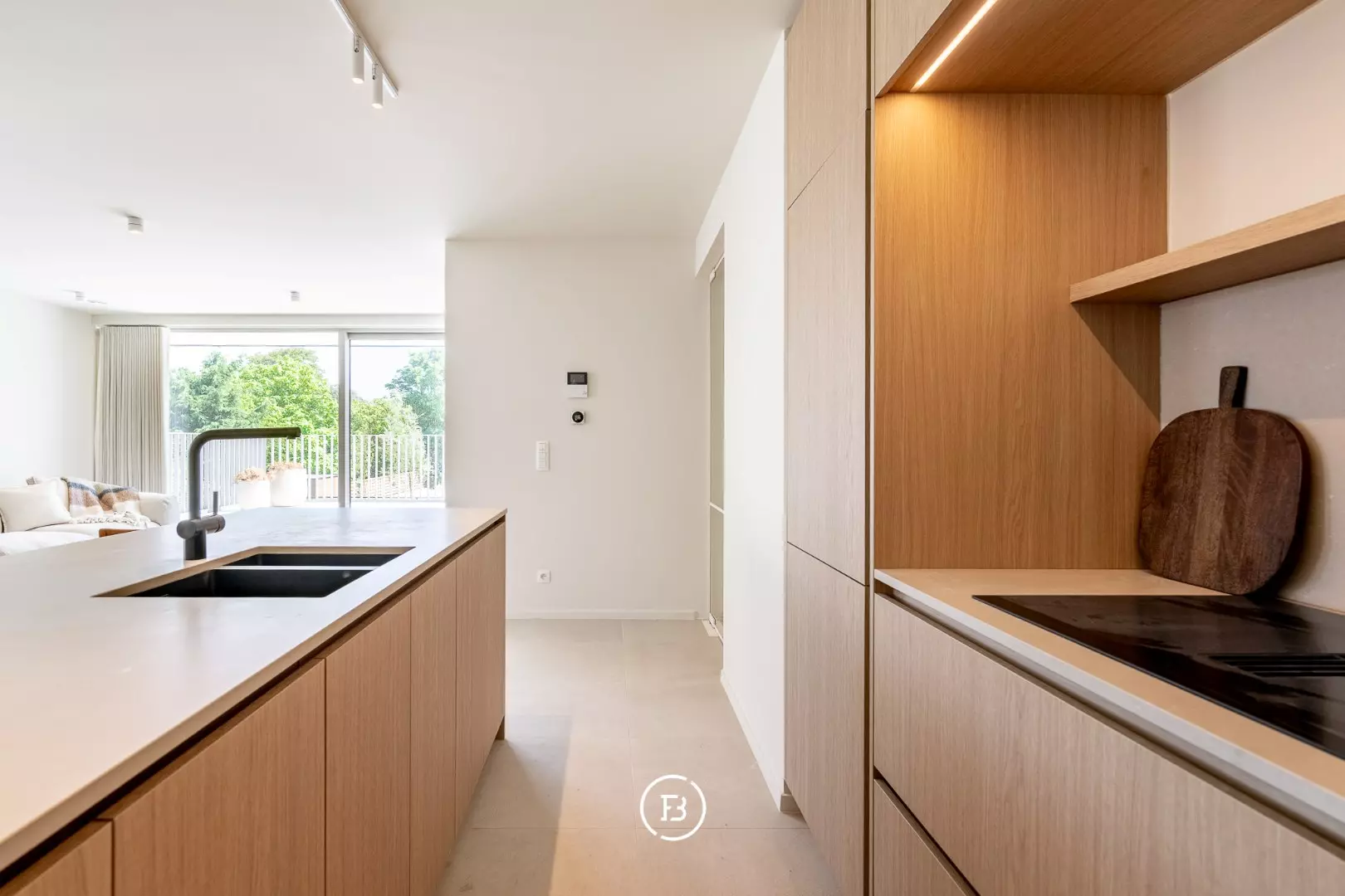 L'appartement est situé au rez-de-chaussée et a été aménagé comme suit : hall d'entrée avec toilettes invités et débarras, espace de vie lumineux avec cuisine ouverte, deux chambres, une salle de bains et une terrasse orientée sud-ouest avec jardin attenant.