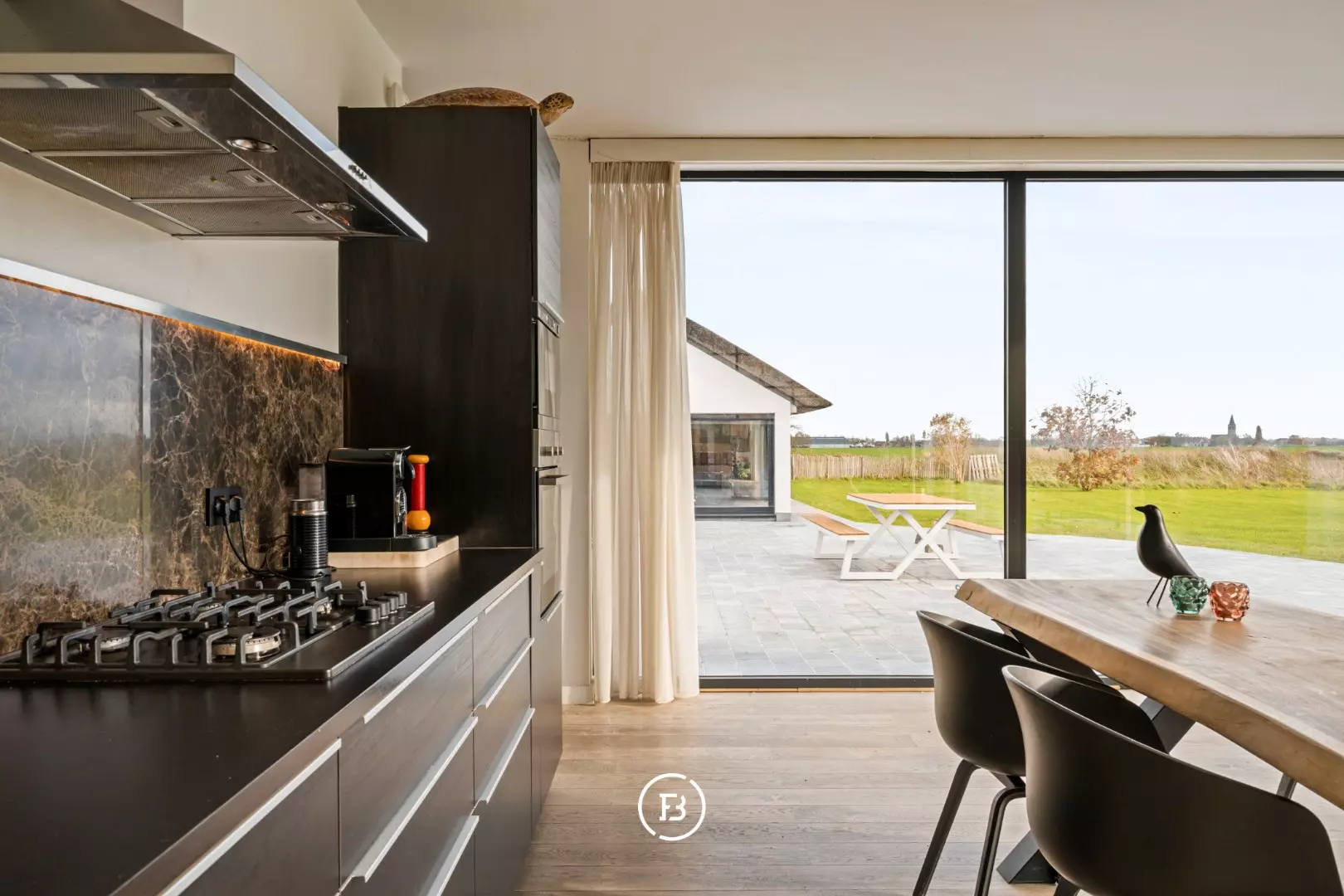 Avec une surface habitable de 309 m², la maison offre une agréable sensation d’espace, combinée à une finition calme et intemporelle qui procure immédiatement un véritable sentiment de chez-soi. De grandes fenêtres laissent entrer le paysage environnant partout, rendant les vues dégagées constamment présentes dans la vie quotidienne.