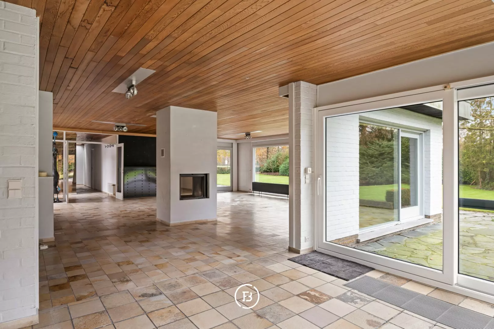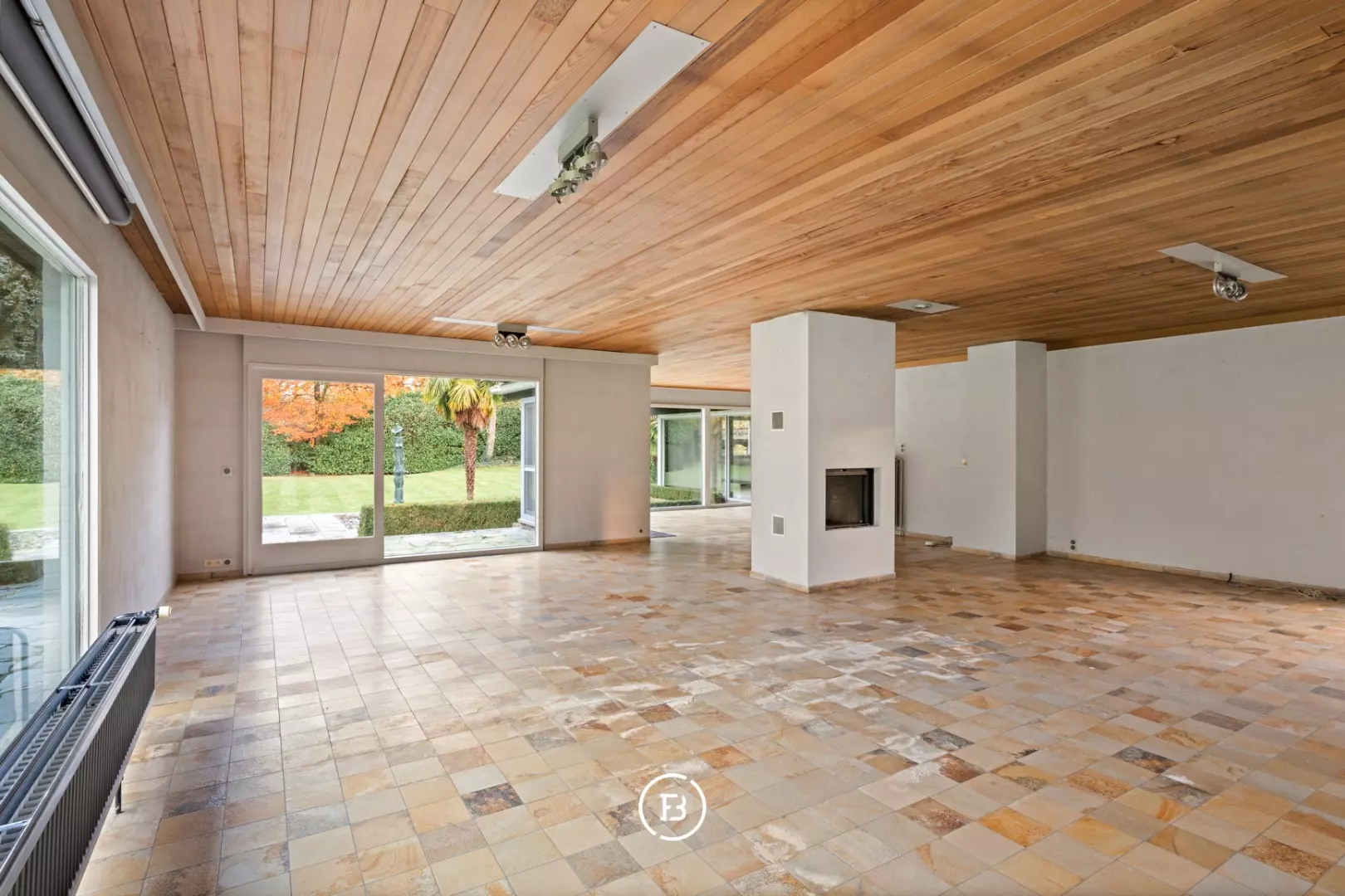 Hall d'entrée lumineux qui invite vers un salon très spacieux avec cheminée centrale, une grande cuisine (de vie), un débarras, 4 chambres, une salle de bains et un double garage intégré.