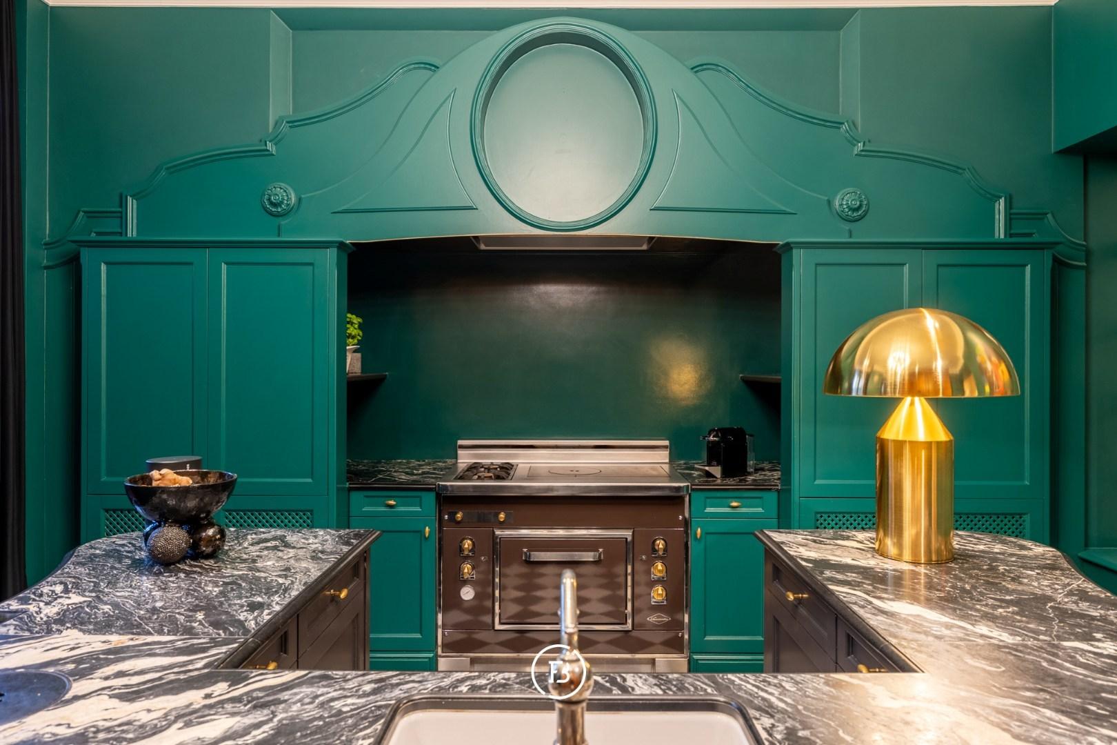 De volledig geïnstalleerde keuken met ontbijthoek vormt het kloppend hart van de woning en geeft uit op het zuidoost gerichte terras met uitzicht op de binnentuin en de historische Handelsbeurs, een oase van rust midden in de stad.