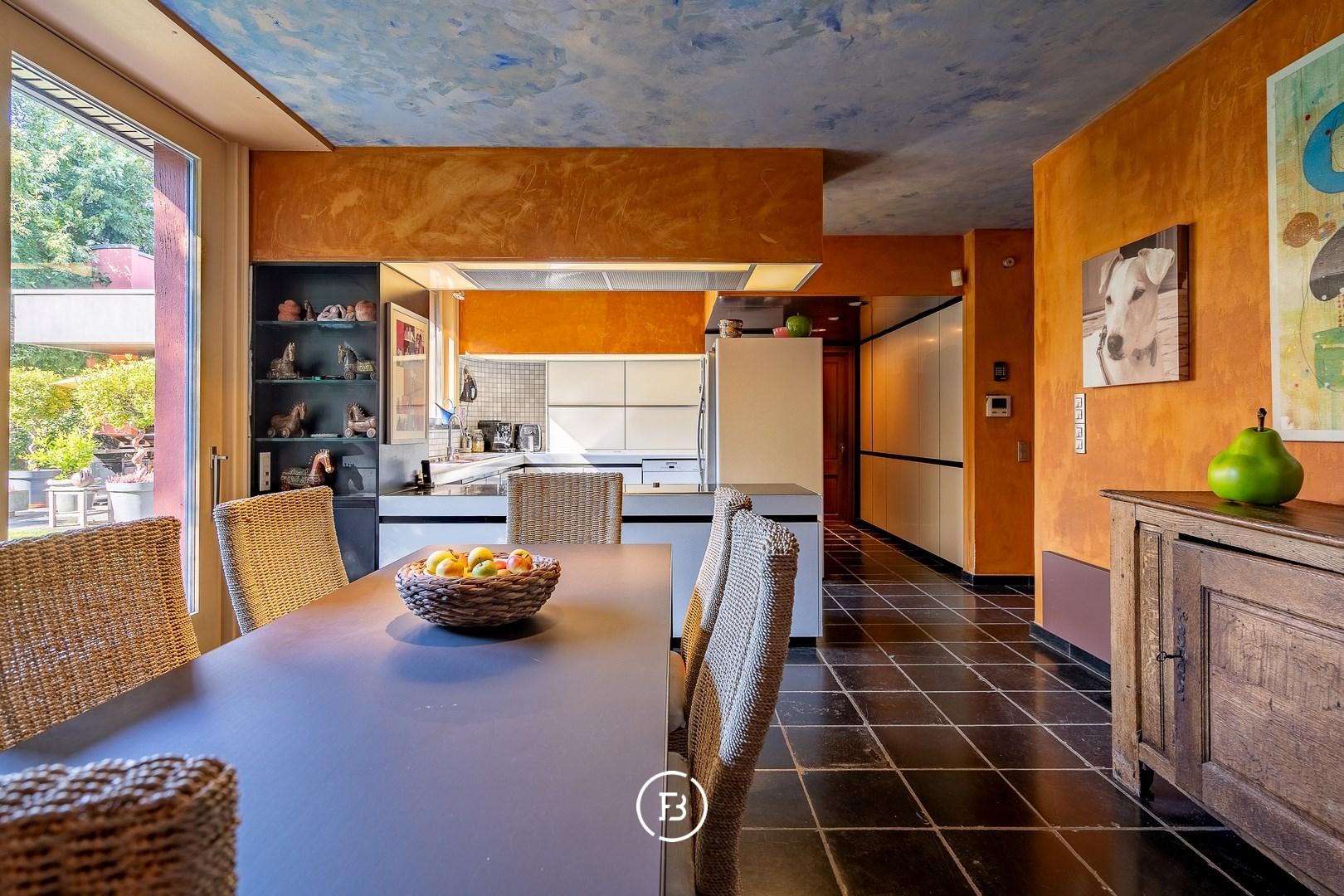 Centraal in de woning bevindt zich de keuken, met berging en koelcel, die geniet van een mooi zicht over de tuin. Aansluitend is er de eetplaats met woonkamer die toegang biedt aan het terras.