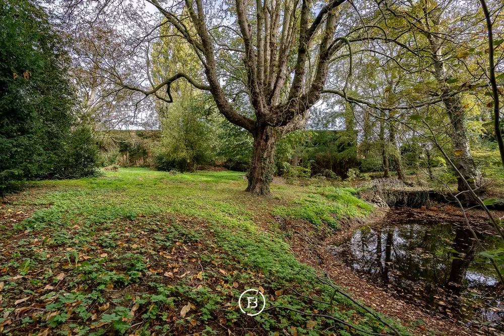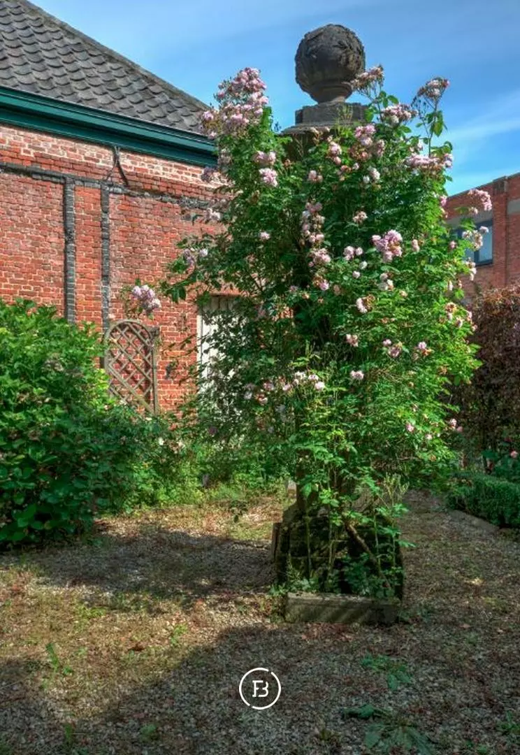 Via de voormalige koetsdoorgang komt men uit op een prachtige binnenkoer die toegang biedt tot de vroegere paardenstallen. Daarnaast zijn er twee garageplaatsen voorzien. De grootste troef van het pand is de enorme parktuin met vijver en antiek zwembad dat achter het pand verscholen zit. Zodra u de grote toegangspoort sluit kunt u heerlijk genieten van natuur en rust, doch is de woning centrum-gelegen.