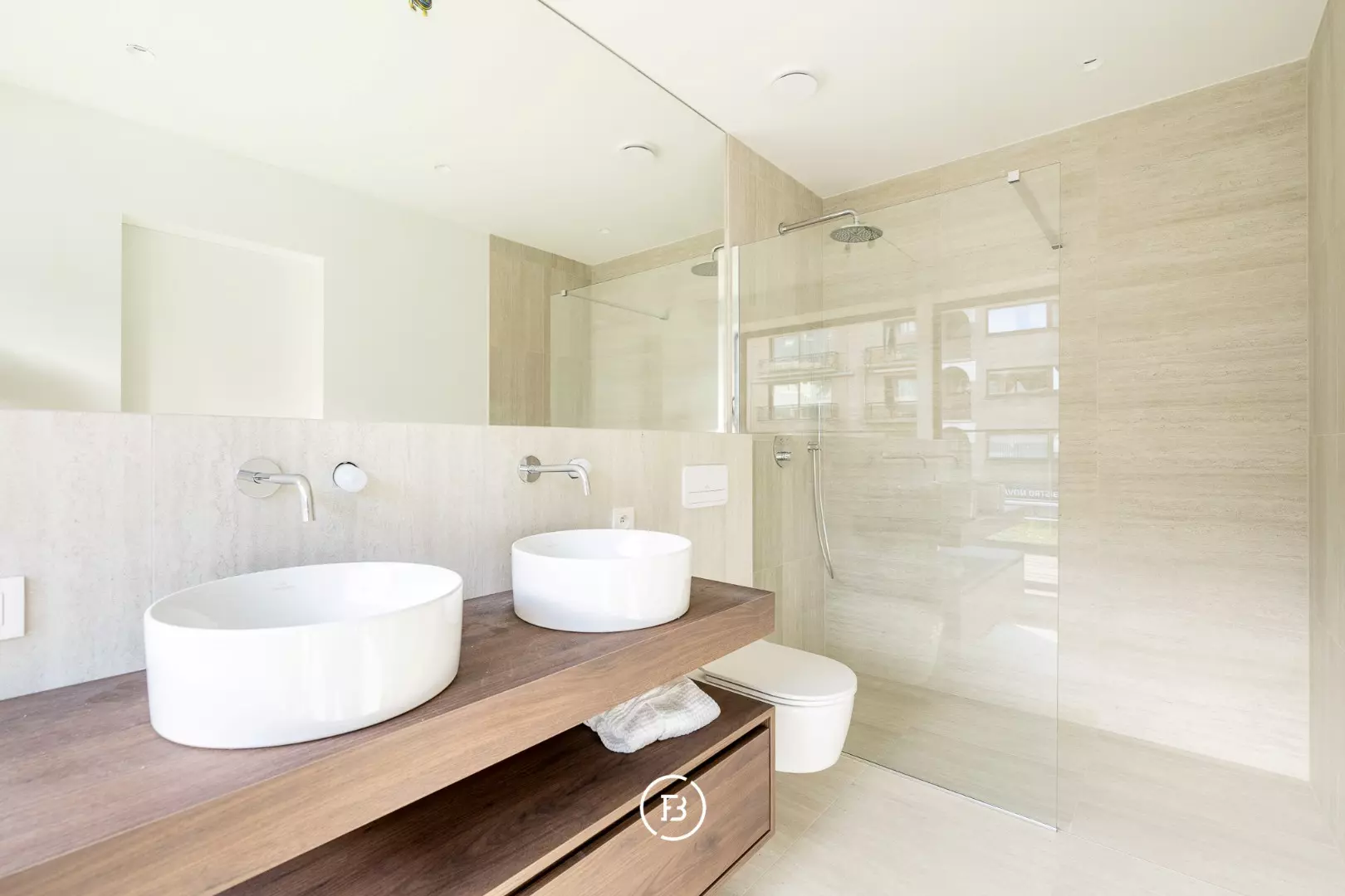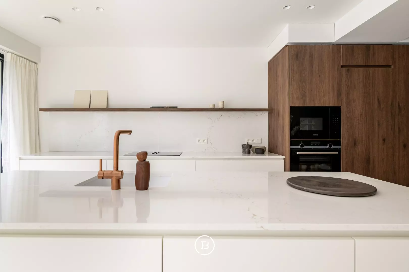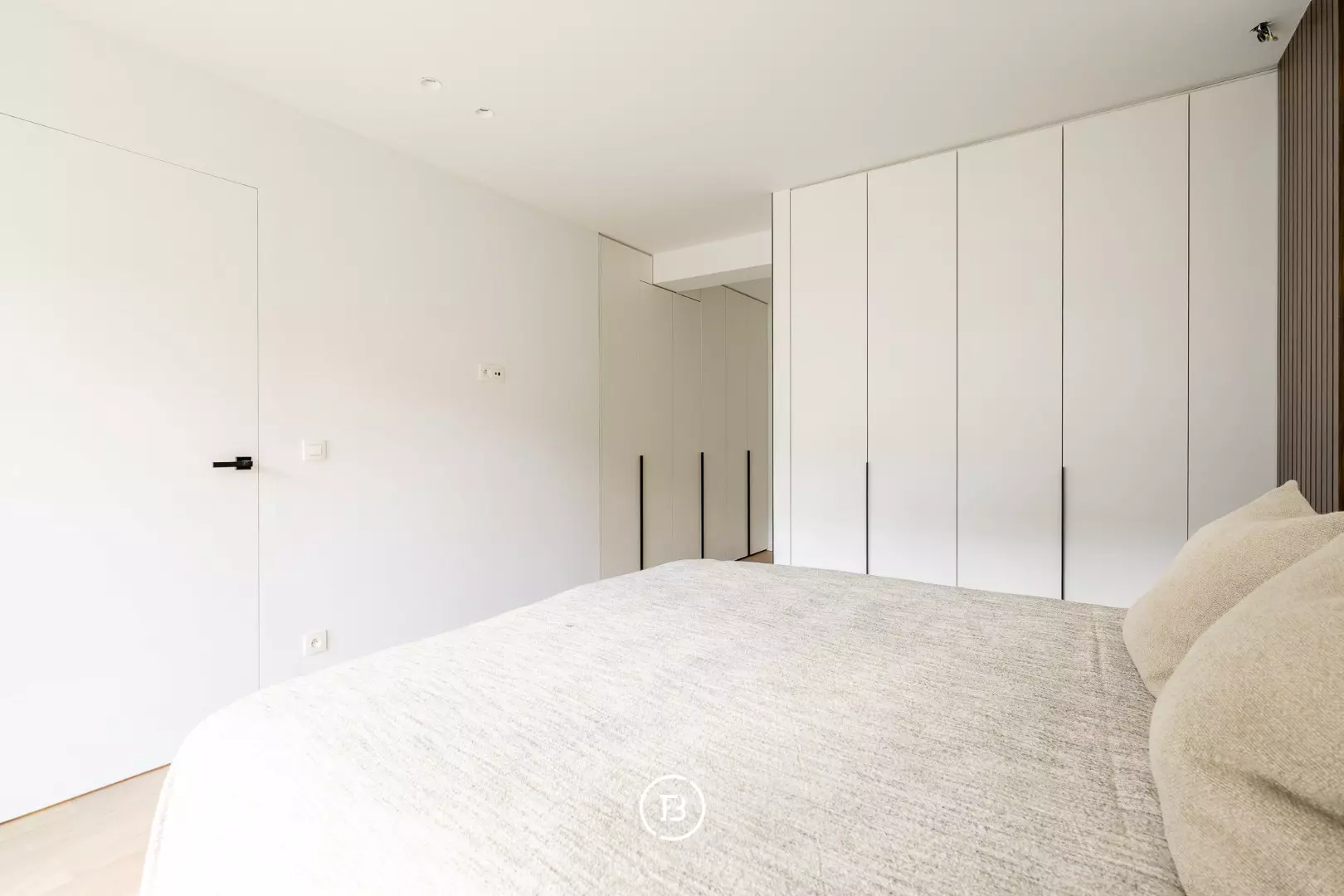 Het appartement, gelegen op de eerste verdieping, heeft een bewoonbare oppervlakte van 135 m² en is volledig instapklaar. Het beschikt over een ruime inkomhal met vestiaire, een lichtrijke leefruimte met een sublieme open keuken, twee slaapkamers, twee badkamers, een grote berging en een praktische bureauruimte. Overal zijn ingemaakte kasten voorzien, en de vloer is afgewerkt met hoogwaardige parket, wat bijdraagt aan de warme uitstraling van het geheel.