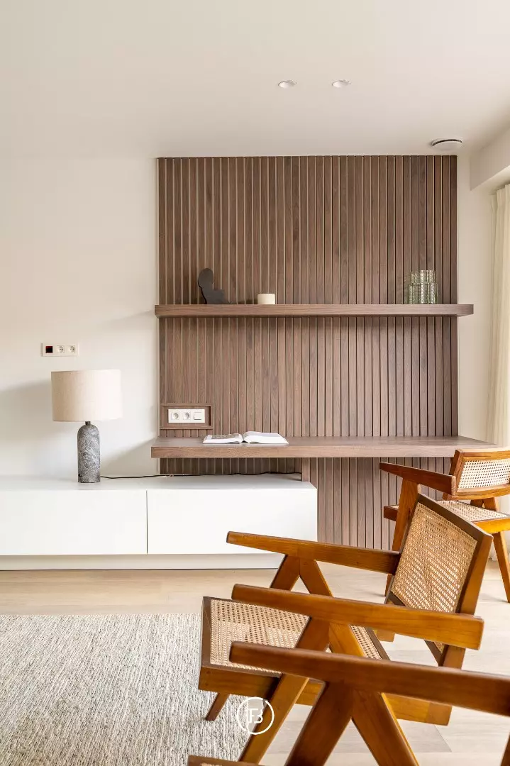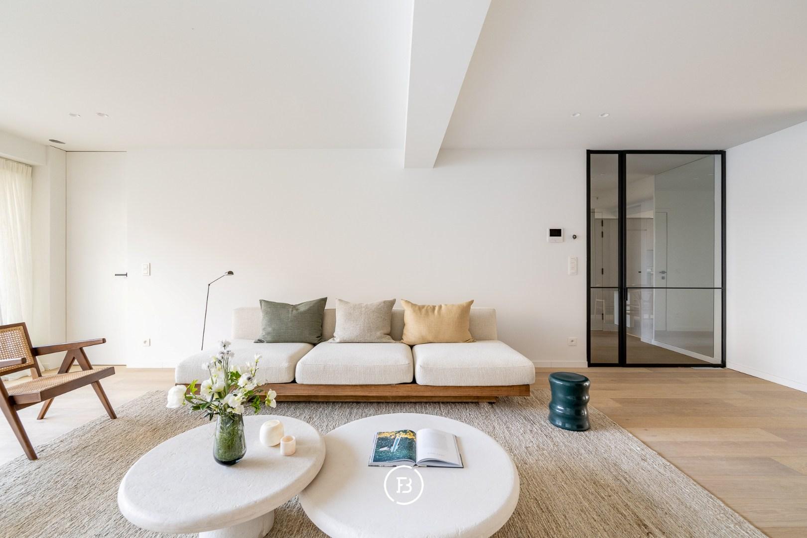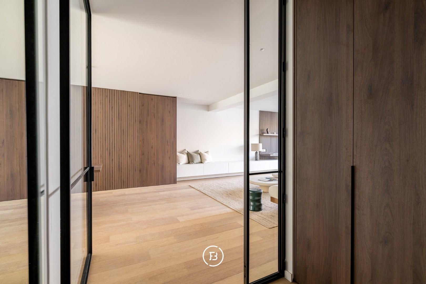 Het appartement, gelegen op de eerste verdieping, heeft een bewoonbare oppervlakte van 135 m² en is volledig instapklaar. Het beschikt over een ruime inkomhal met vestiaire, een lichtrijke leefruimte met een sublieme open keuken, twee slaapkamers, twee badkamers, een grote berging en een praktische bureauruimte. Overal zijn ingemaakte kasten voorzien, en de vloer is afgewerkt met hoogwaardige parket, wat bijdraagt aan de warme uitstraling van het geheel.