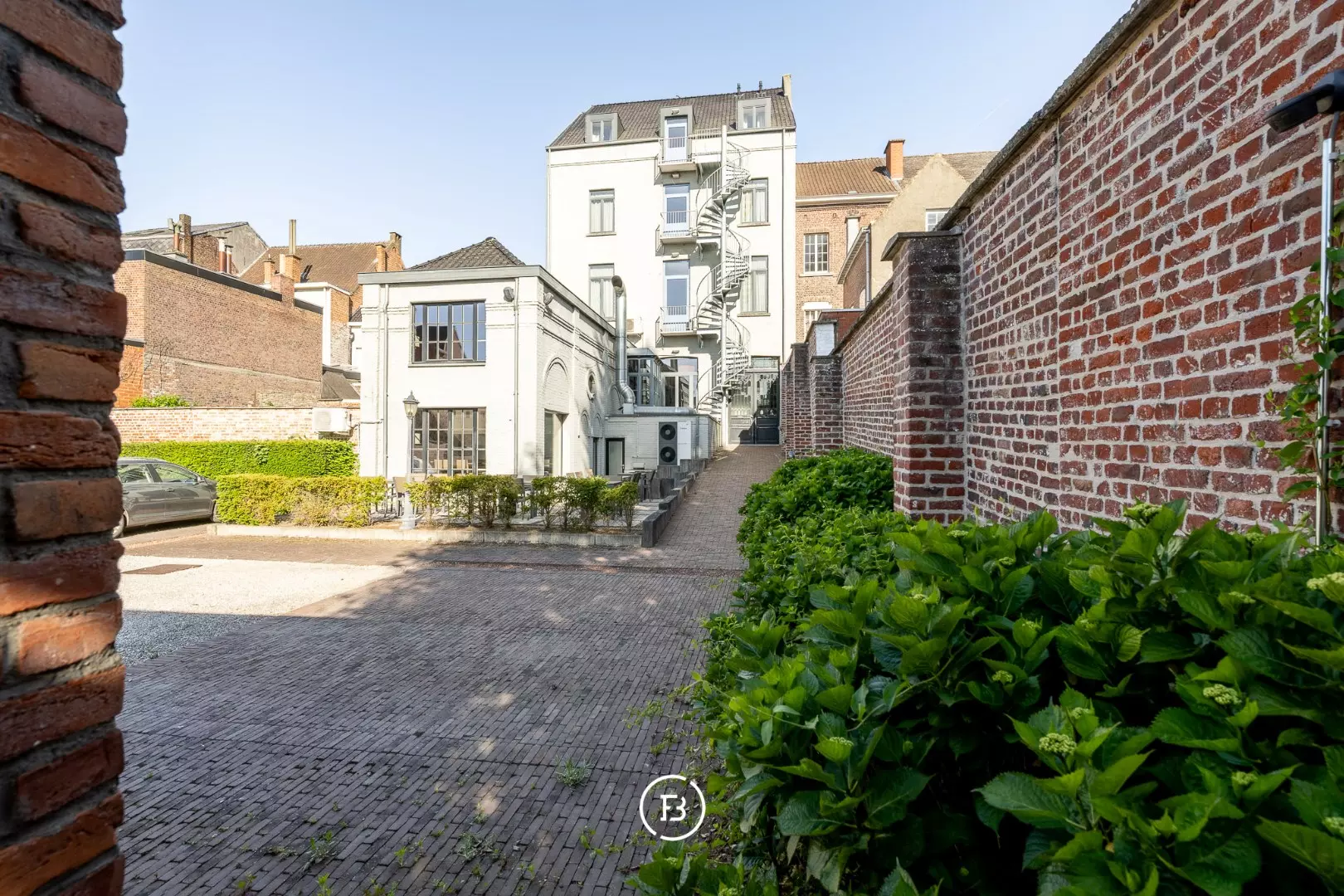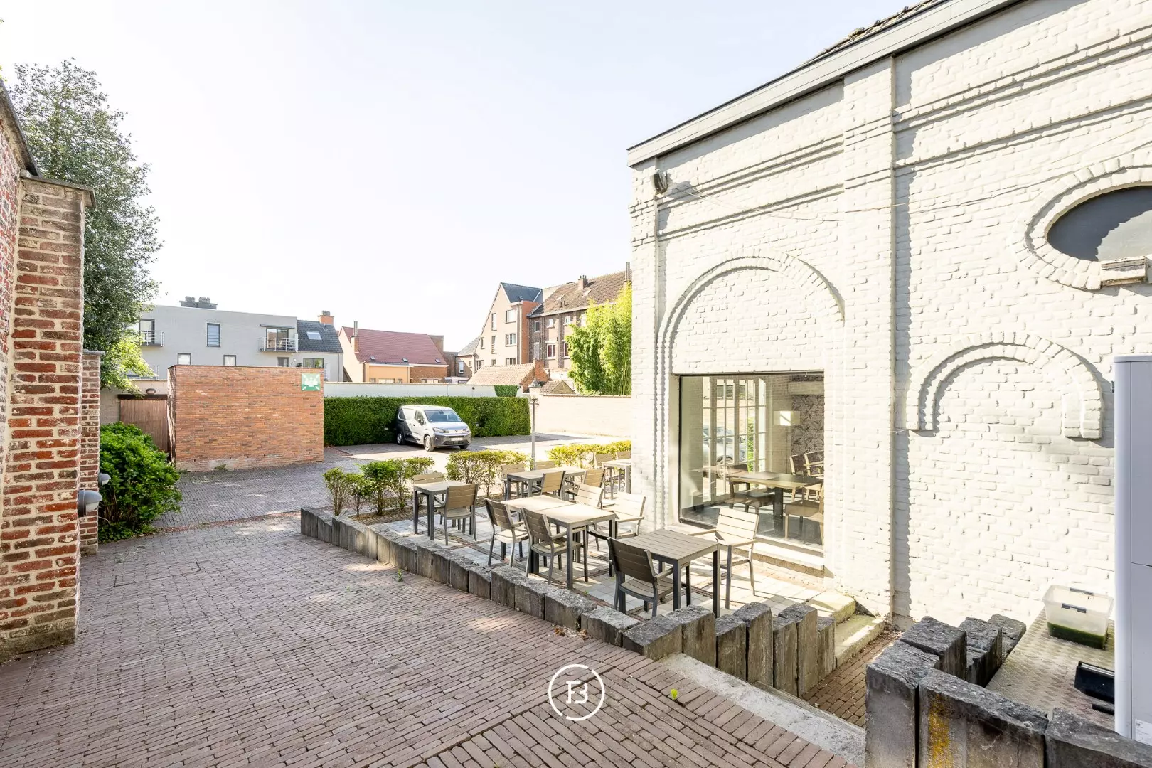 Achteraan het pand ontdekken we een uitnodigend terras, een binnenkoer met parkeergelegenheid voor zeven wagens en een praktisch bijgebouw.