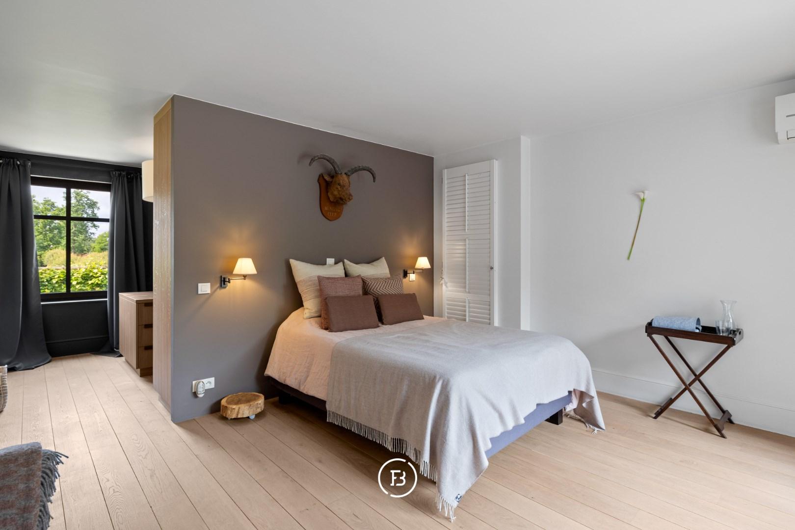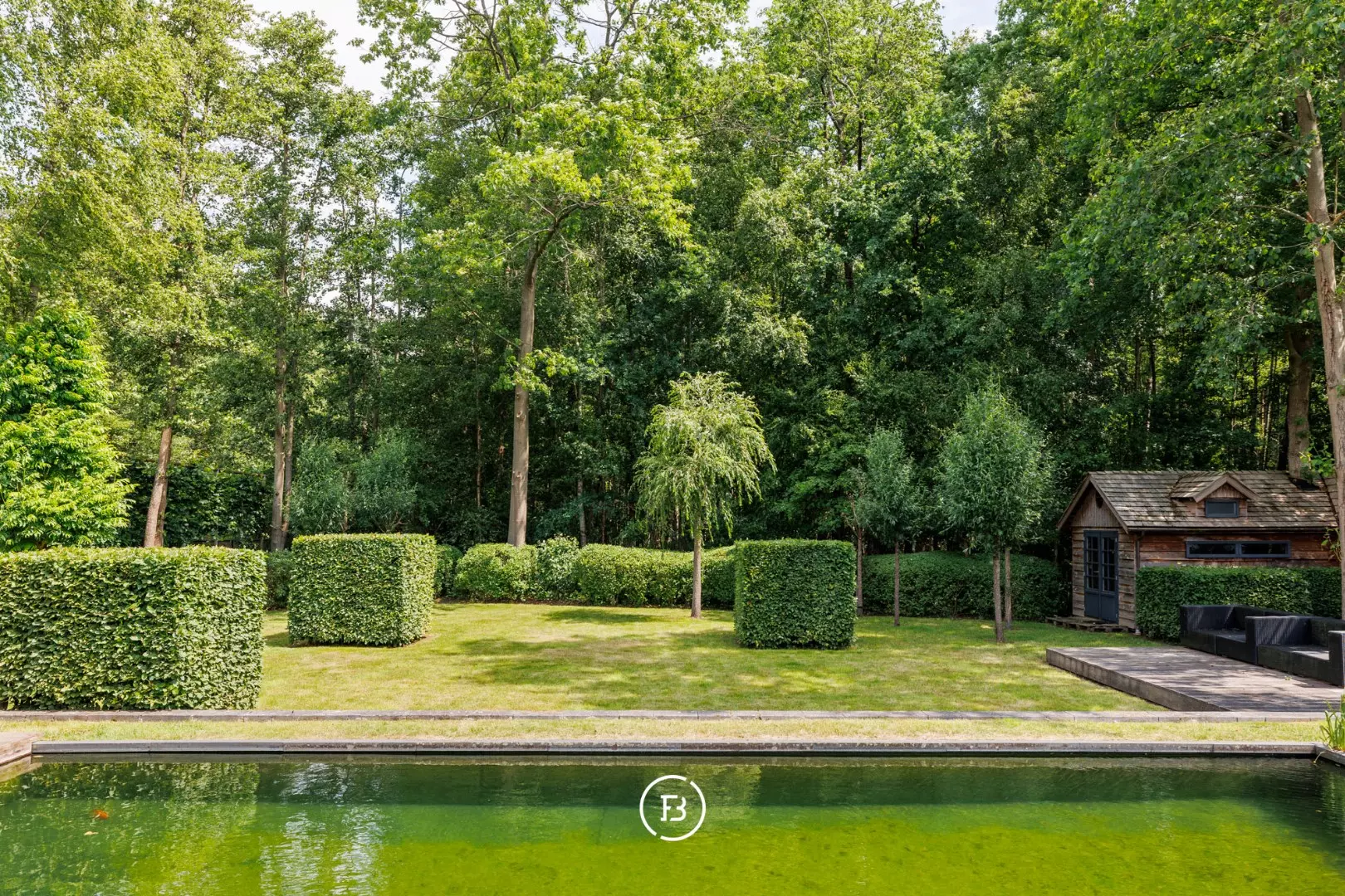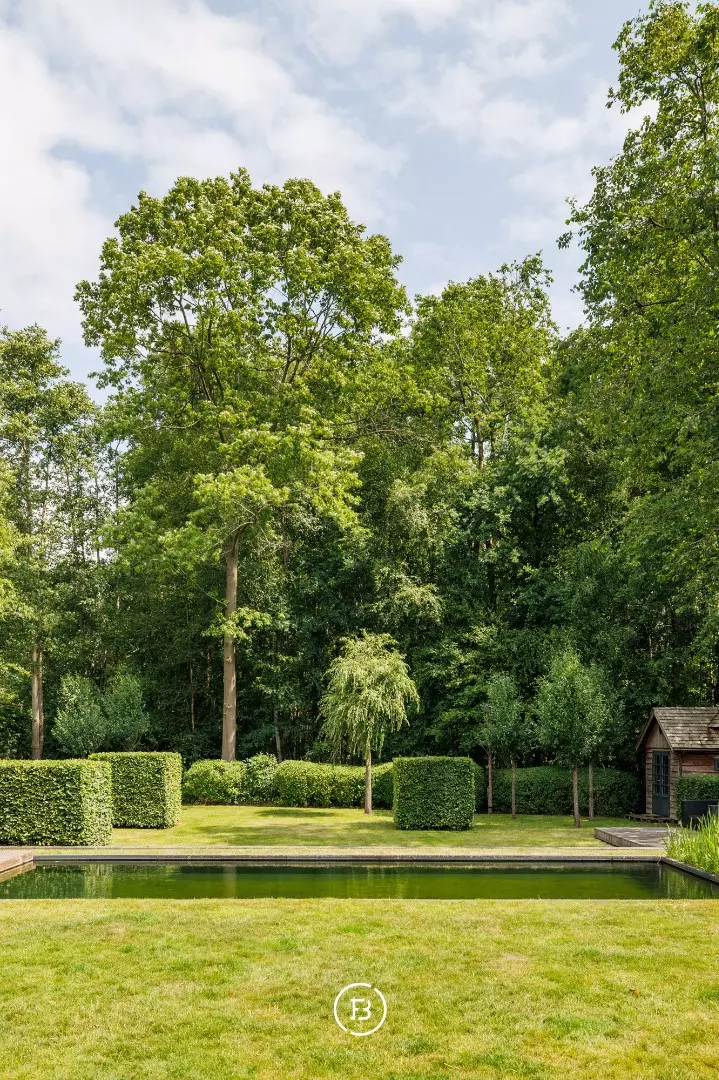 De buitenruimte is aangenaam en groen ingericht, met een verzorgd terras waar u in alle rust kunt genieten. Het poolhouse biedt extra comfort dankzij een open haard, infraroodverwarming, buitendouche, handenwasser en toilet. Een natuurlijke zwemvijver sluit mooi aan bij het geheel en versterkt het ontspannen karakter van de tuin.