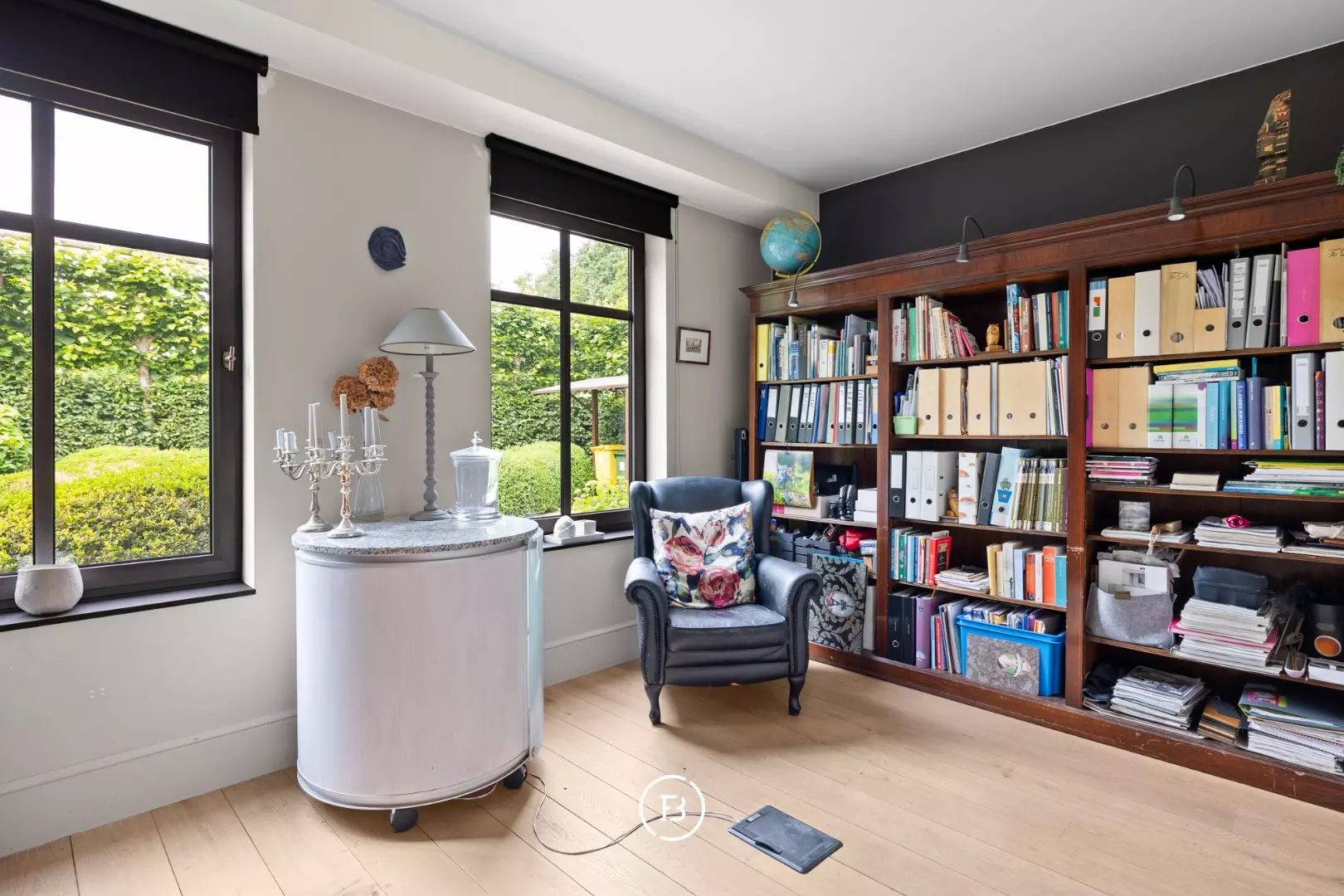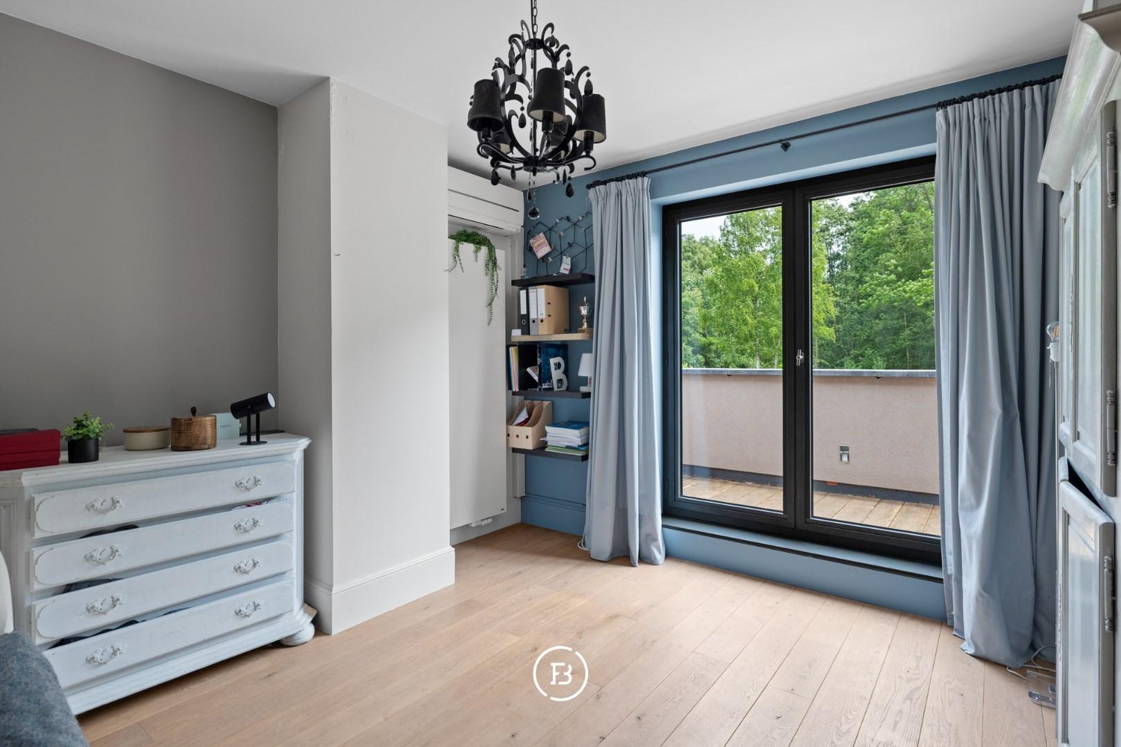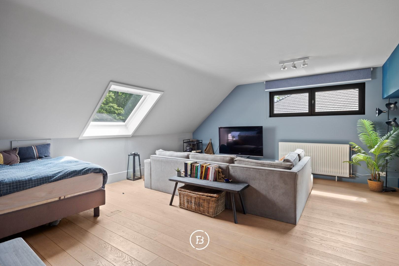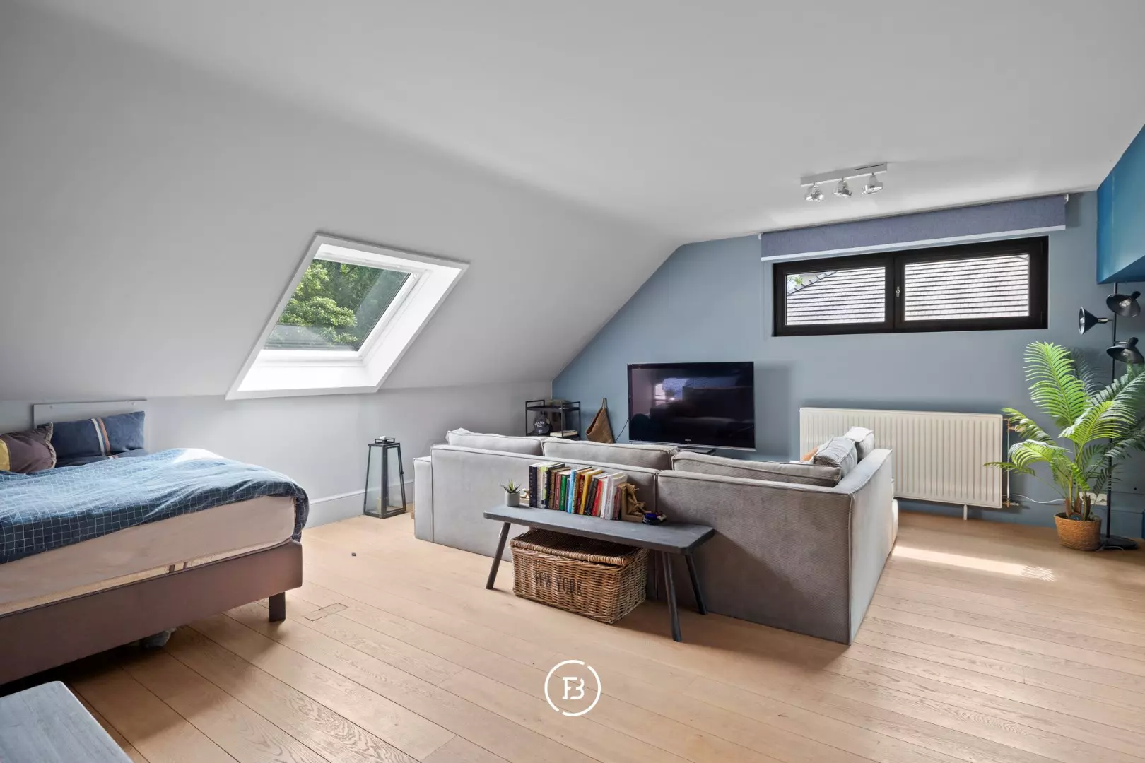 De tweede verdieping biedt een polyvalente ruimte, perfect als hobby- of ontspanningsruimte, met airco en toegang tot een dakterras dat uitkijkt over de groene tuin.
