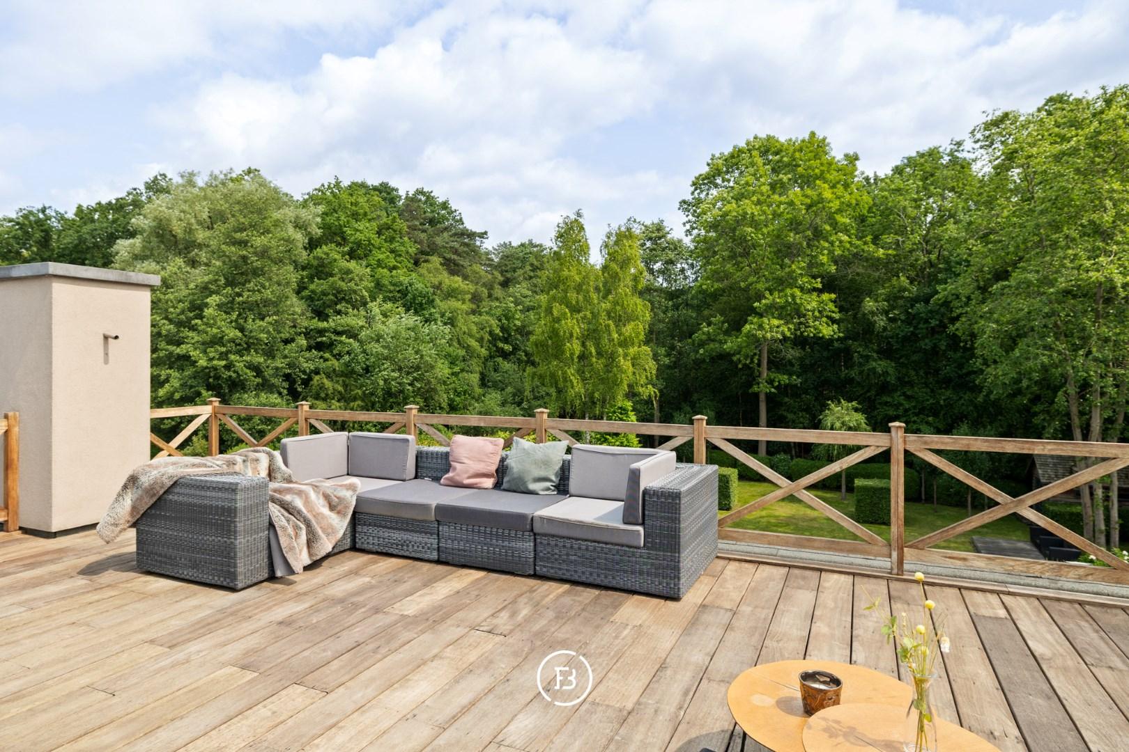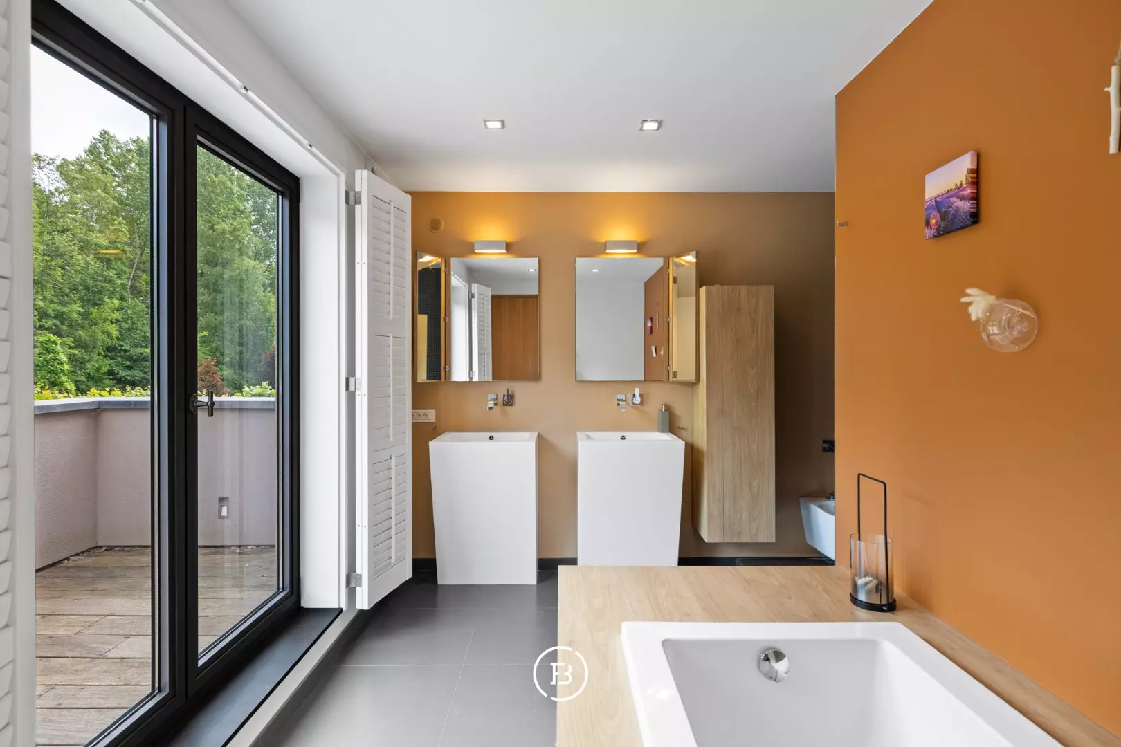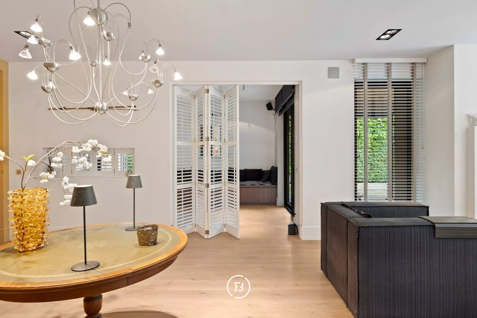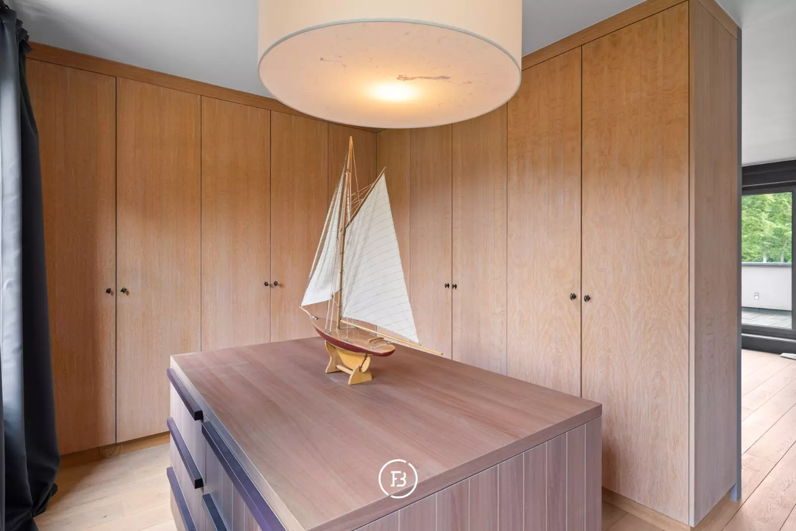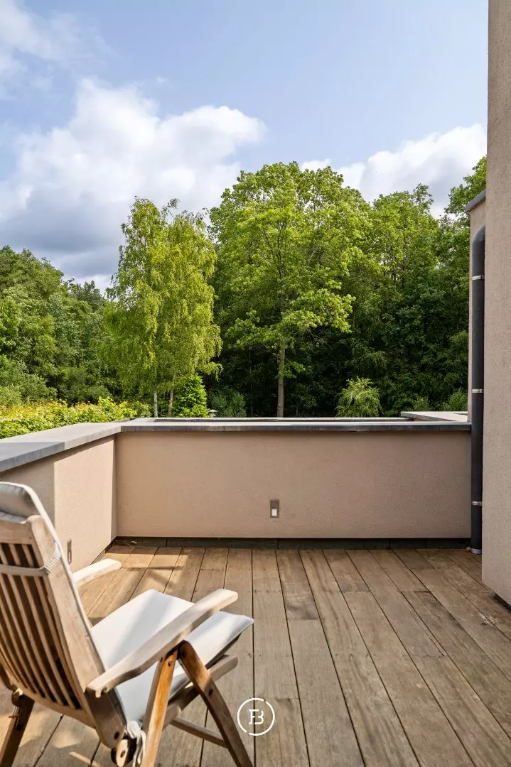 De tweede verdieping biedt een polyvalente ruimte, perfect als hobby- of ontspanningsruimte, met airco en toegang tot een dakterras dat uitkijkt over de groene tuin.