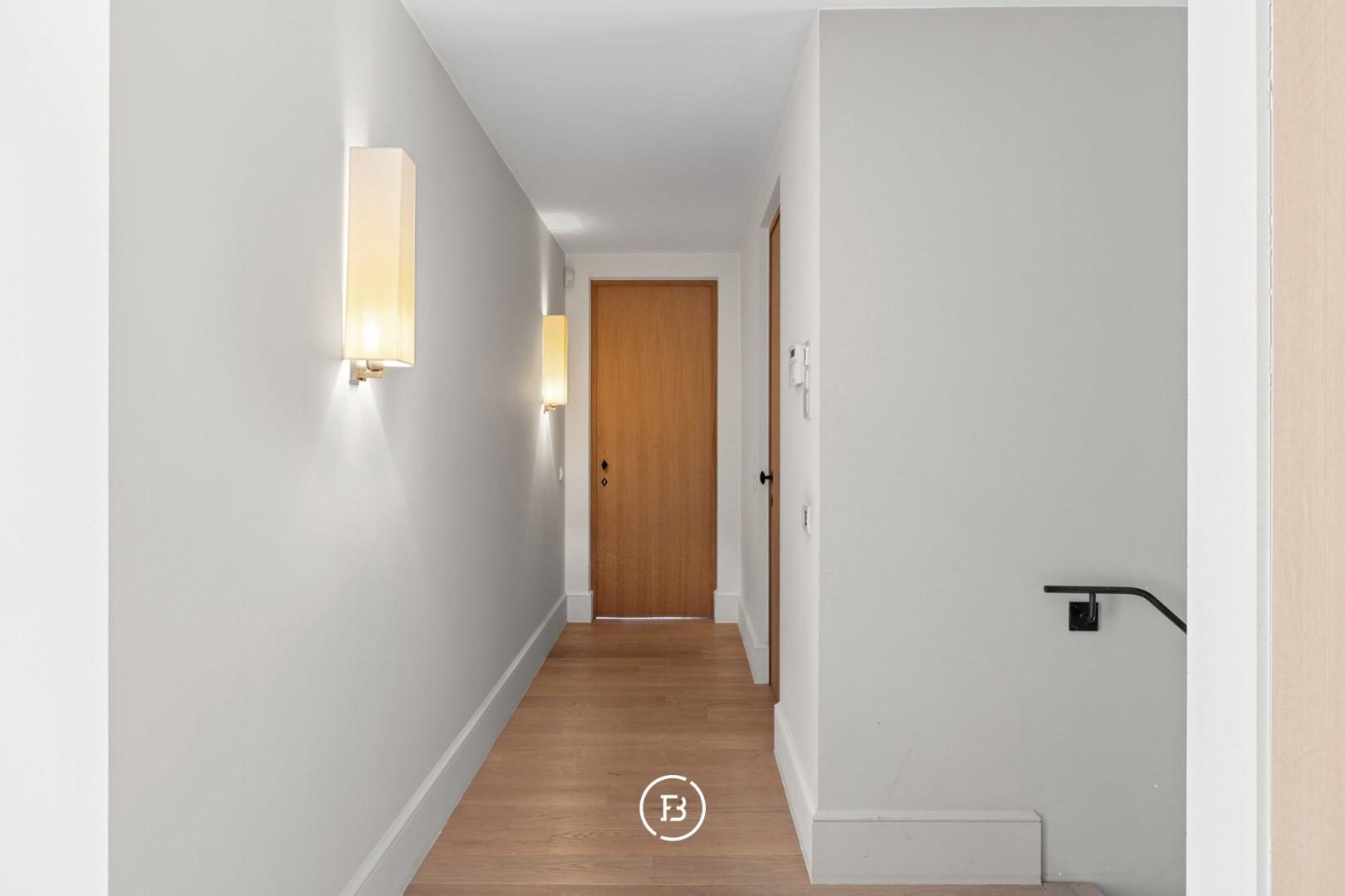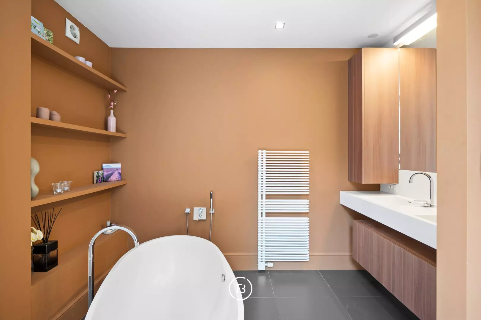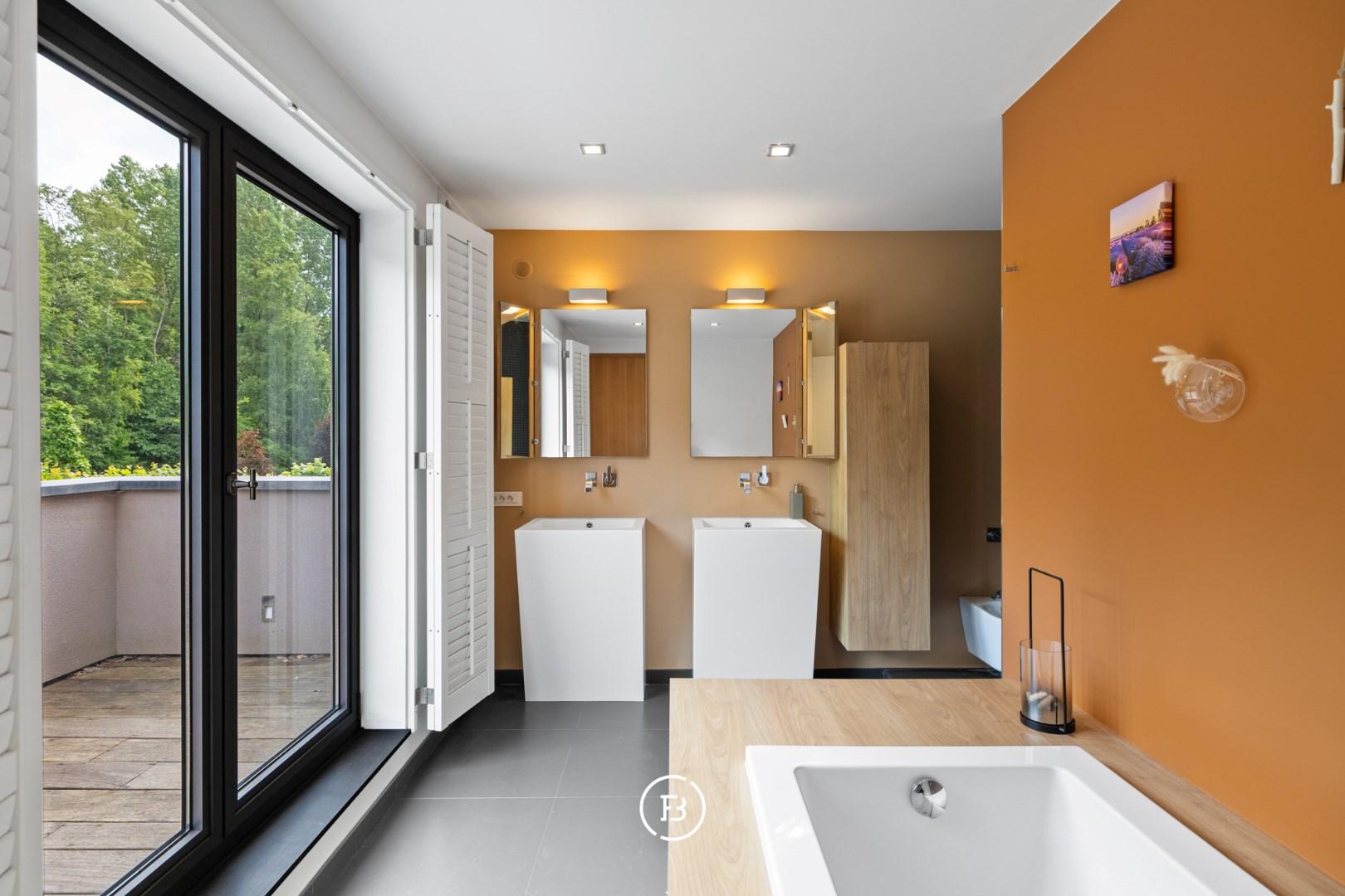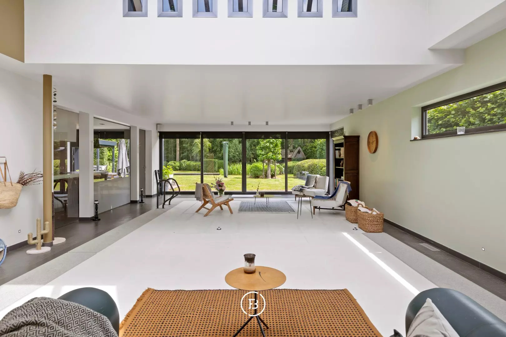 De tweede verdieping biedt een polyvalente ruimte, perfect als hobby- of ontspanningsruimte, met airco en toegang tot een dakterras dat uitkijkt over de groene tuin.