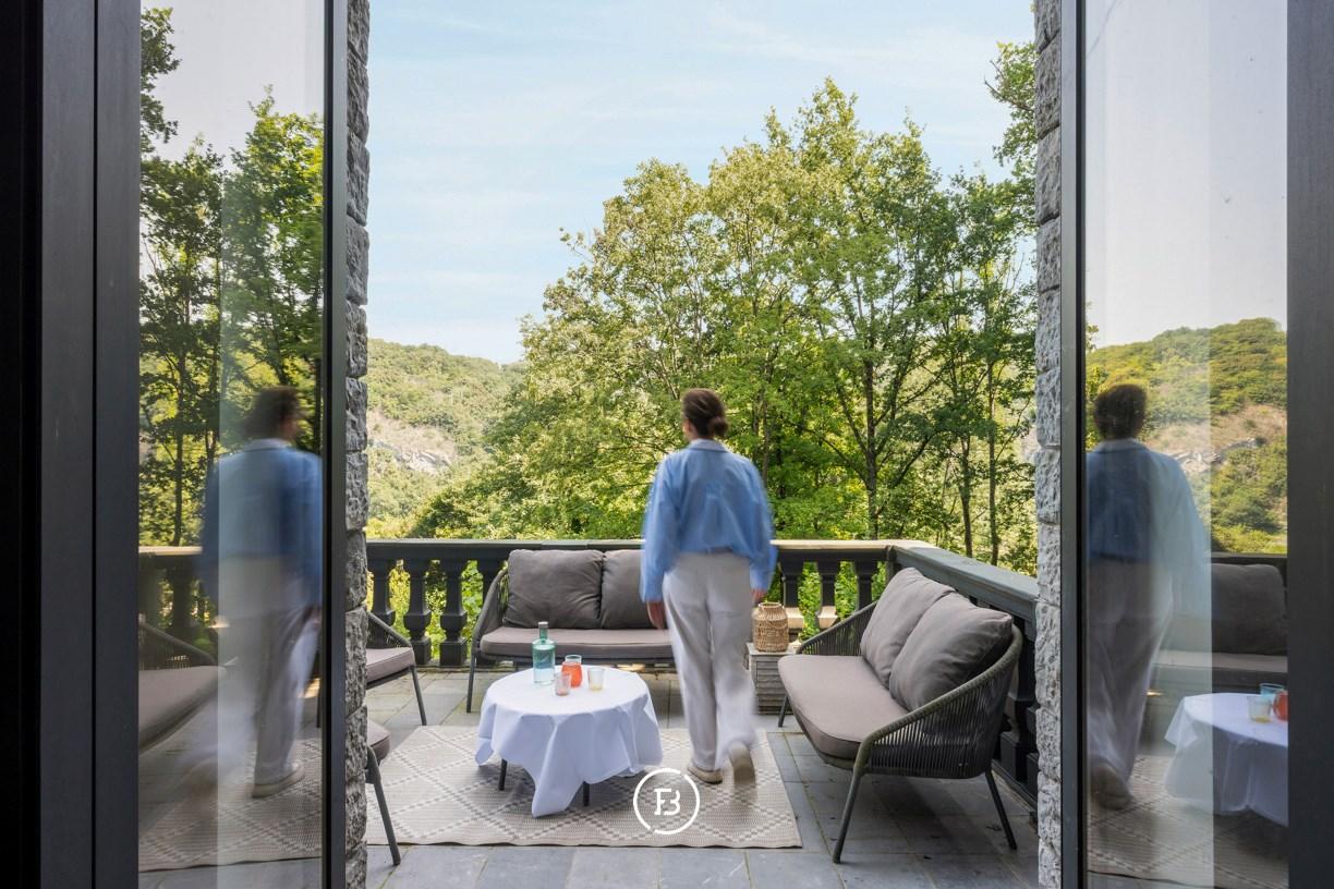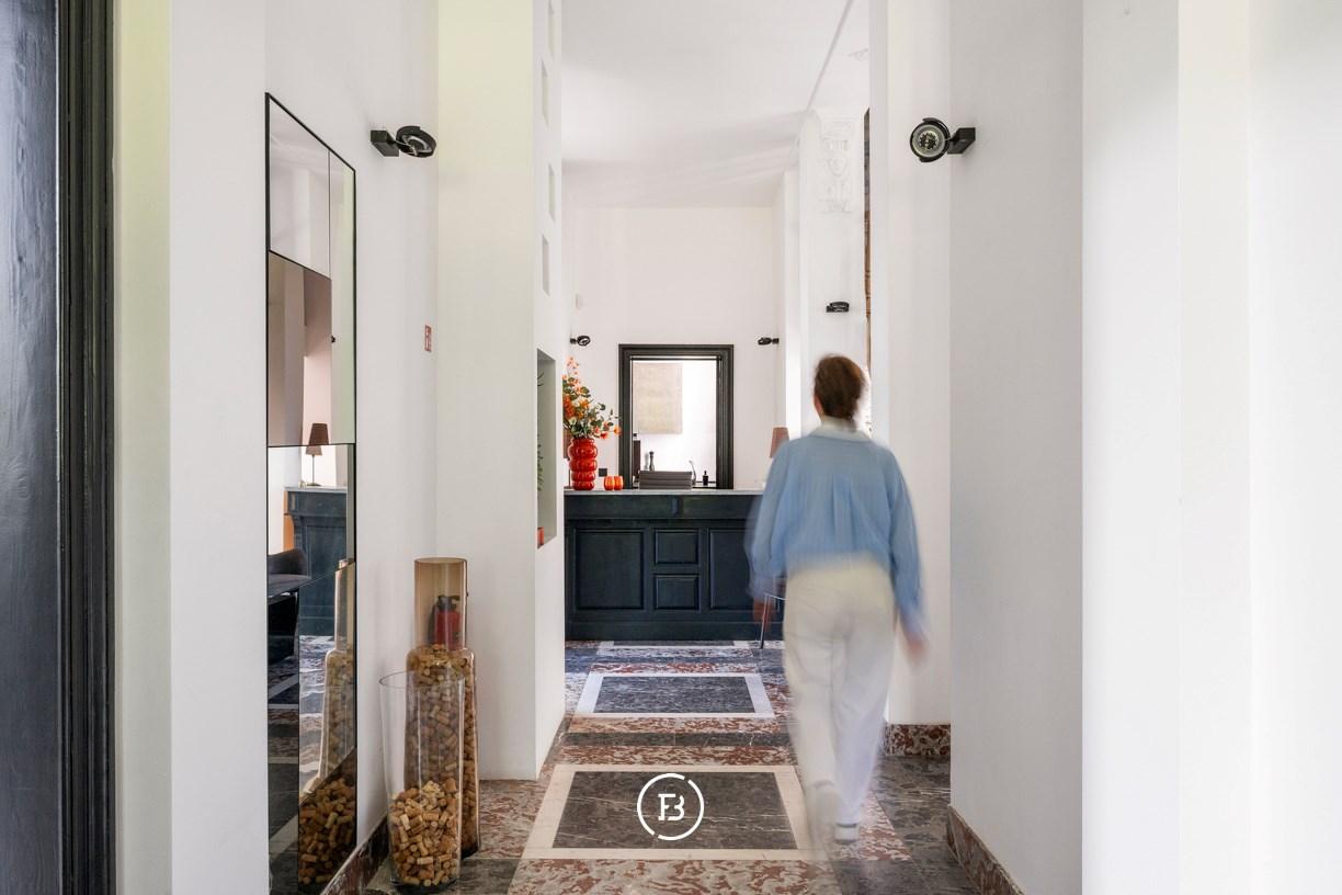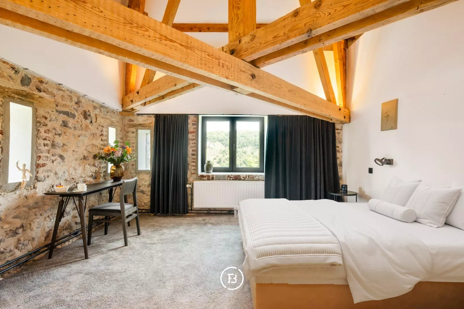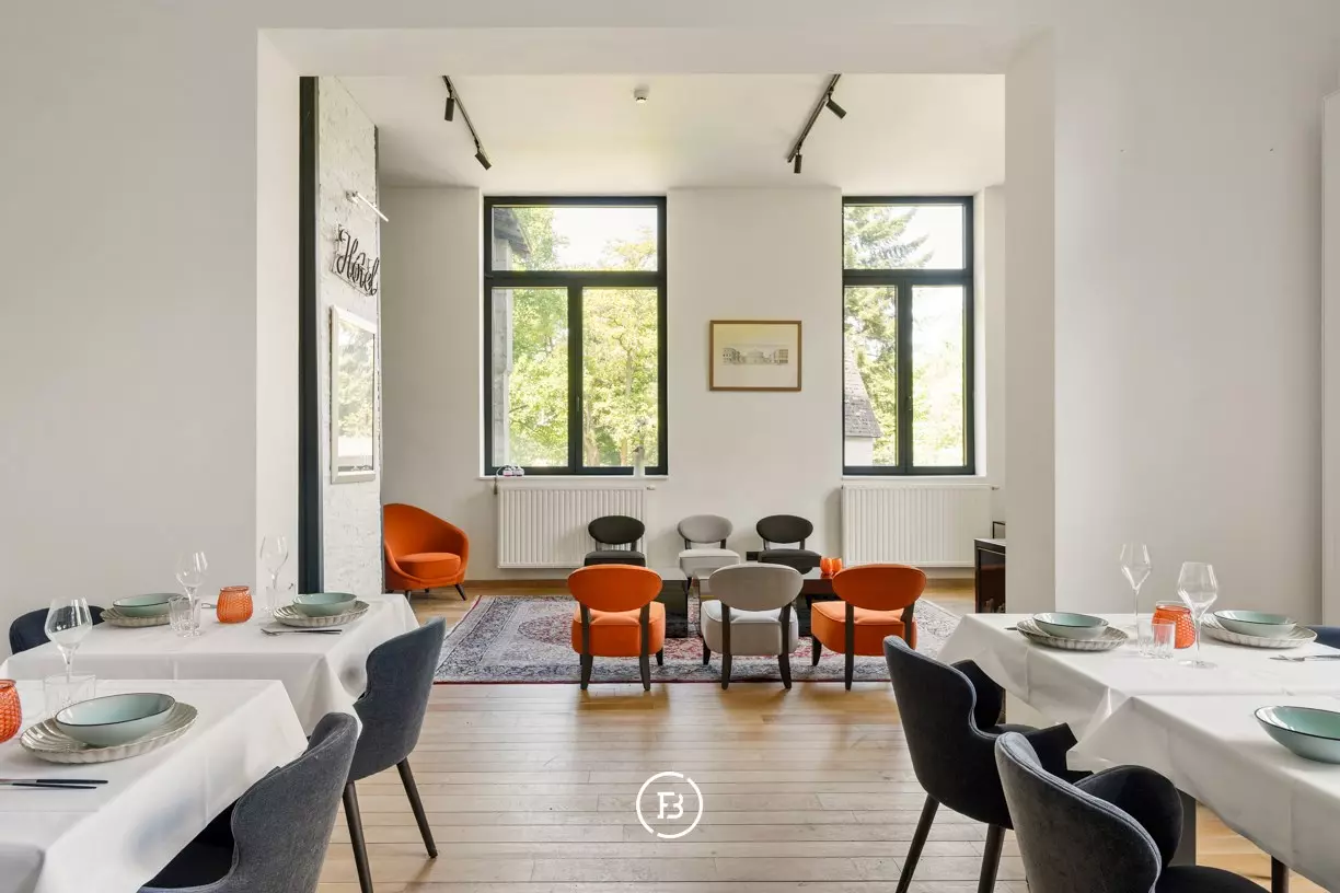 Het gelijkvloers verwelkomt je met een elegante inkomhal en receptie. Verder vind je hier een salon, een eetruimte of restaurant, een volledig uitgeruste keuken, een conferentieruimte en een sfeervolle bar, ondergebracht in de voormalige kapel – een echte eyecatcher die authenticiteit en karakter uitstraalt.