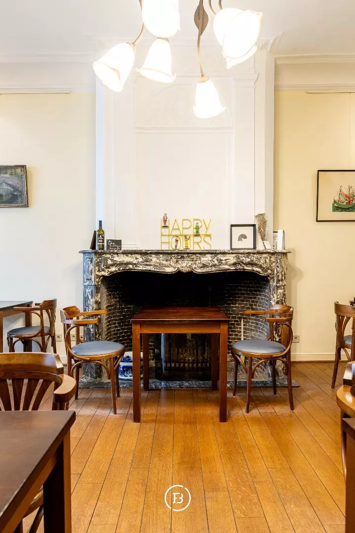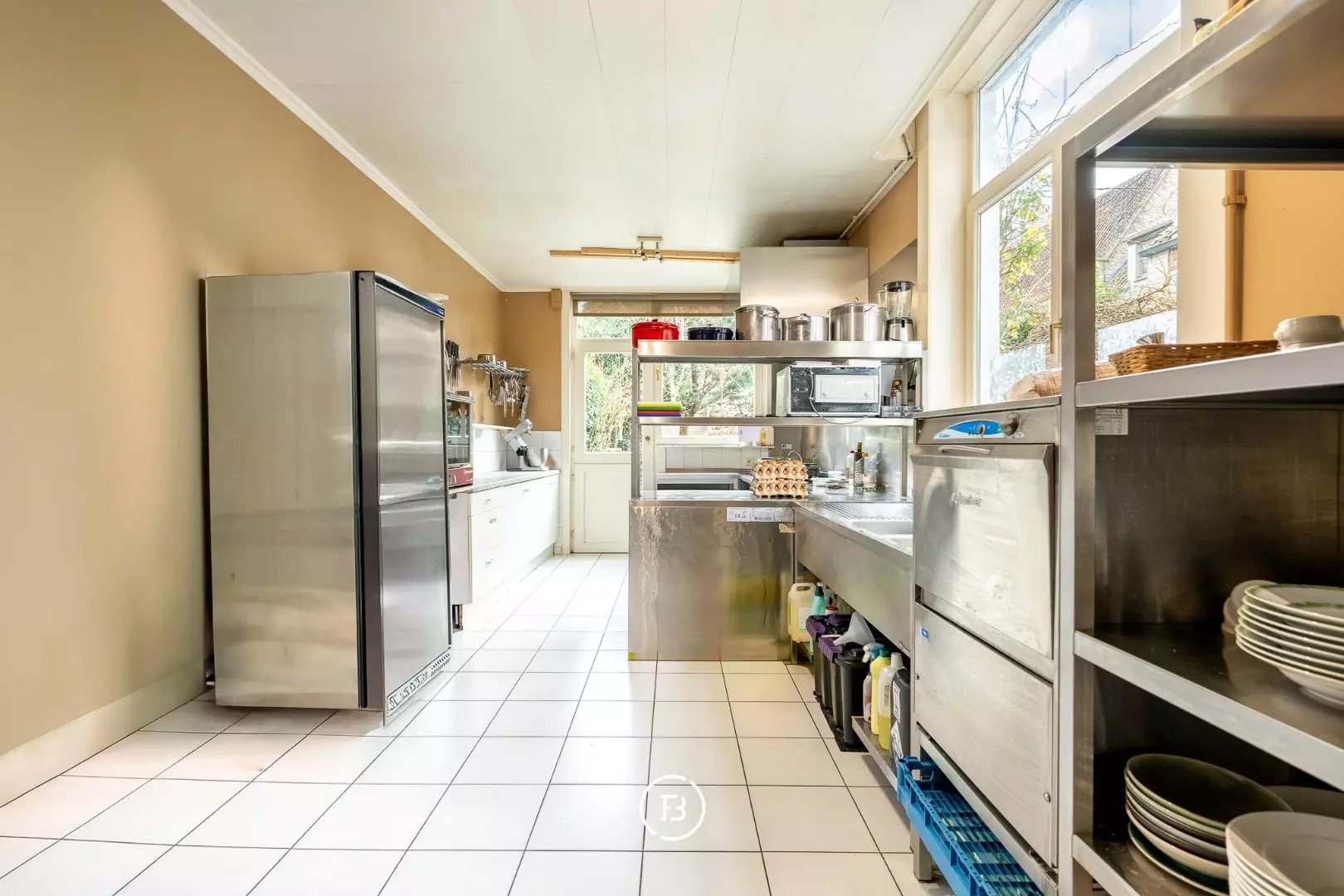 Een industriële keuken, ruime kelder, bar, gelagzaal (29 couverts), ruim terras (22 couverts) met tuin achteraan en sanitaire voorzieningen (man/vrouw) in de hal. Het pand is vrij van brouwer maar is op heden wel verhuurd (zie handelshuurcontract – op te vragen bij de makelaar).