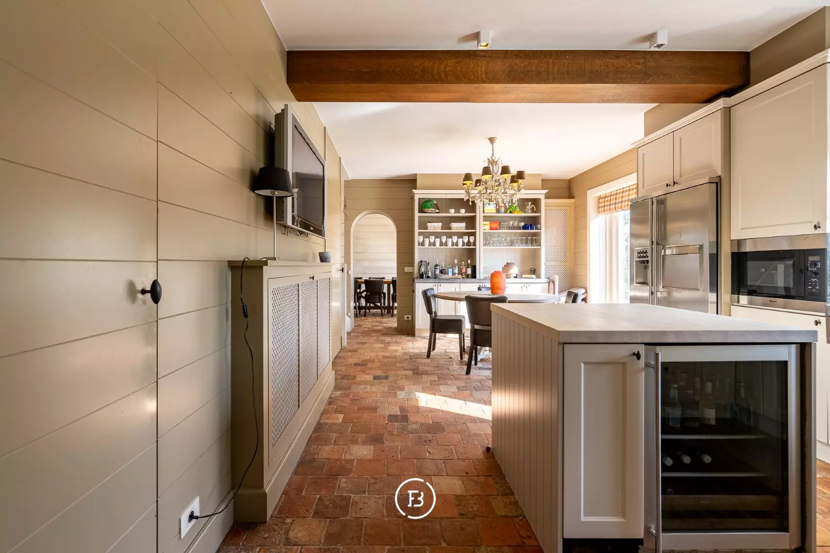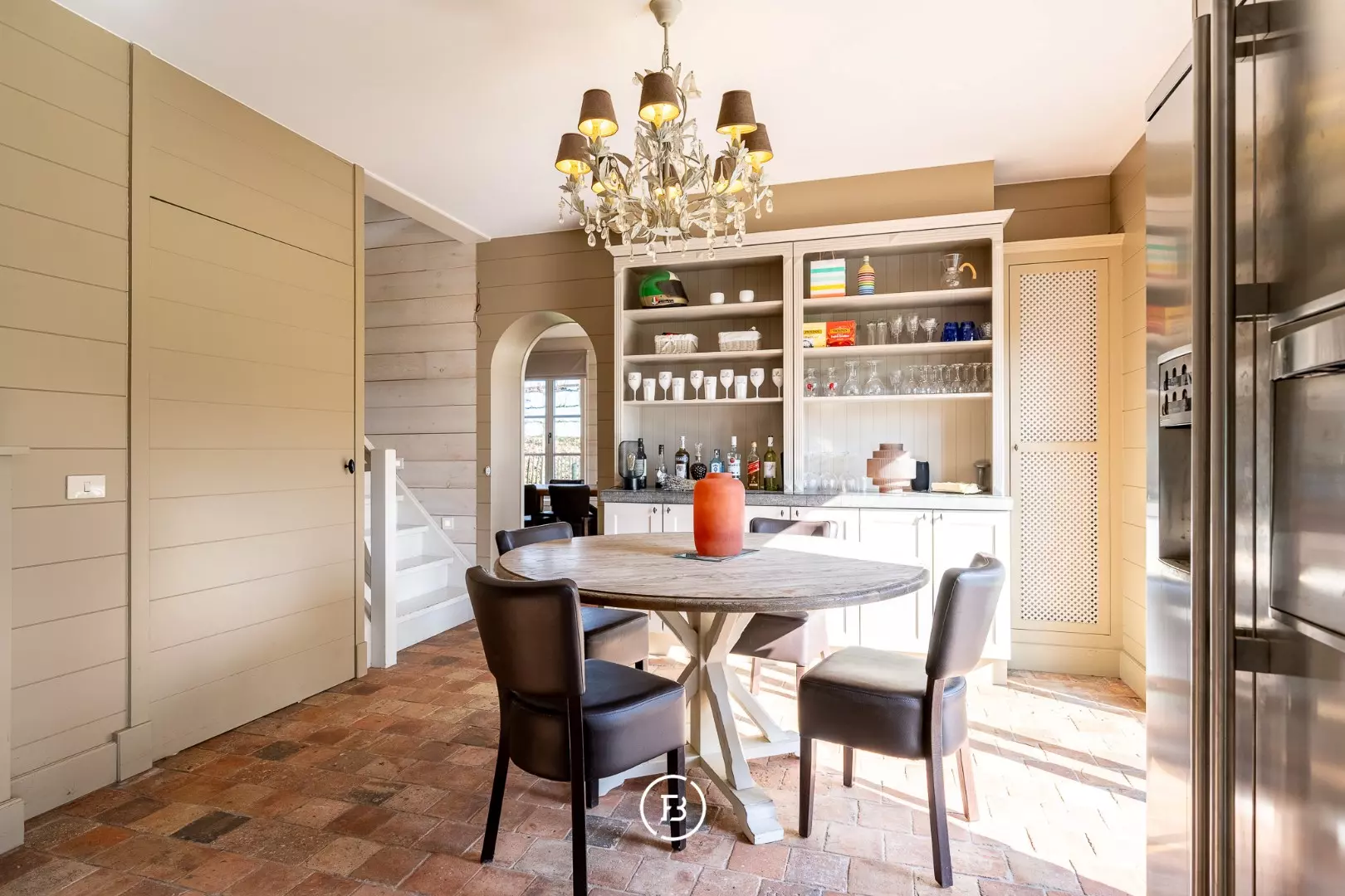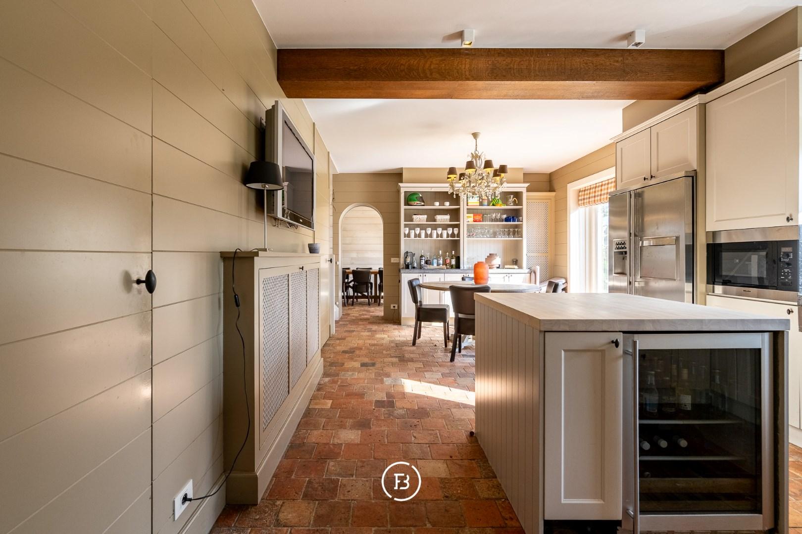 Het woonhuis zelf heeft op het gelijkvloers een grote leefruimte, wasplaats, ruime, goed uitgeruste leefkeuken met oa. een Lacanche kookvuur en een eiland met ingebouwde wijnkoeler,... Naast de keuken heb je nog een eetkamer met tafel voor 12-14 personen. In de keuken is ook nog doorgang neer een kelder en de trap naar de eerste verdieping.