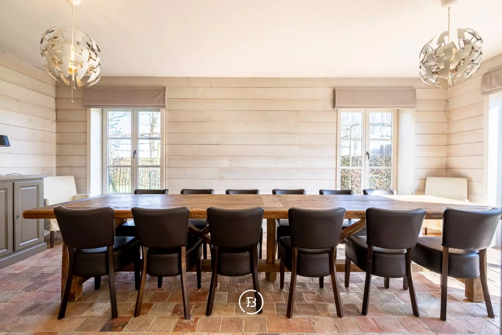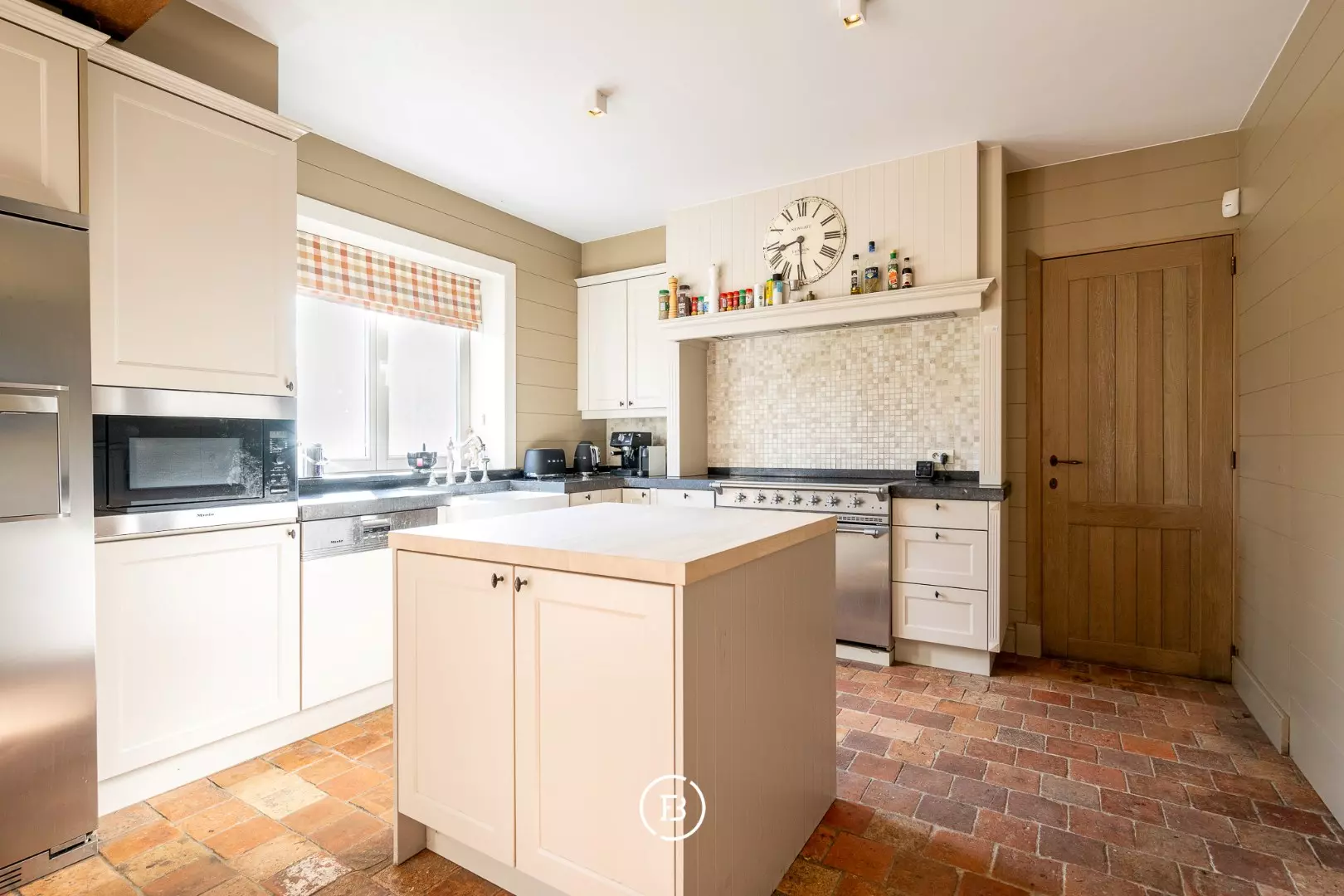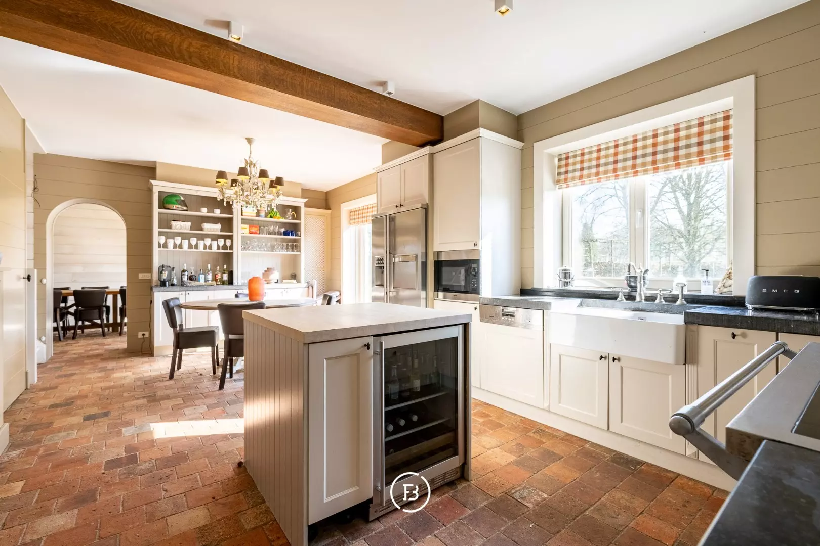 Het woonhuis zelf heeft op het gelijkvloers een grote leefruimte, wasplaats, ruime, goed uitgeruste leefkeuken met oa. een Lacanche kookvuur en een eiland met ingebouwde wijnkoeler,... Naast de keuken heb je nog een eetkamer met tafel voor 12-14 personen. In de keuken is ook nog doorgang neer een kelder en de trap naar de eerste verdieping.
