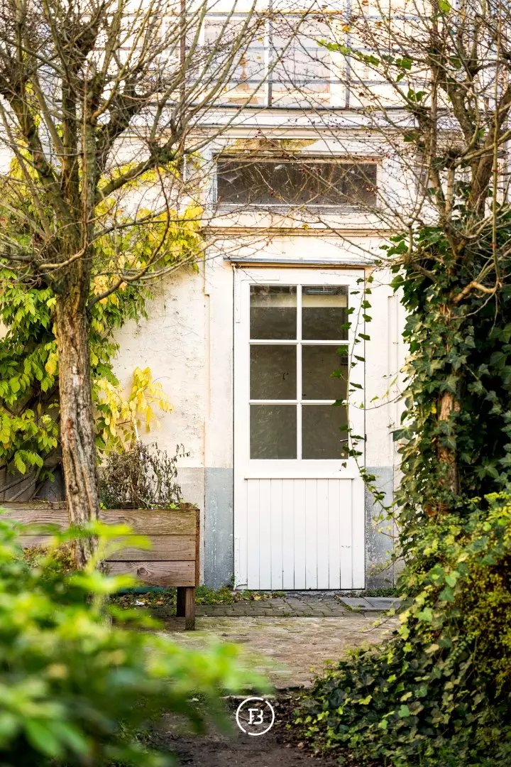Achteraan het perceel bevindt zich het karaktervolle koetshuis van 115 vierkante meter, bereikbaar via de koetsdoorgang die eenvoudig kan worden ingericht als parking voor meerdere wagens. Dit aparte gebouw vormt een bijkomende troef, met potentieel voor gastenverblijf, atelier of kantoor.