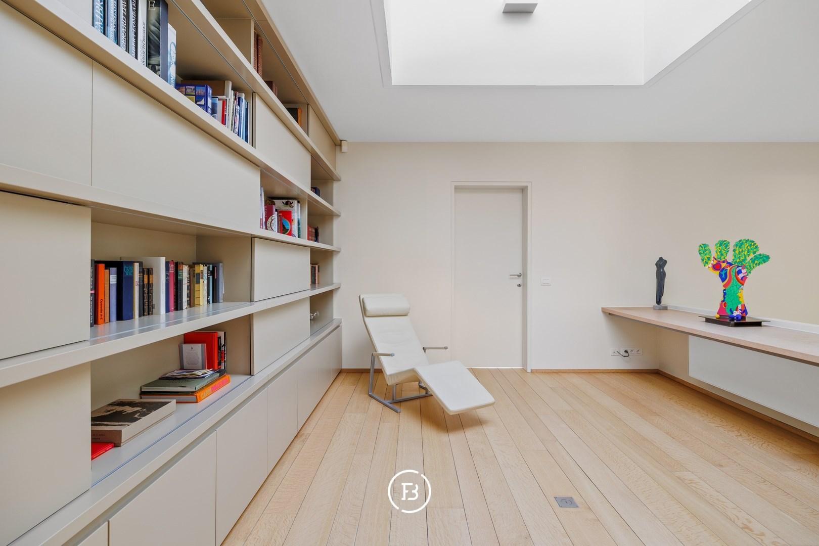 1: De prachtige trap neemt ons mee naar de eerste verdieping. De centrale mezzanine met bibliotheek en bureau geeft toegang tot 3 ruime kamers waarvan één dienst kan doen als wasruimte. De masterbedroom beschikt over een ruime slaapkamer met en-suite badkamer voorzien van ligbad, dubbel wasmeubel, douche, inmaak kasten en een vloer afgewerkt in Braziliaanse Porpora. De 3de kamer is voorzien van inmaakkasten en en-suite badkamer.
