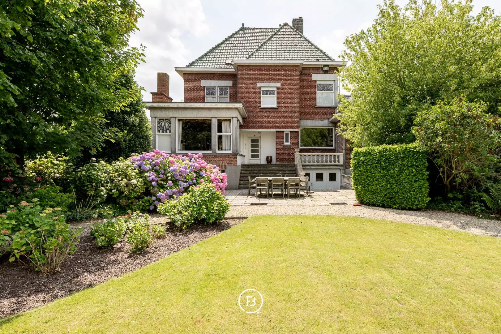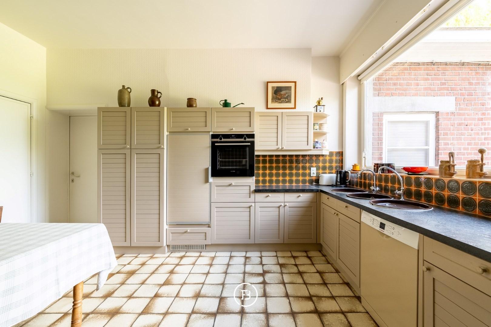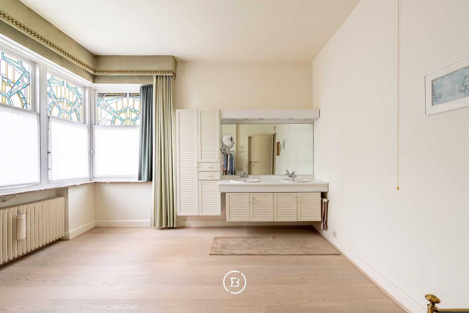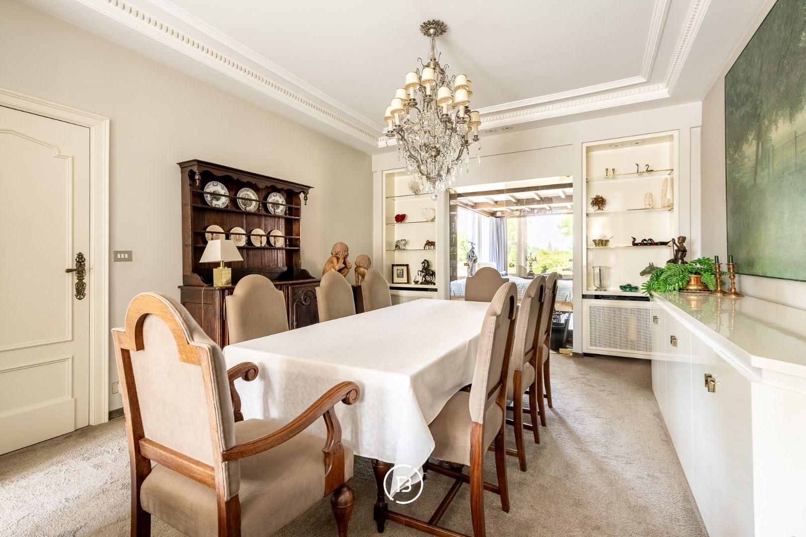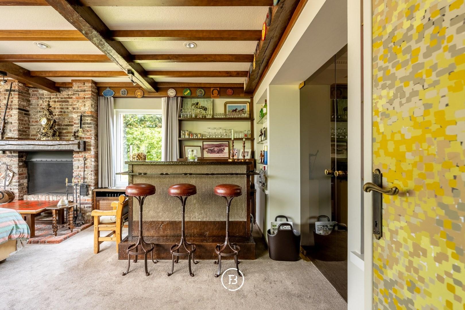 U komt de woning binnen via de lichtrijke inkom met traphal en u vindt enerzijds een gezellige zithoek en anderzijds een eerste grote lichtrijke leefruimte met aanpalend een bar/bureau. Deze staat in verbinding met de geriefelijke keuken en een 2de grote leefruimte. Op het 1ste verdiep bevinden zich 4 ruime slaapkamers, waarvan een met badkamer ensuite, een berging en de badkamer. Grote zolder die nog extra mogelijkheden biedt. Volledig onderkelderd (garages, berging, wasplaats, wijnkelder en stookruimte).