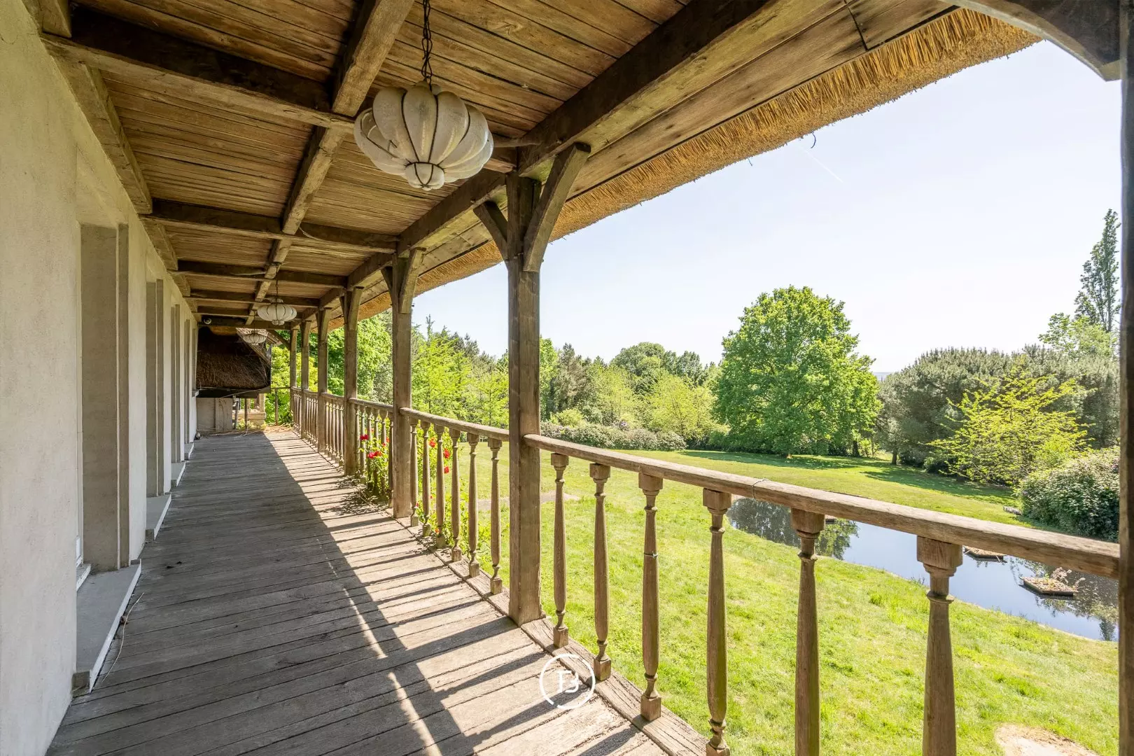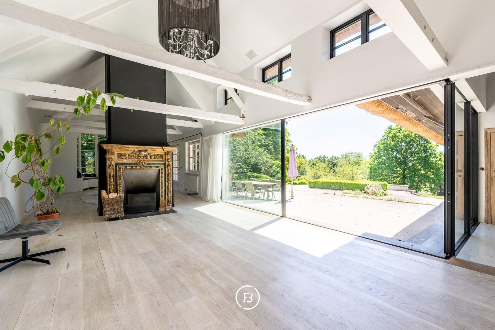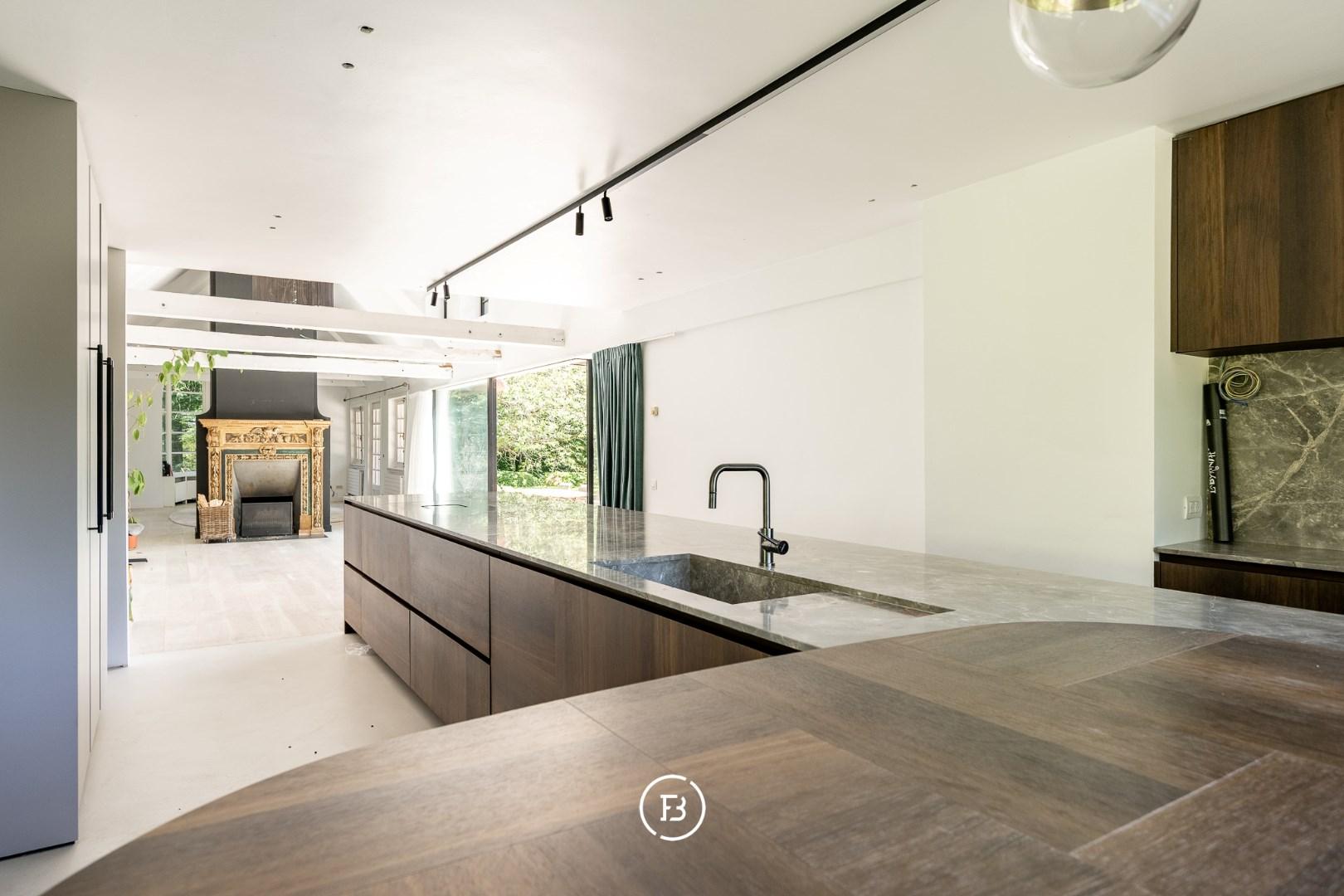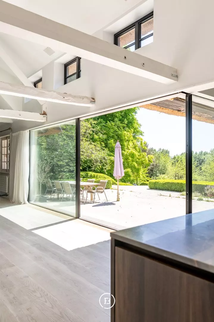 Aan de linkerzijde van de inkomhal treffen we de recent vernieuwde keuken aan, voorzien van vloerverwarming en veel natuurlijke lichtinval dankzij een schuifraam over de volledige wand. Deze keuken sluit naadloos aan op de eetplaats en de tweede leefruimte, waar een charmante rondboogerker uitzicht biedt op de tuin. Een centrale houthaard vormt het warme middelpunt tussen eetruimte en salon. De keuken en eetplaats geven uit op het ruime terras en het zwembadgedeelte, met een aangenaam zicht op de volledig aangelegde tuin.