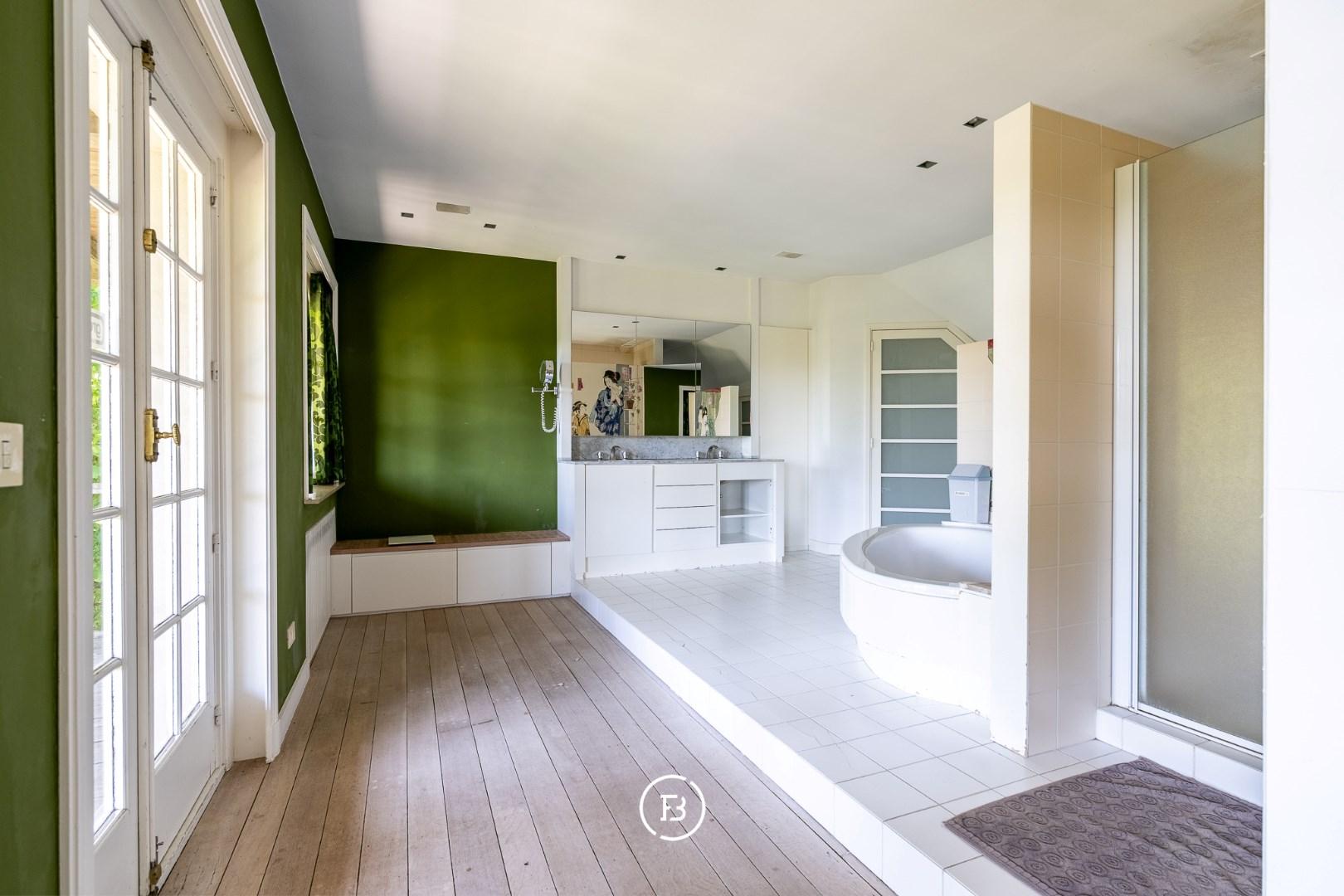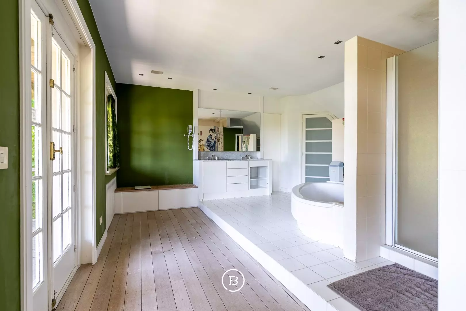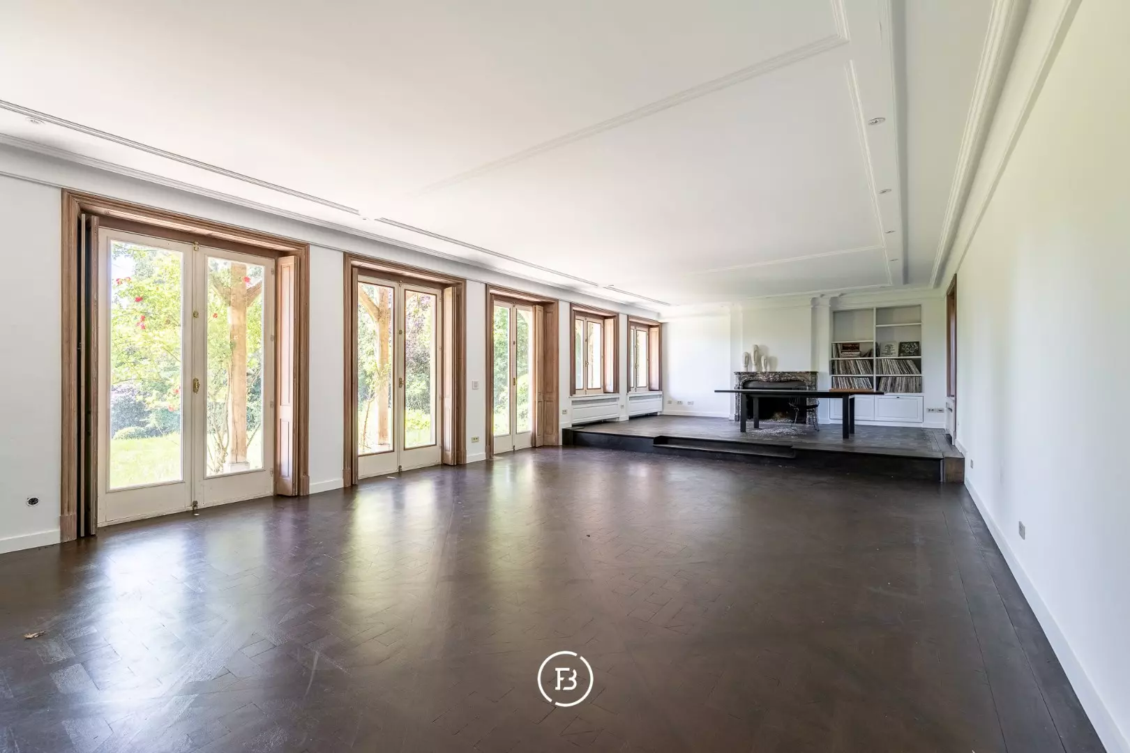 Bij het betreden van de woning valt onmiddellijk de imposante, lichtrijke inkomhal op, voorzien van marmeren vloeren en een elegante massief eiken trap. Rechts bevindt zich een open doorgang naar de eerste salon met directe toegang tot de tuin en het terras. Aanpalend ligt een vestiaire met gastentoilet. Verder omvat het gelijkvloers een kinderkamer of bureauruimte, een badkamer en een bijkomende slaapkamer — ideaal voor praktijkgebruik of als afzonderlijke woonunit.