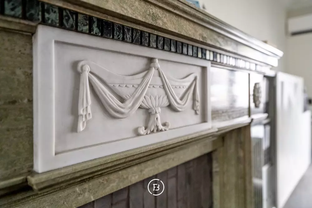 De bovenverdiepingen van de woning werden met verfijnde smaak en aandacht voor detail gerenoveerd (authentieke trap, visgraatparket, prachtige schouwmantels, airco,…). Dit gedeelte van de woning werd op heden deels ingericht als kantoor, met eigen keuken en stijlvolle vergaderzaal, maar kan perfect als aparte woonunit dienst doen. Deze verdieping beschikt over een apart toilet en zeer ruim zongericht terras. Op het tweede verdiep bevinden zich vier ruime slaapkamers met een badkamer (inloopdouche, dubbele wastafel en toilet).