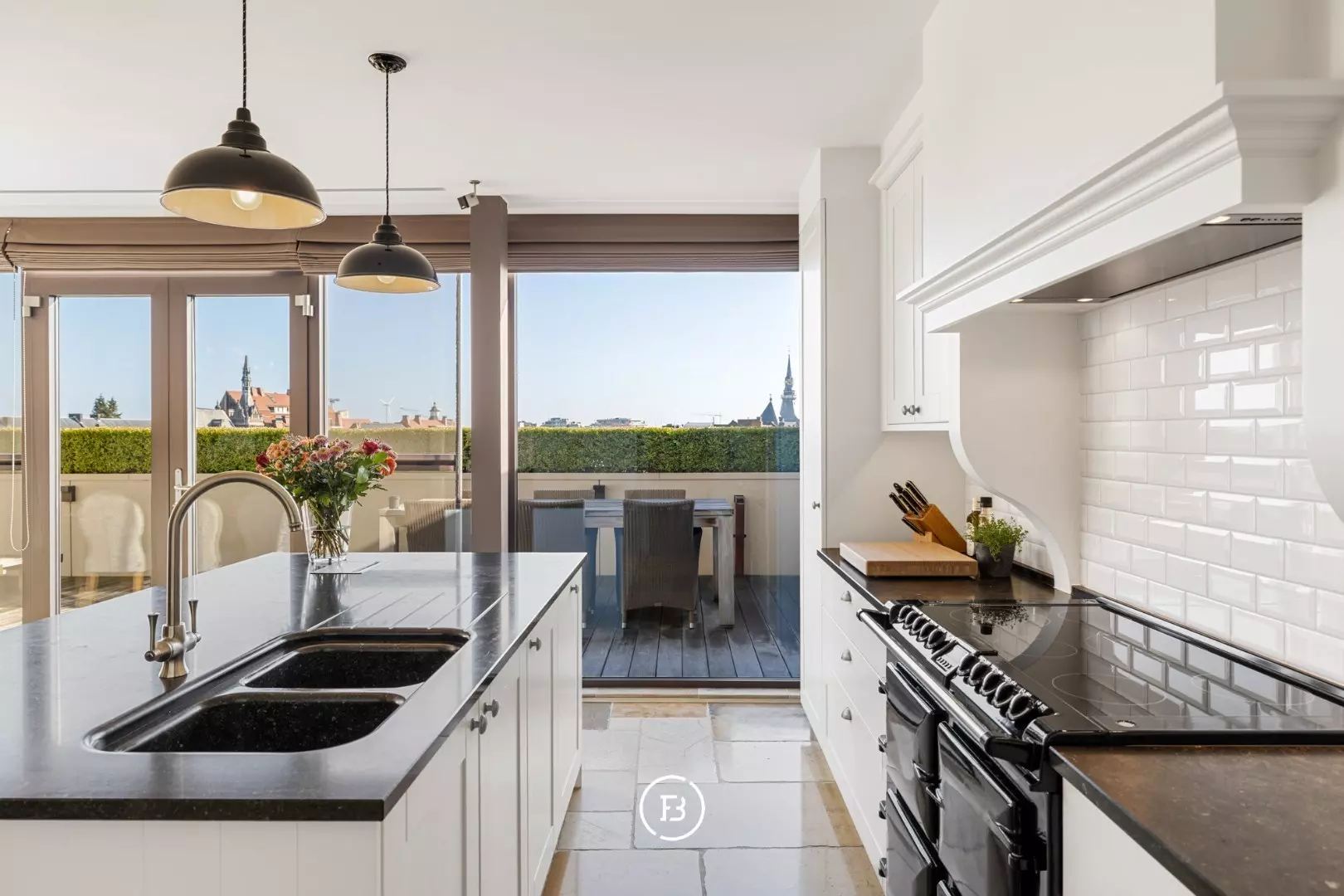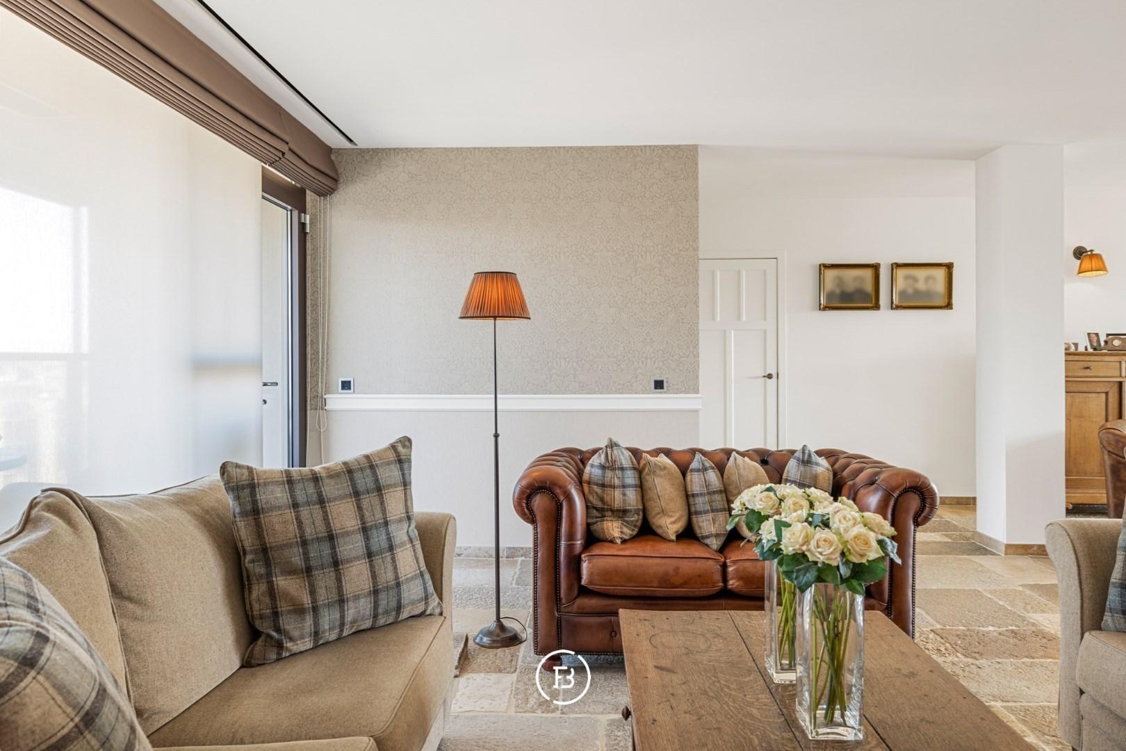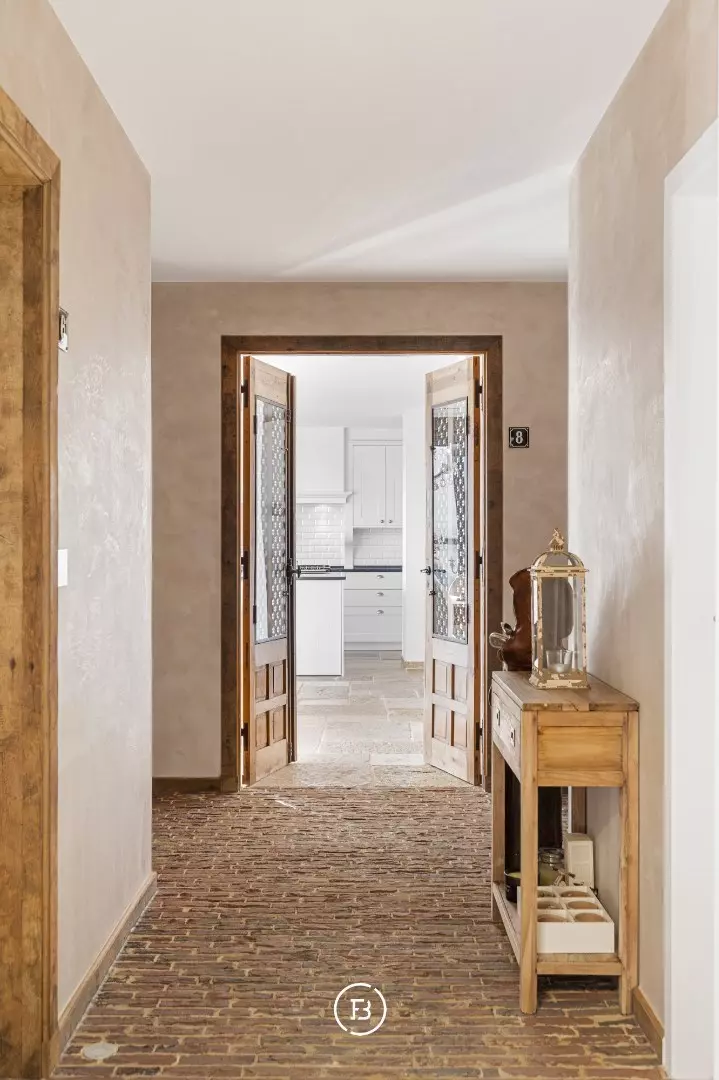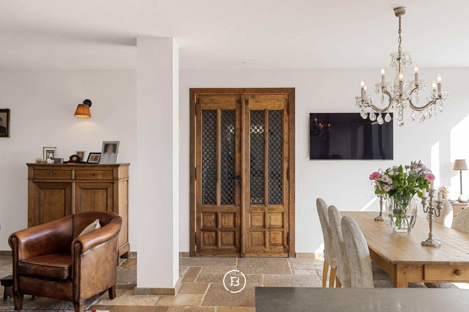 In de lichtrijke leefruimte ontmoeten hoogwaardige materialen en doordachte architectuur elkaar. Authentieke bourgondische dallen, een Franse stenen schouwmantel met gashaard en subtiele maatwerkintegraties creëren een warme, huiselijke sfeer. Dankzij de grote raampartijen geniet u van een vloeiende overgang naar de twee prachtige terrassen, samen goed voor 56 m² aan pure buitenbeleving.