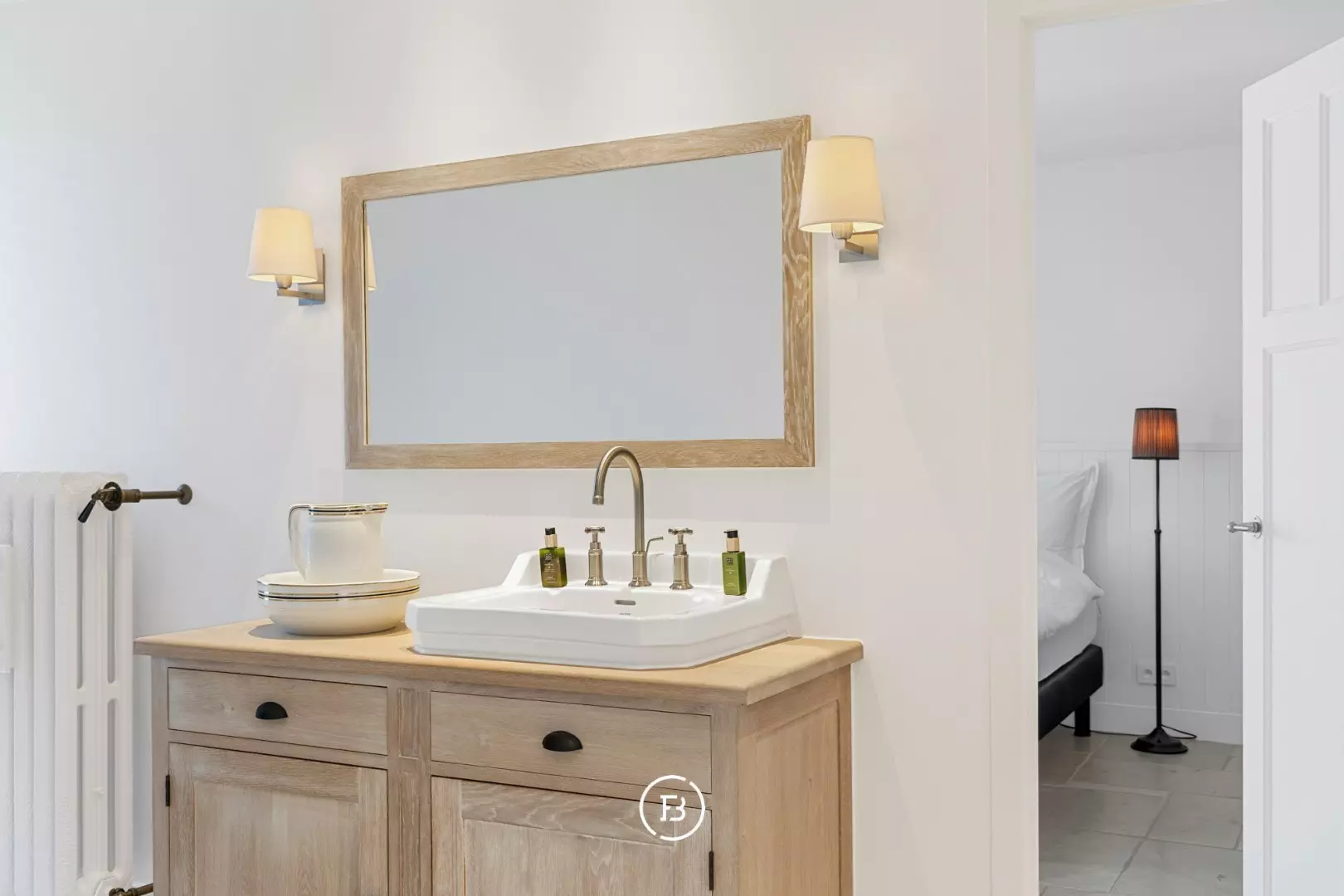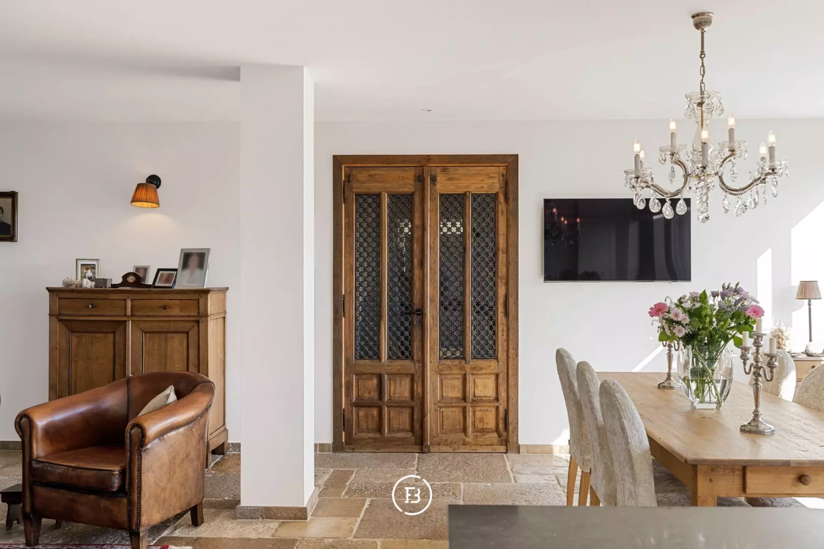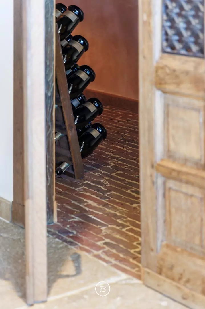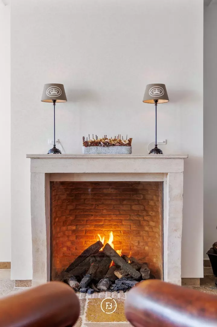 Authentieke bourgondische dallen, een Franse stenen schouwmantel met gashaard en subtiele maatwerkintegraties creëren een warme, huiselijke sfeer