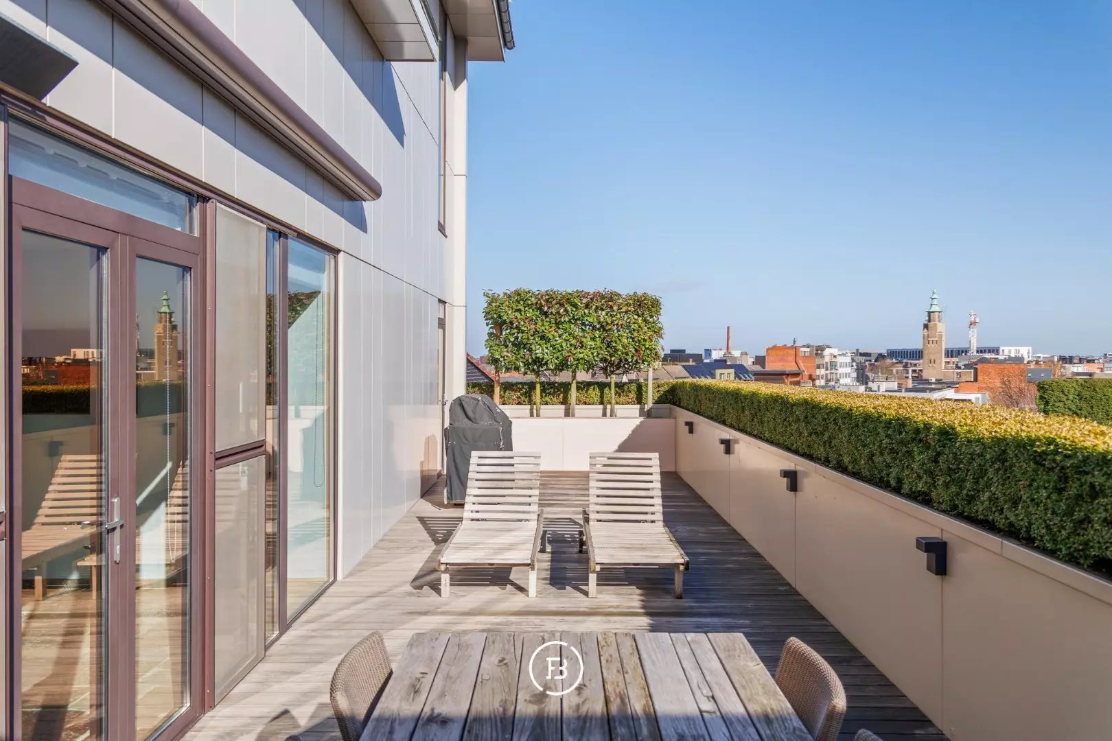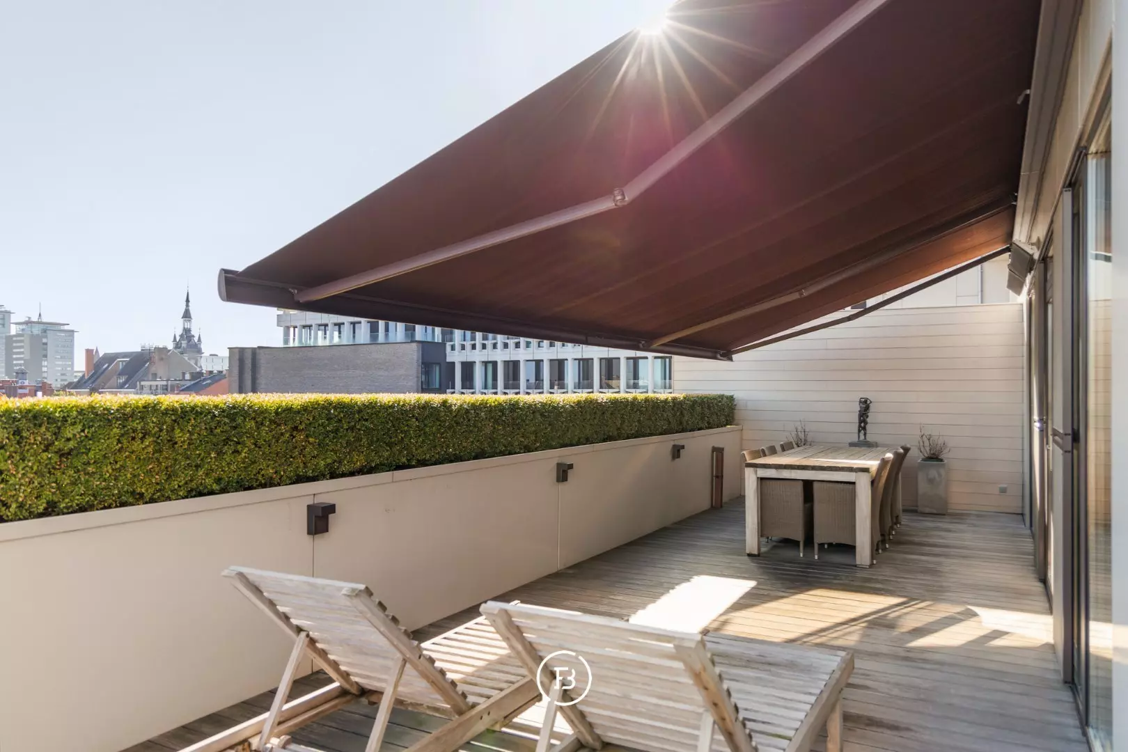 Het terras aan de achterzijde, met een oppervlakte van 50 m², biedt een adembenemend weids uitzicht en volledige privacy. Afgewerkt met IPE-beplanking, een zonneluifel en een geïntegreerd Bose-audiosysteem, vormt het een perfecte plek om te ontspannen of gasten te ontvangen.