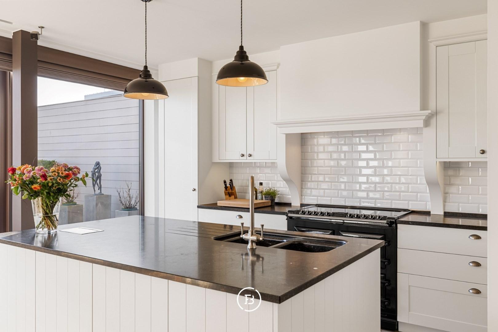 De op maat gemaakte keuken, met hoogwaardige afwerking en AGA-fornuis als centraal element, grenst praktisch aan de geïntegreerde berging.