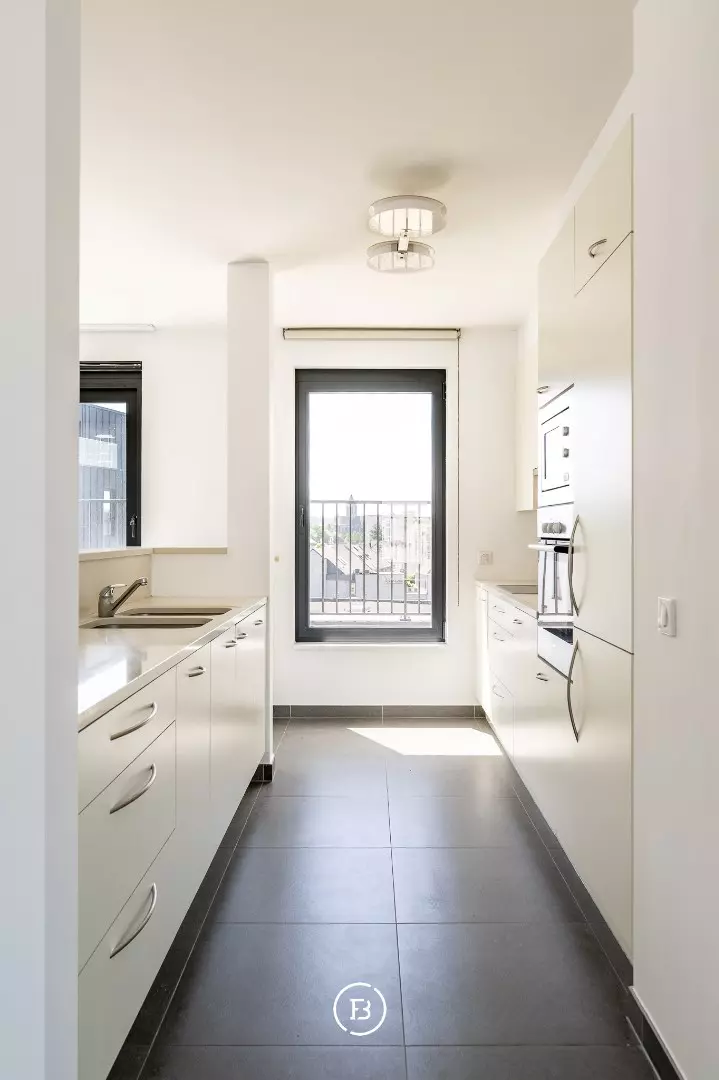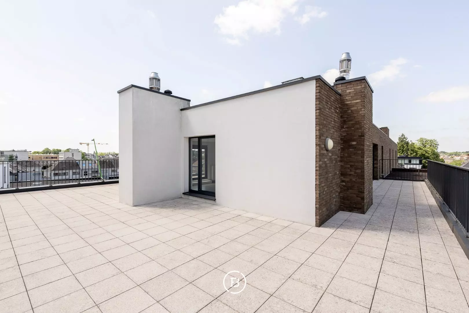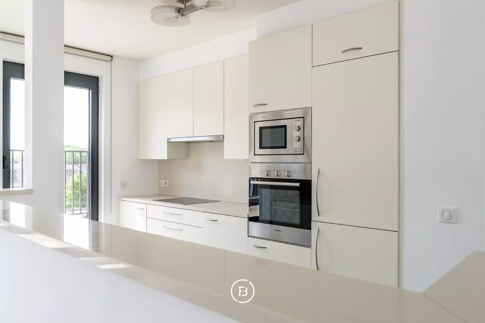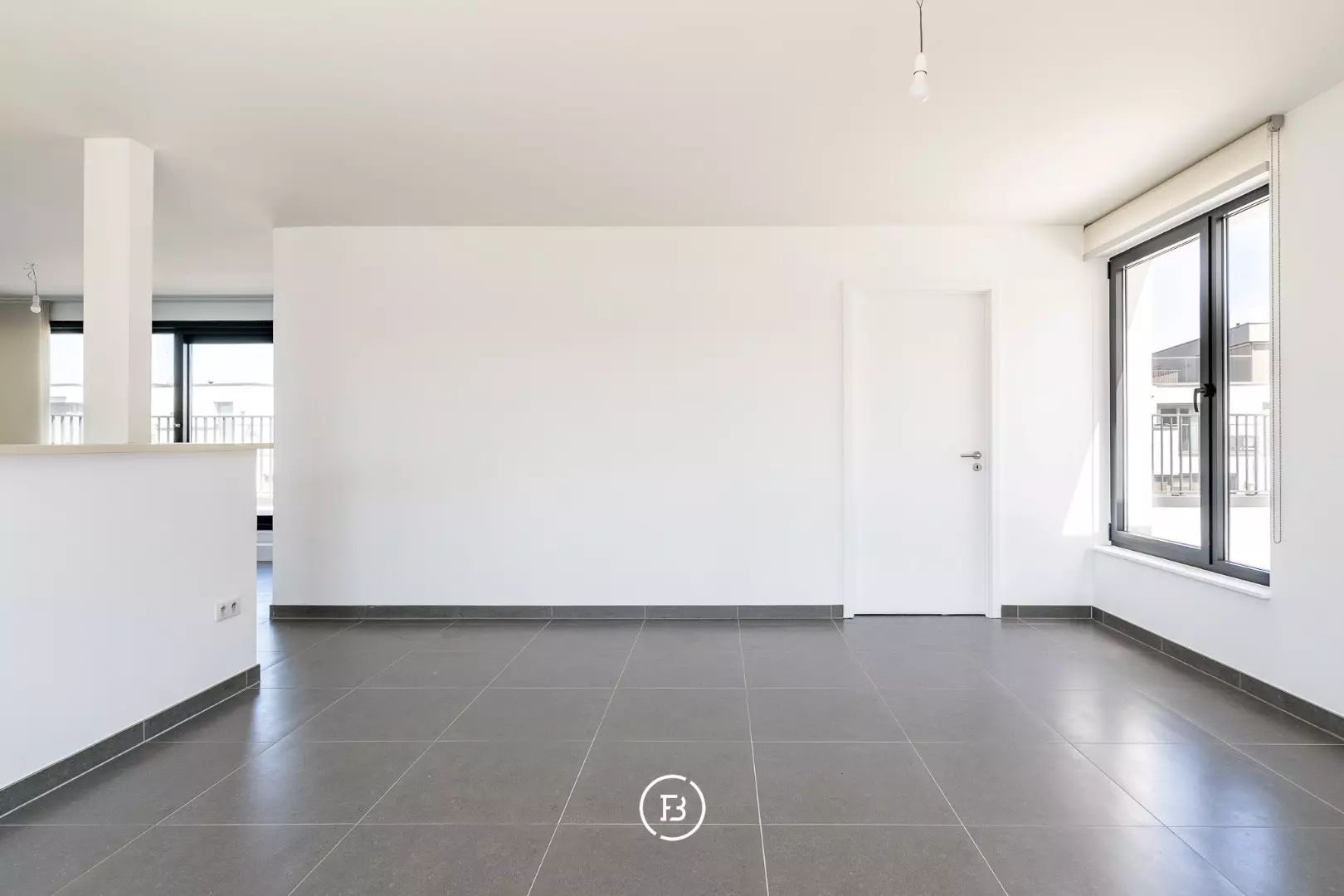 Dit ruime penthouse biedt een doordachte indeling met een aangename flow tussen leef- en slaapgedeelte. De open leefruimte met ingerichte keuken en centraal kookeiland baadt in het licht dankzij grote raampartijen en twee schuiframen die toegang geven tot het zeer ruime terras, dat rondom het appartement loopt — perfect voor wie van buitenruimte houdt.