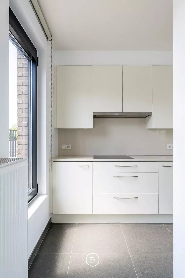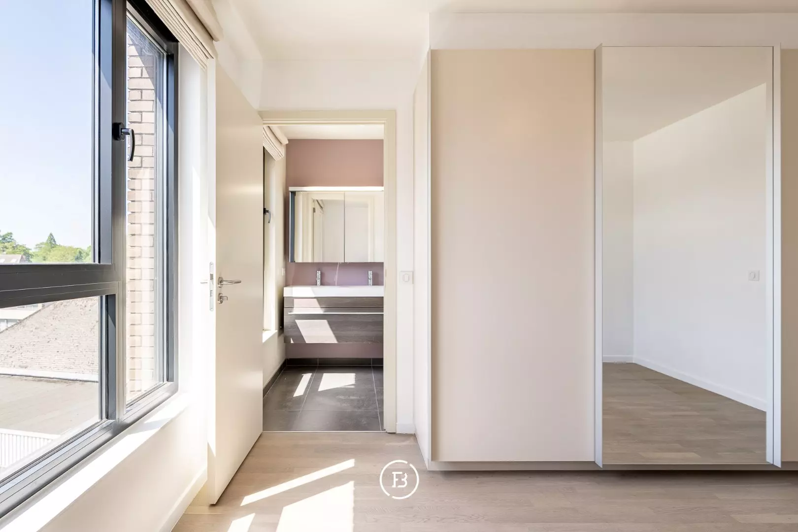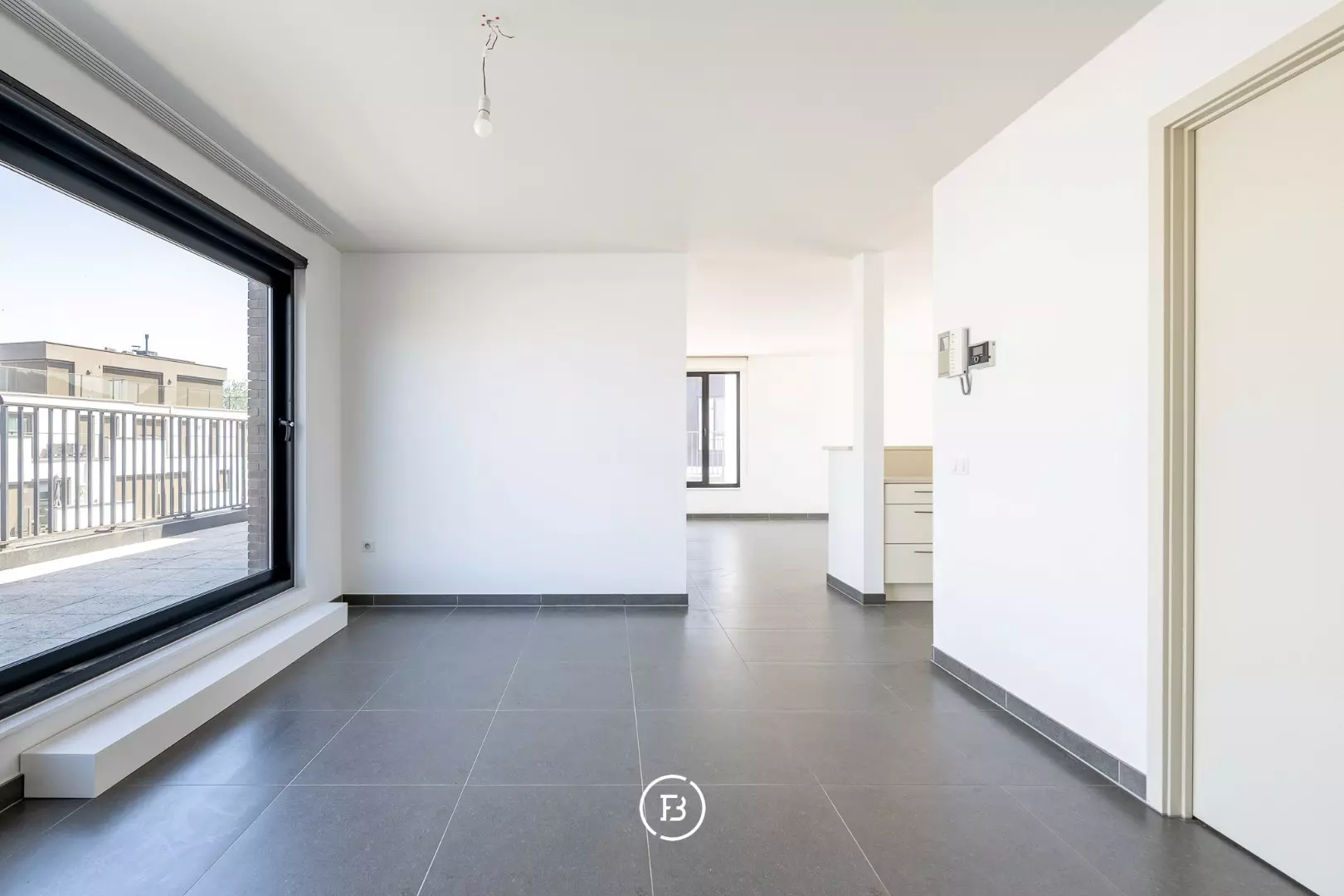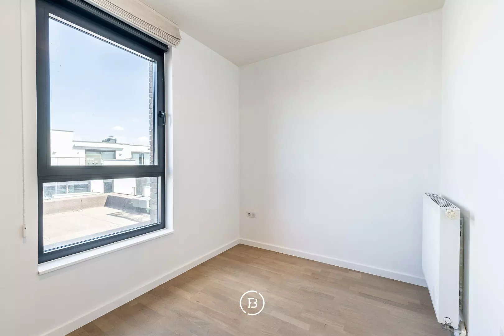 Dit ruime penthouse biedt een doordachte indeling met een aangename flow tussen leef- en slaapgedeelte. De open leefruimte met ingerichte keuken en centraal kookeiland baadt in het licht dankzij grote raampartijen en twee schuiframen die toegang geven tot het zeer ruime terras, dat rondom het appartement loopt — perfect voor wie van buitenruimte houdt.