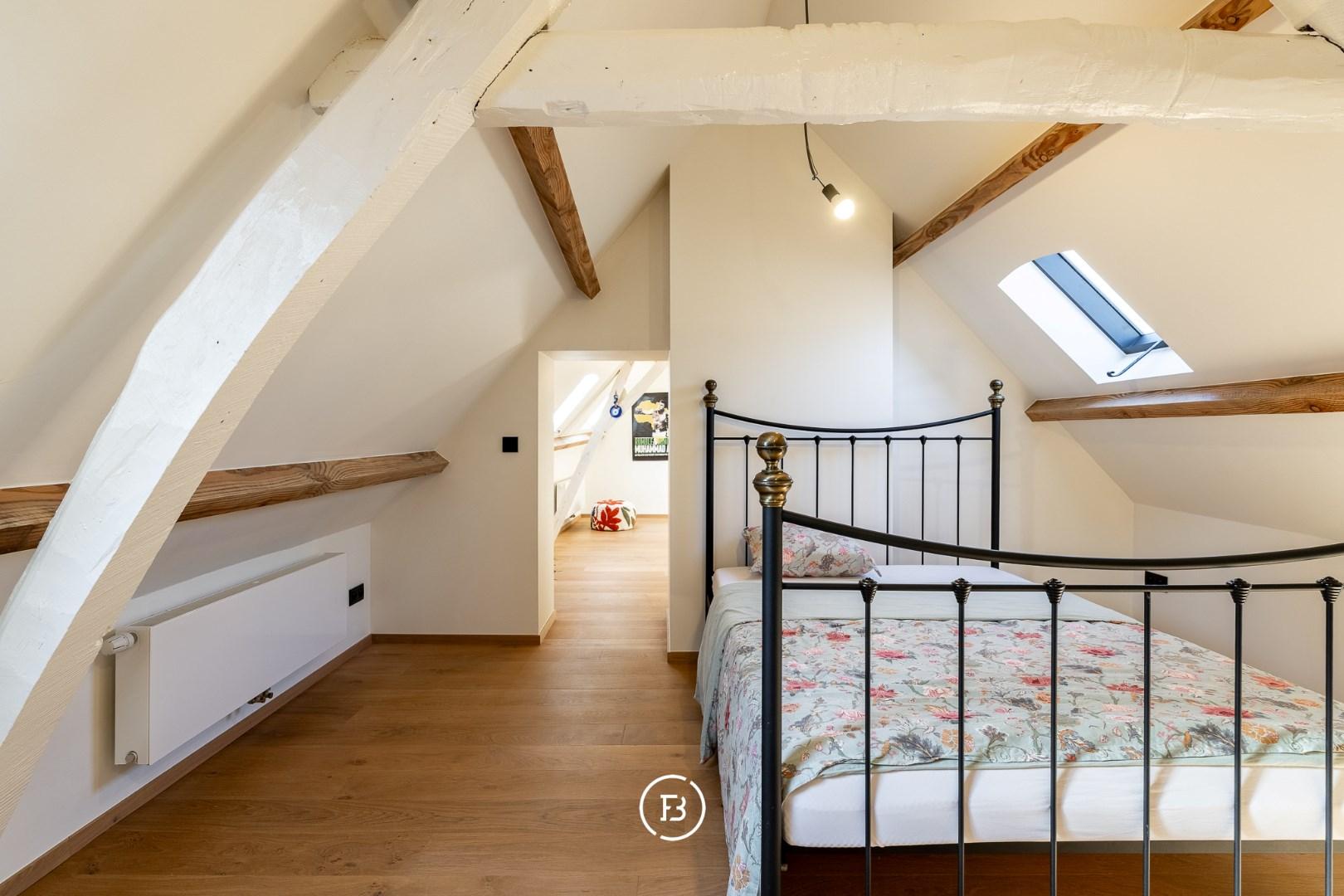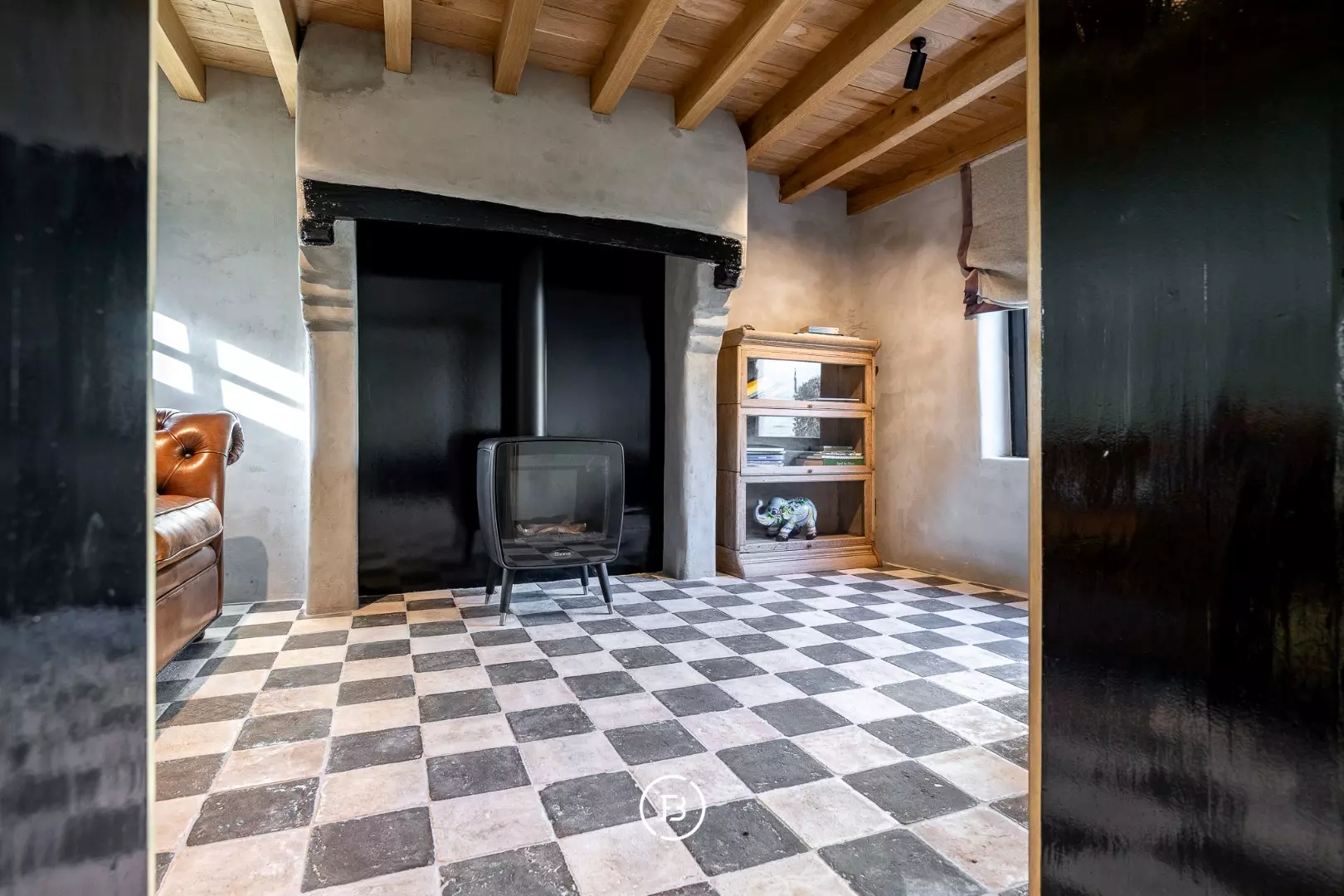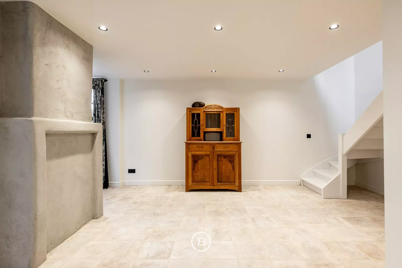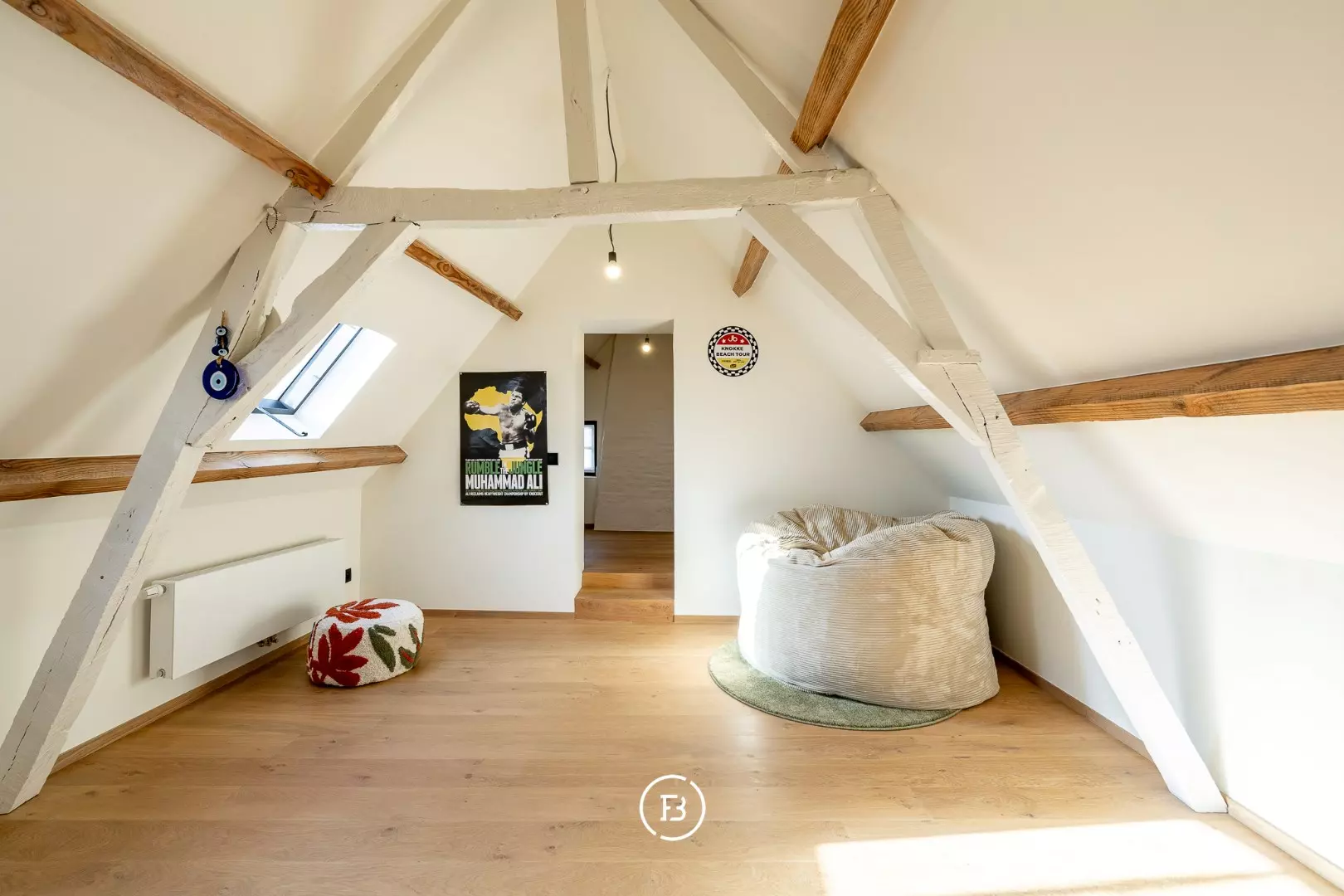 Een extra troef op het gelijkvloers is de karaktervolle voutekamer met houtkachel, perfect als bureau, hobbyruimte of knusse leeshoek. De badkamer is modern afgewerkt en voorzien van een inloopdouche en lavabo.