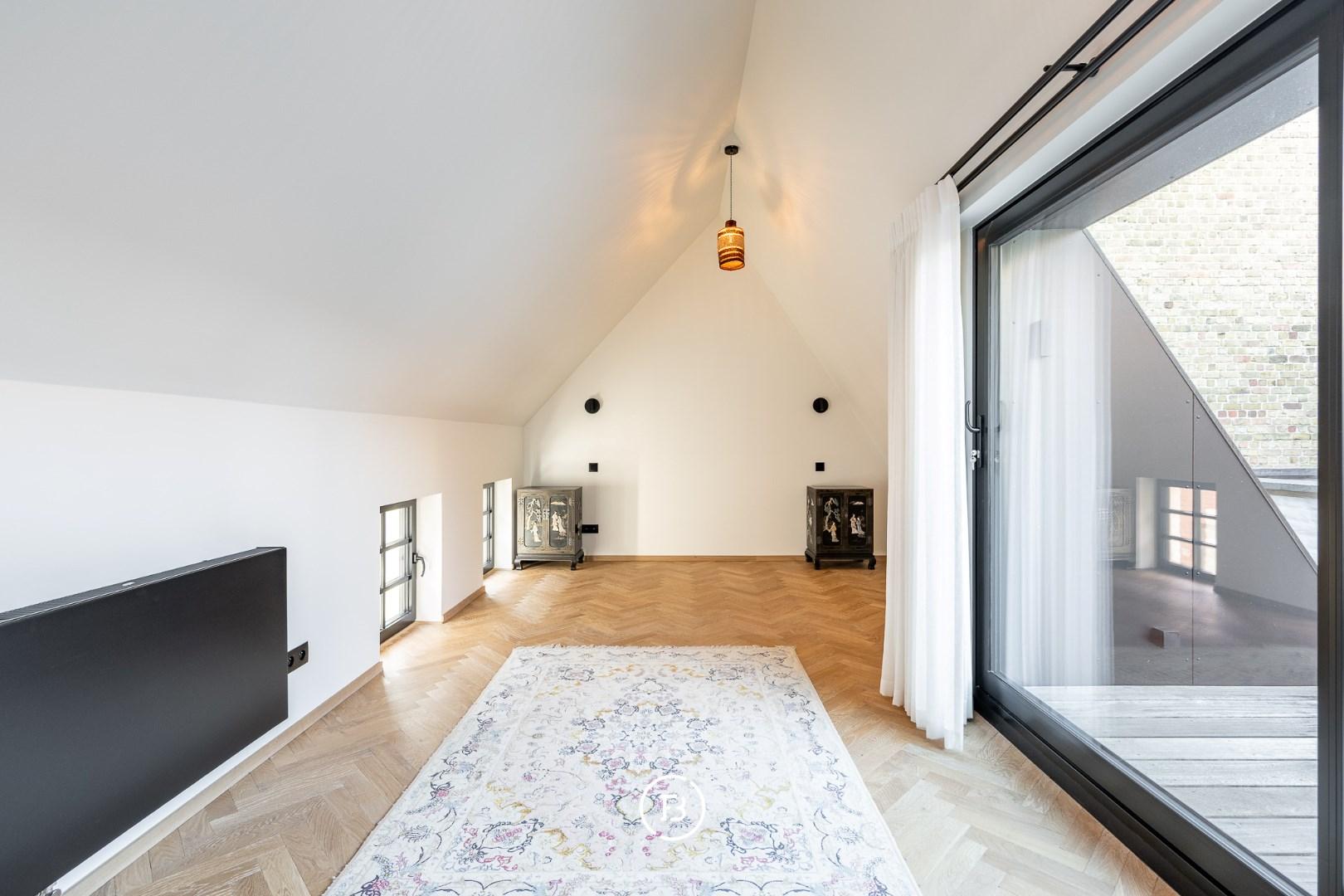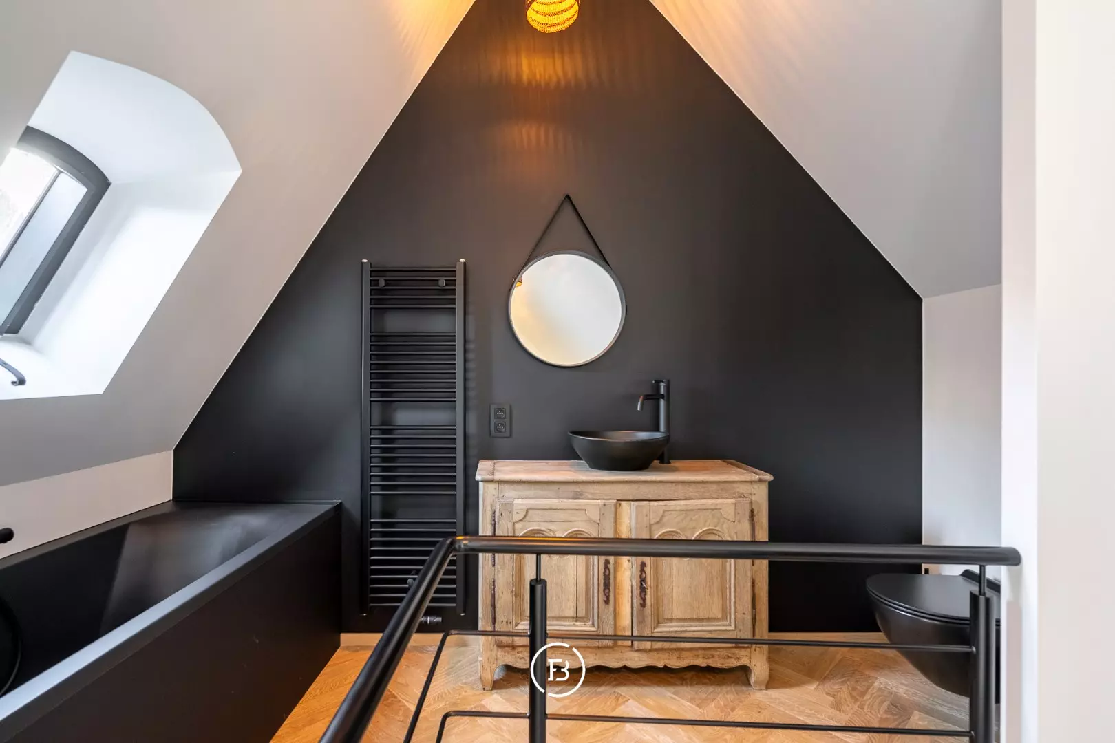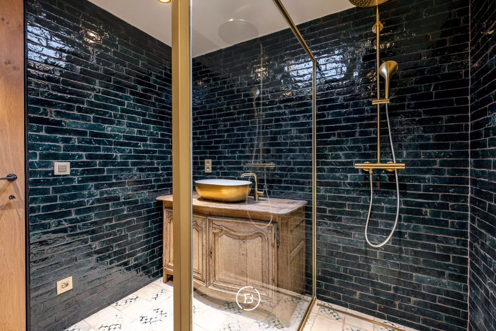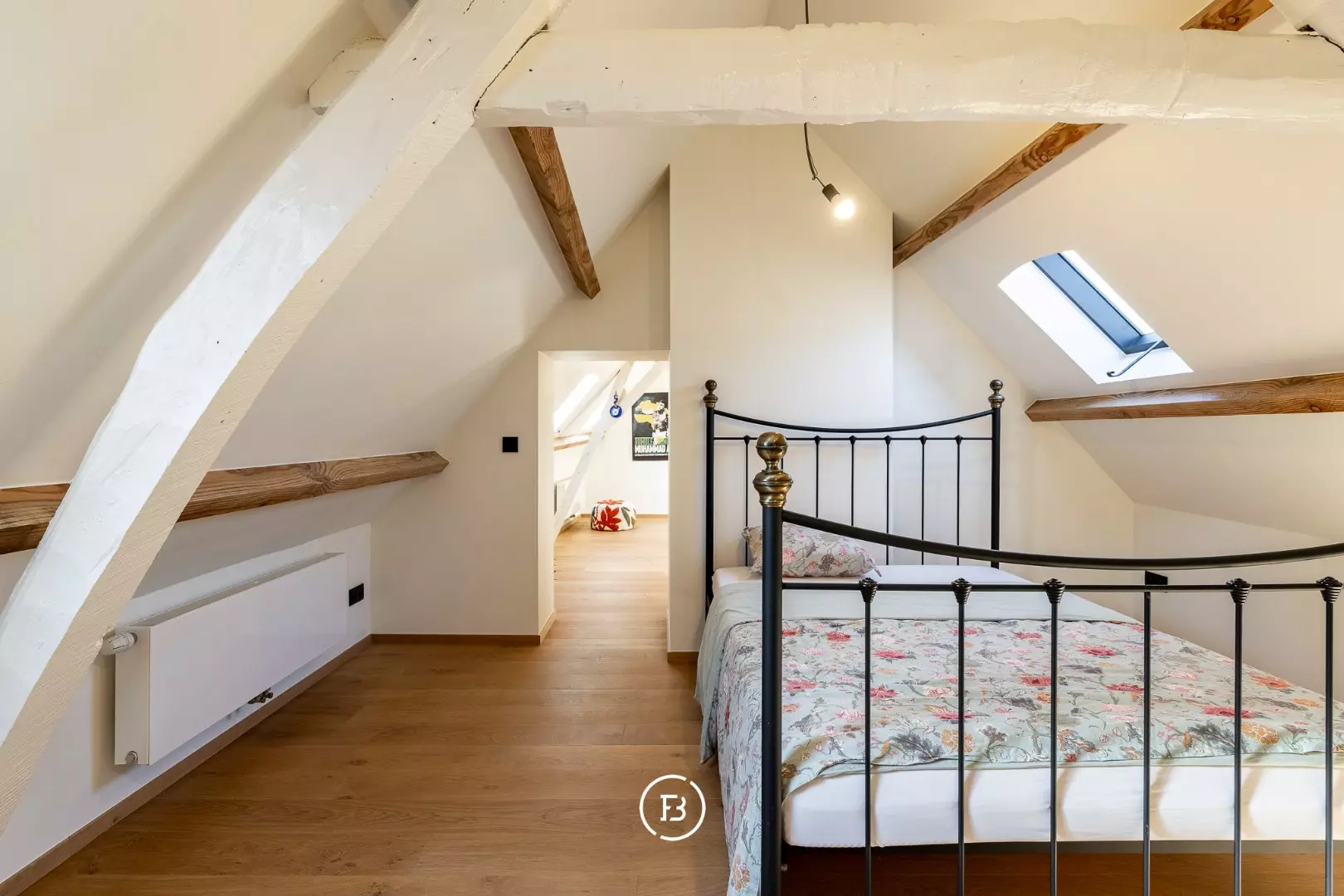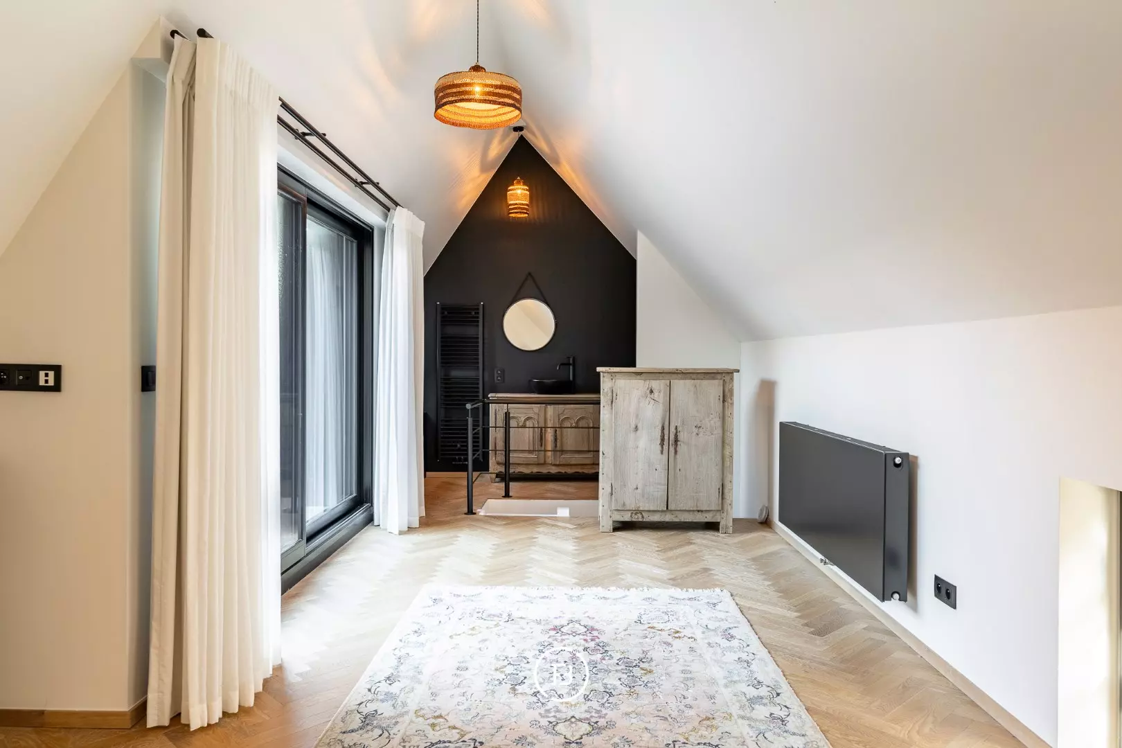 Een extra troef op het gelijkvloers is de karaktervolle voutekamer met houtkachel, perfect als bureau, hobbyruimte of knusse leeshoek. De badkamer is modern afgewerkt en voorzien van een inloopdouche en lavabo.