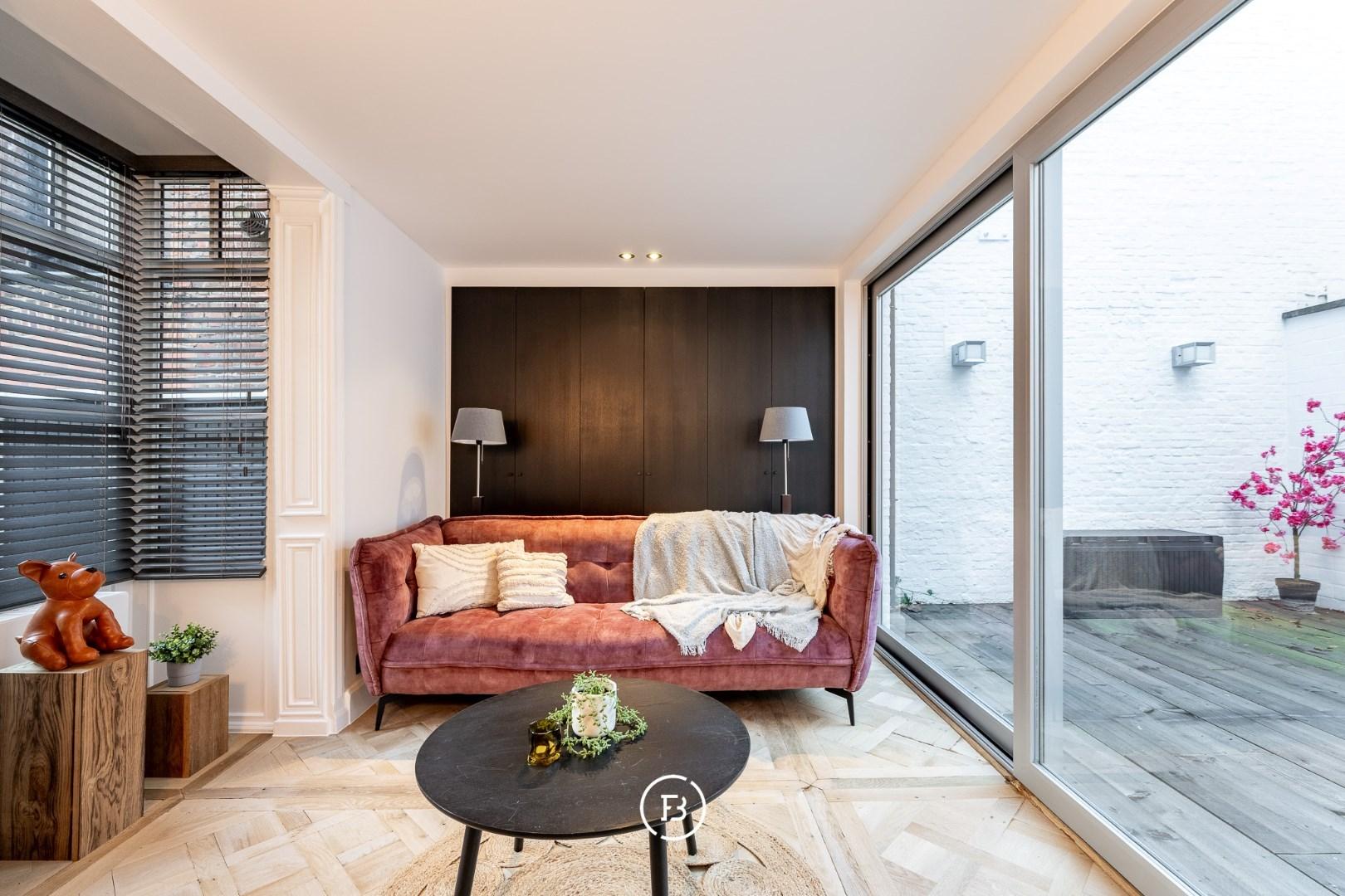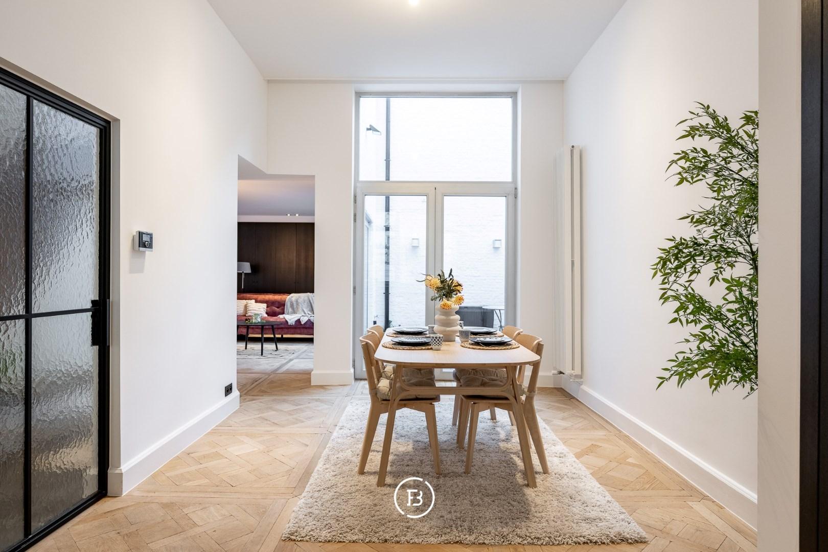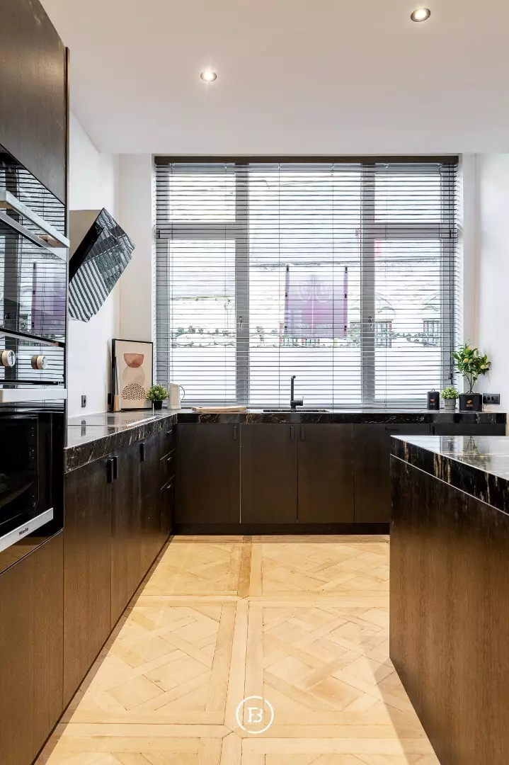 De woning onderging een totaalrenovatie en werd afgewerkt met hoogwaardige materialen, warm houtfineer en oog voor detail. Bij het binnenkomen via de inkomhal betreedt u de lumineuze leefruimte, ingedeeld in een gezellige zitruimte met ingebouwde kasten en een open maatkeuken in eik, afgewerkt met een natuurstenen werkblad en hoogwaardige Miele-toestellen. De grote raampartijen zorgen voor een aangename lichtinval en een directe verbondenheid met het ruime, gezellige terras—een heerlijke buitenruimte in het hart van de stad.