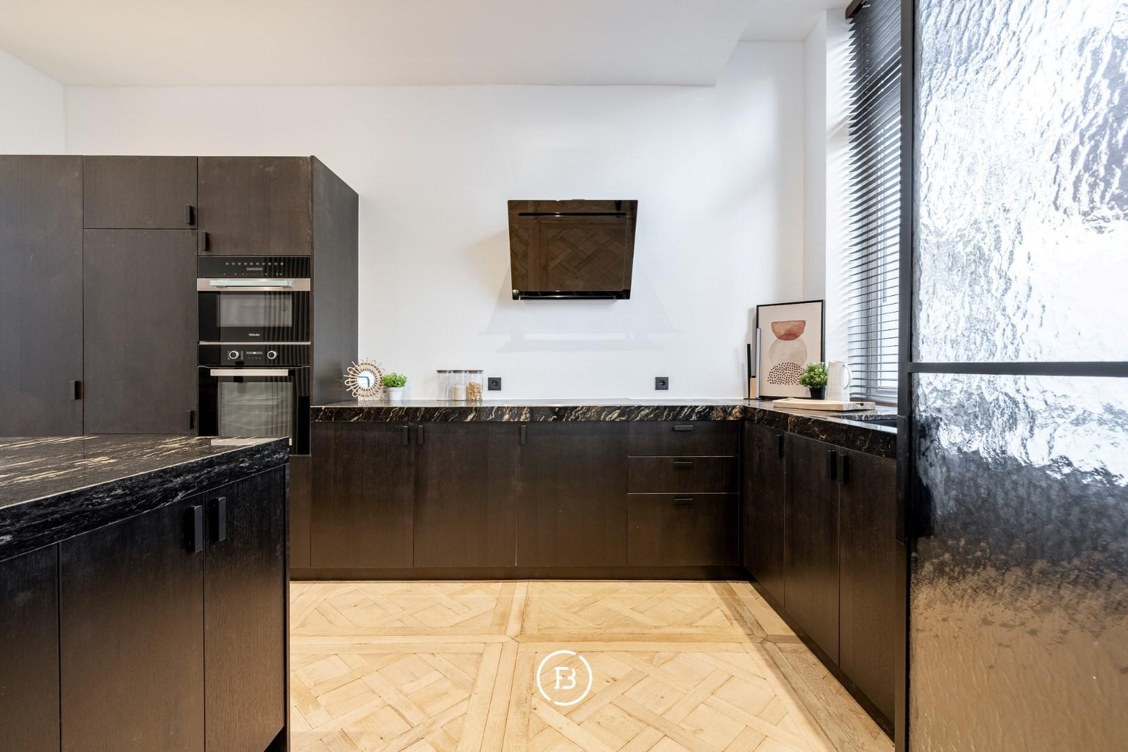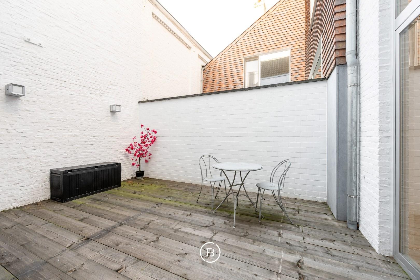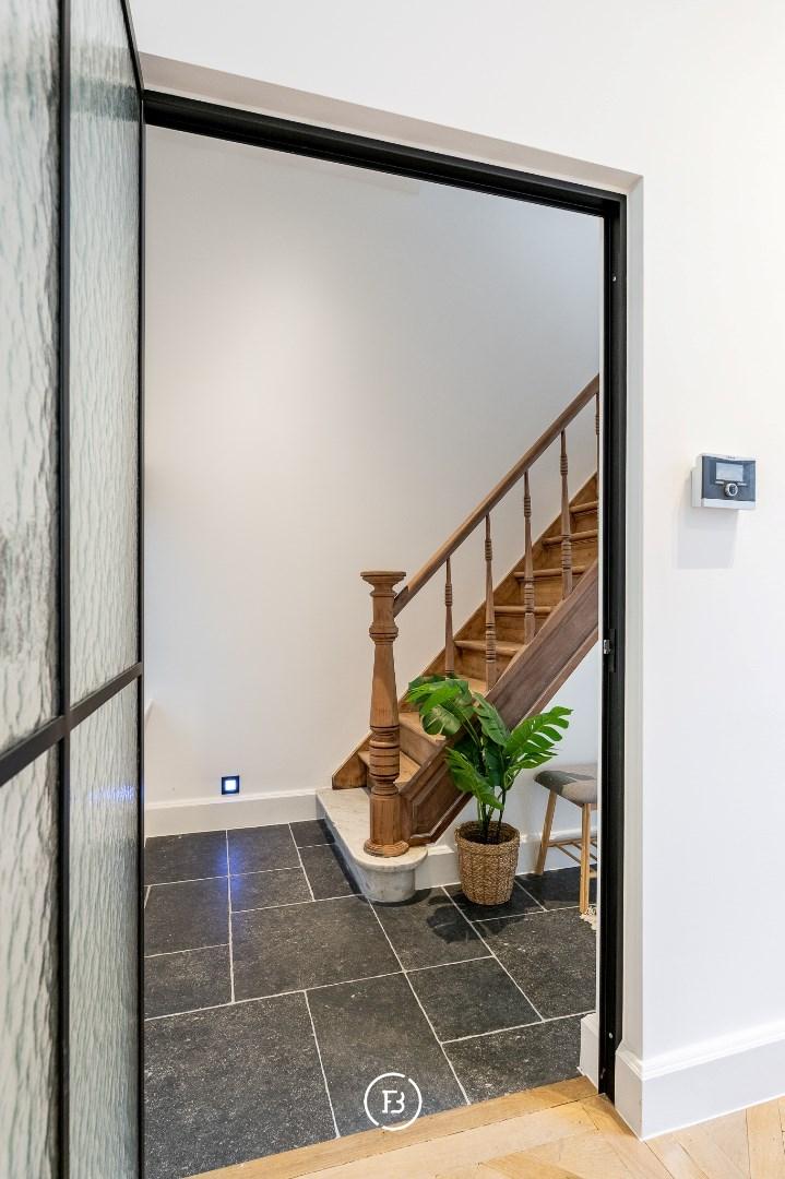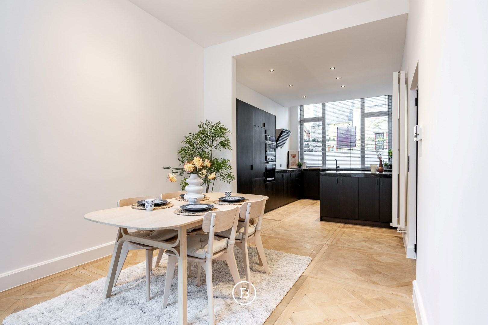 De woning onderging een totaalrenovatie en werd afgewerkt met hoogwaardige materialen, warm houtfineer en oog voor detail. Bij het binnenkomen via de inkomhal betreedt u de lumineuze leefruimte, ingedeeld in een gezellige zitruimte met ingebouwde kasten en een open maatkeuken in eik, afgewerkt met een natuurstenen werkblad en hoogwaardige Miele-toestellen. De grote raampartijen zorgen voor een aangename lichtinval en een directe verbondenheid met het ruime, gezellige terras—een heerlijke buitenruimte in het hart van de stad.