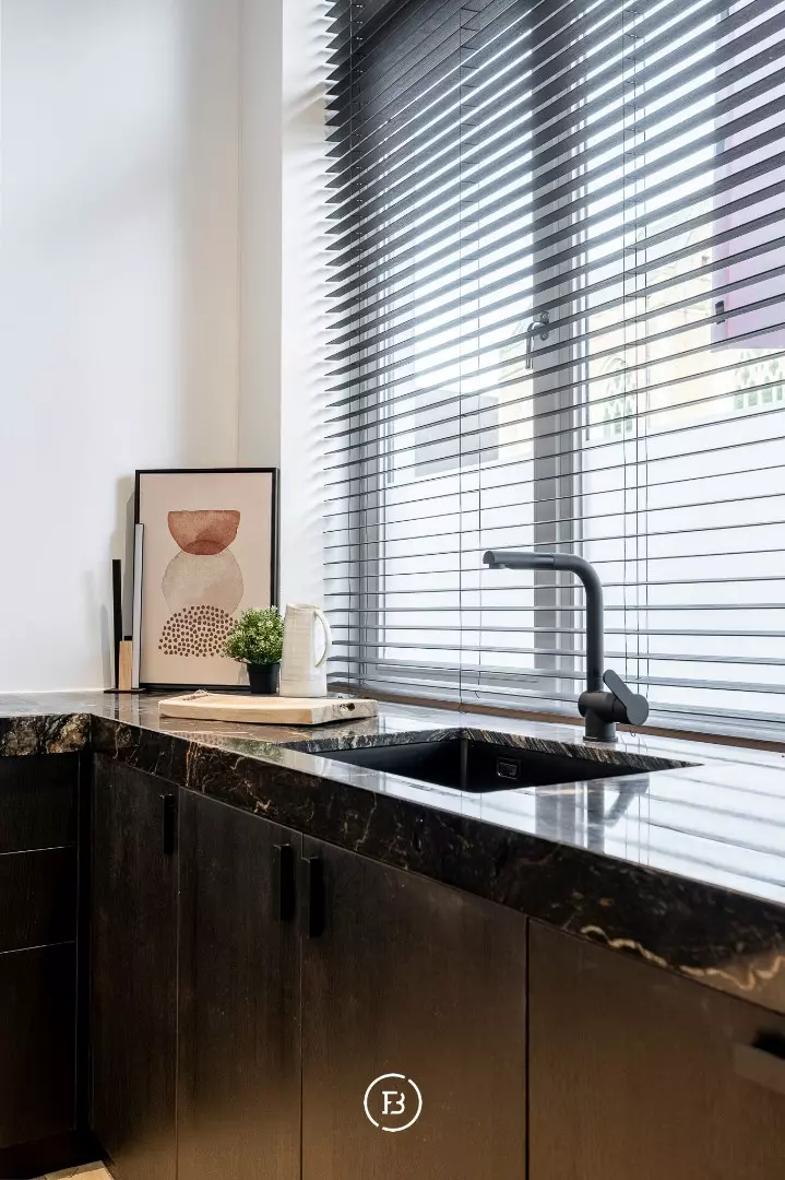 De woning is bovendien volledig uitgerust met kwalitatieve armaturen, lamellen, maatwerkkasten in houtfineer en beschikt over een praktische kelder.