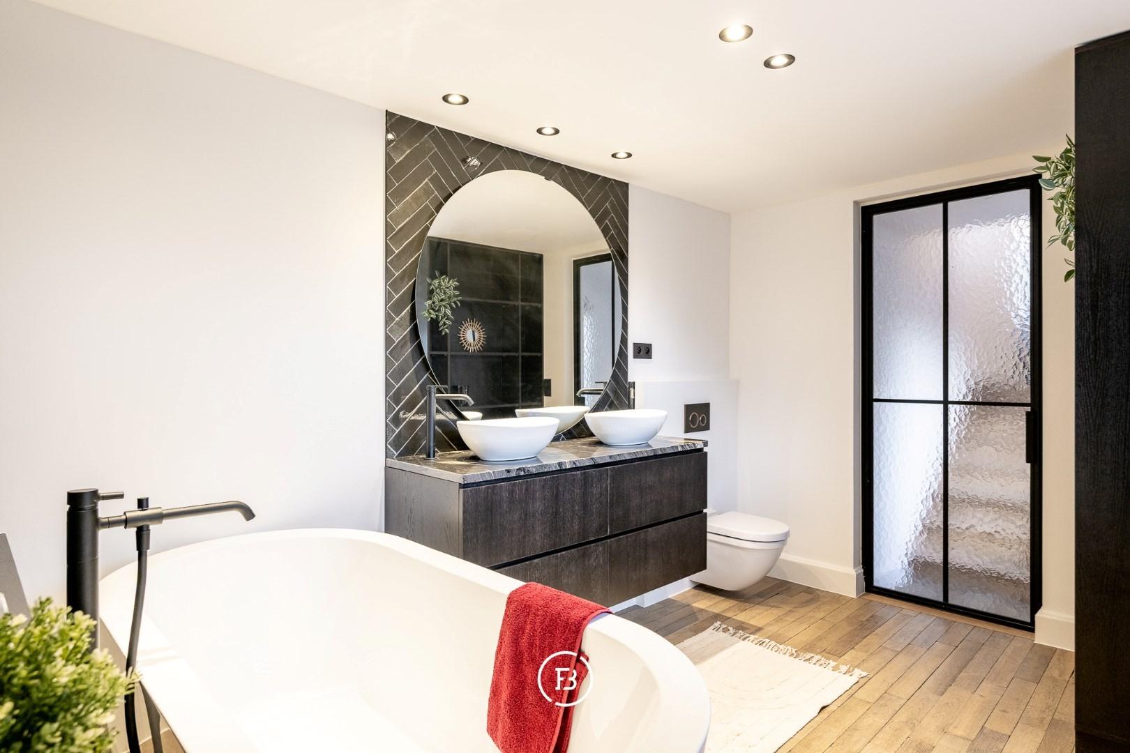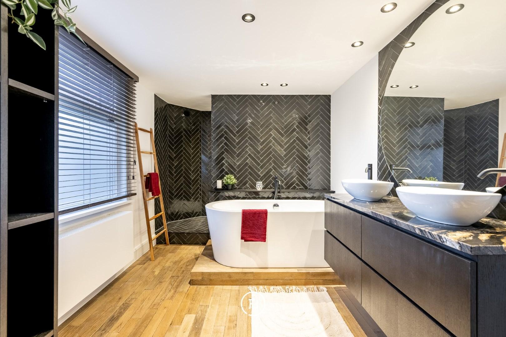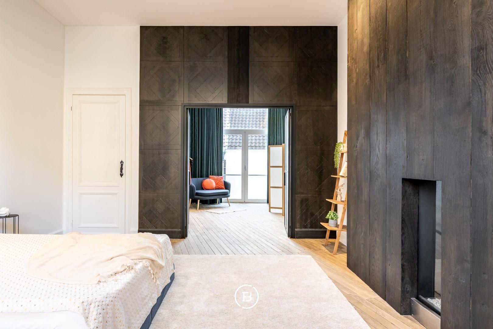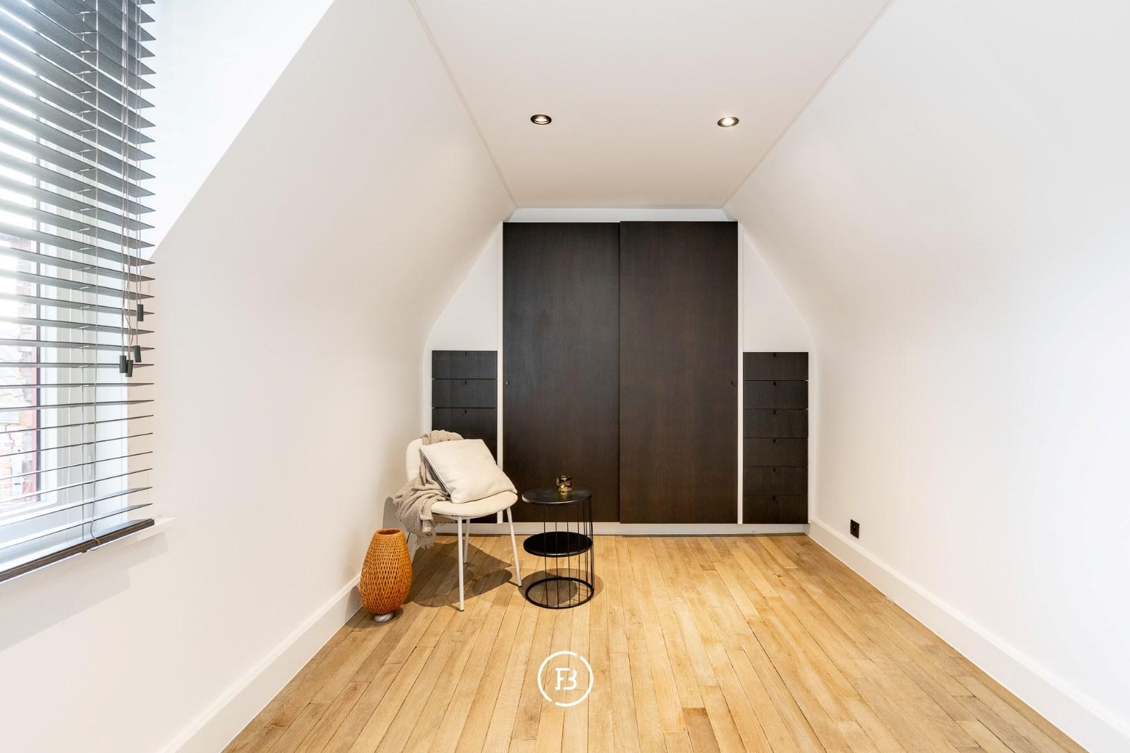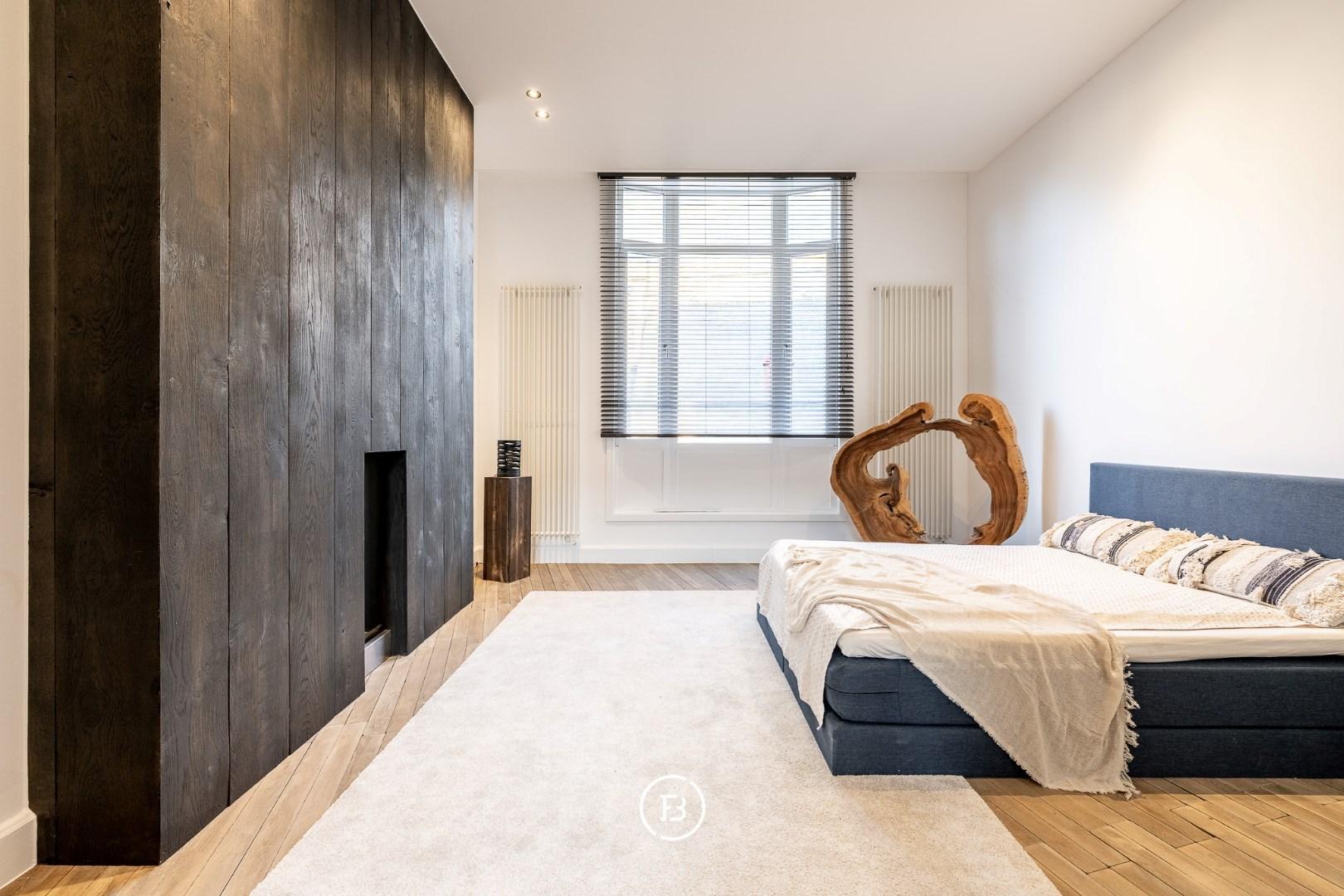 Op de verdiepingen bevindt zich een royale masterbedroom met gashaard, die een warme en luxe sfeer creëert. De ruime badkamer is uitgerust met een ligbad, een dubbel lavabomeubel en een inloopdouche. Verder zijn er een tweede slaapkamer met lavabo, een derde slaapkamer en helemaal boven een vierde kamer die perfect dienstdoet als slaapkamer of bureau.