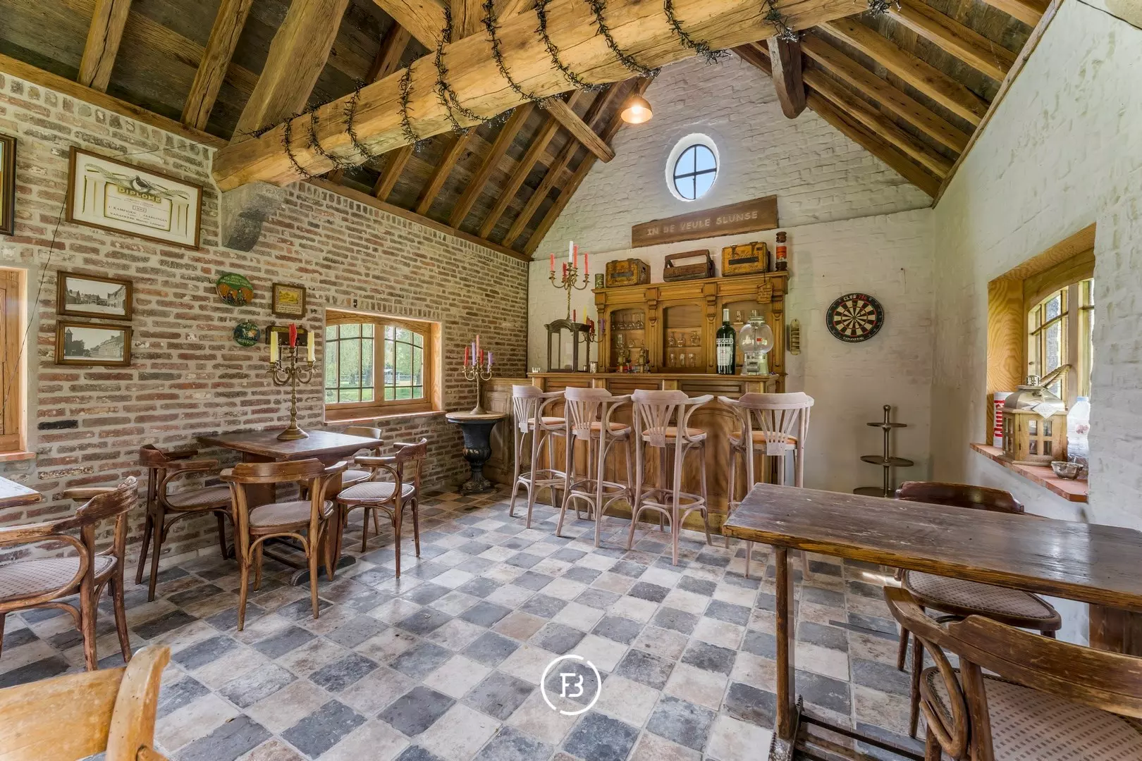 Naast het woongedeelte beschikt het landgoed over twee schuren en een sfeervolle bar. Eén van de schuren is momenteel ingericht als feestzaal, terwijl de andere gebruikt kan worden als opslagruimte of garage voor voertuigen. Voor paardenliefhebbers is dit domein een absolute droom, met een professionele piste en zes paardenboxen die uitermate geschikt zijn voor het houden en trainen van paarden.