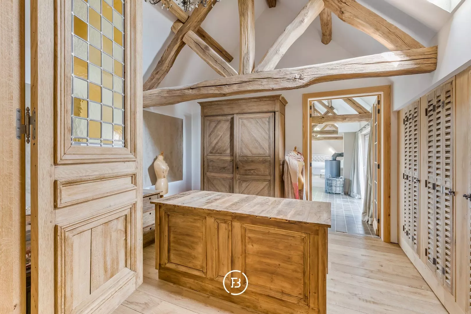 Op de eerste verdieping bevinden zich zes slaapkamers en twee badkamers. De master bedroom straalt luxe uit met een doorloopdressing, een ensuite badkamer met inloopdouche en ligbad, en een gezellige zitruimte rondom een draaibare houtkachel. Deze kamer geeft bovendien toegang tot een privéterras waar u kunt genieten van het uitzicht over de uitgestrekte omgeving.