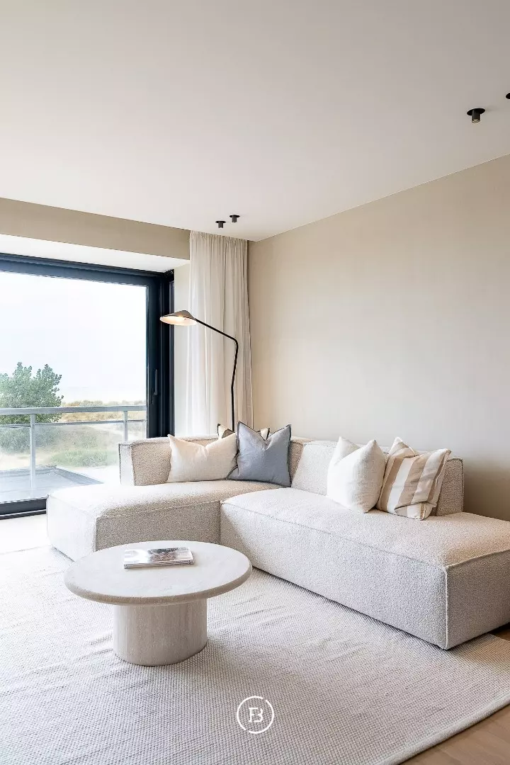 De brede gevel zorgt voor een prachtig uitzicht op zee en duinen vanuit de lichtrijke leefruimte met open keuken, zithoek en eethoek. Verder bestaat het appartement uit 2 ruime slaapkamers, elk met eigen douchekamer en dressing. Beide slaapkamers hebben directe toegang tot het zonnige, zuidgeoriënteerd terras. De derde kamer kan zowel dienst doen als bureau of als derde slaapkamer.